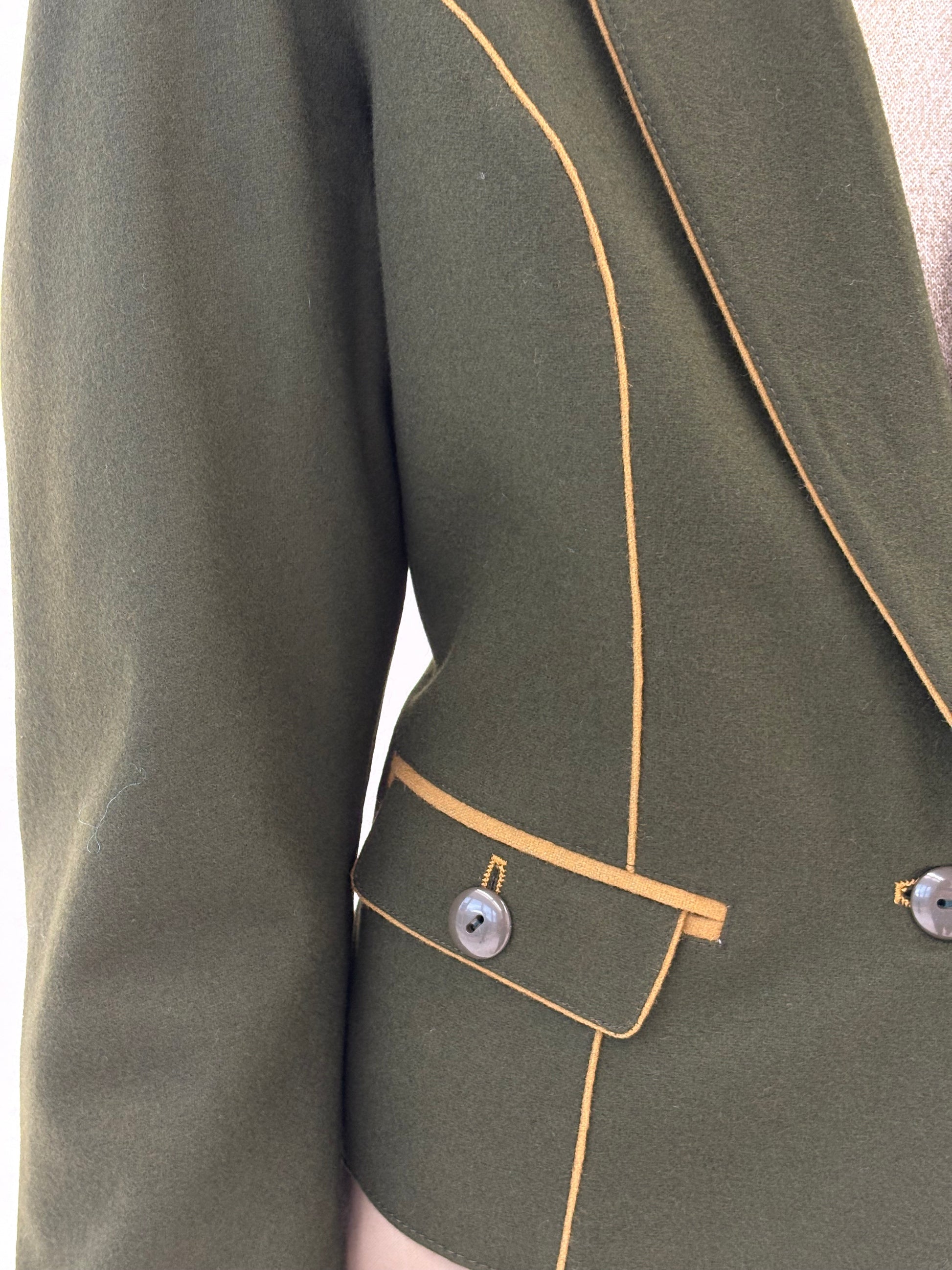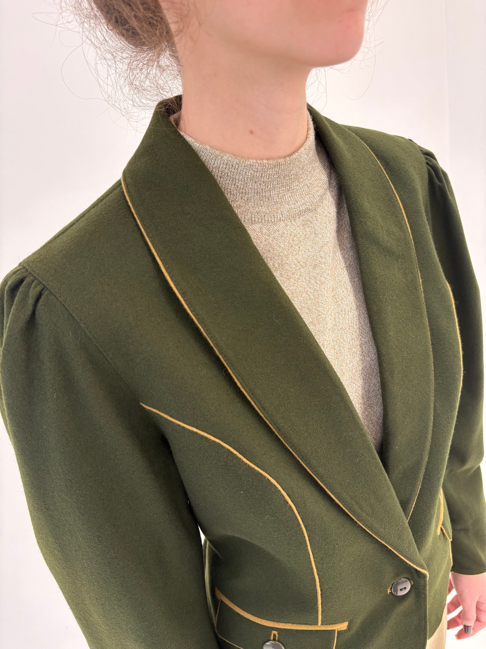 Sacou vintage cambrat forest green cu umeri ușor bufanți 80% lana