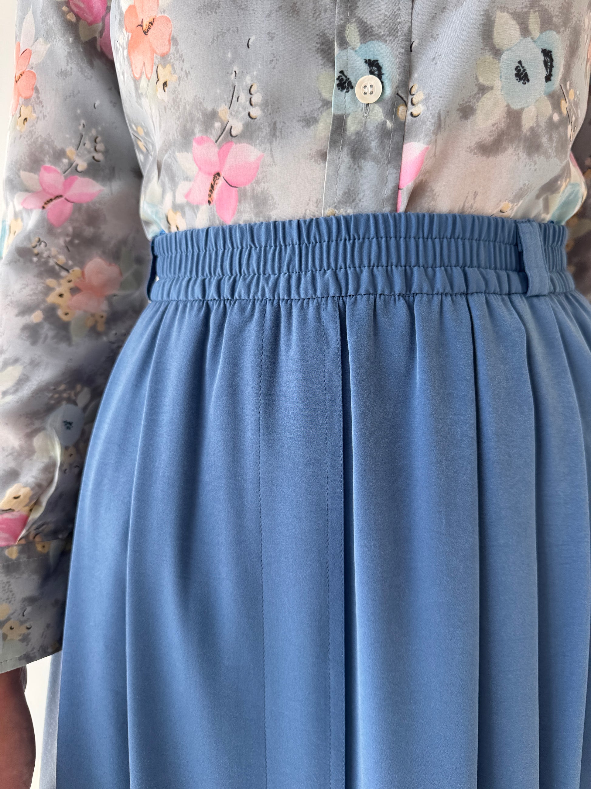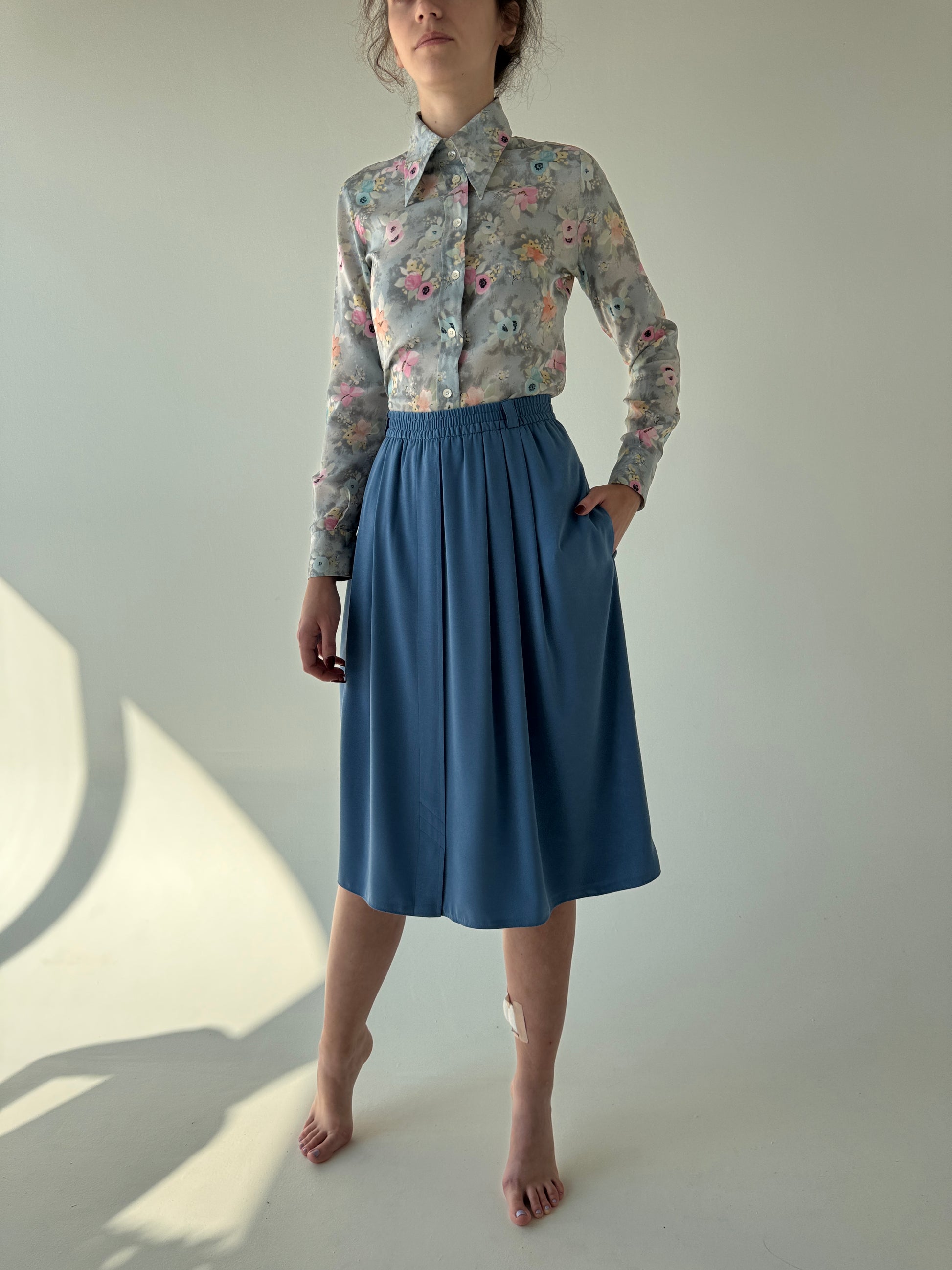 Fustă vinatge albastru ciel cu aspect ușor de piele întoarsă și buzunare