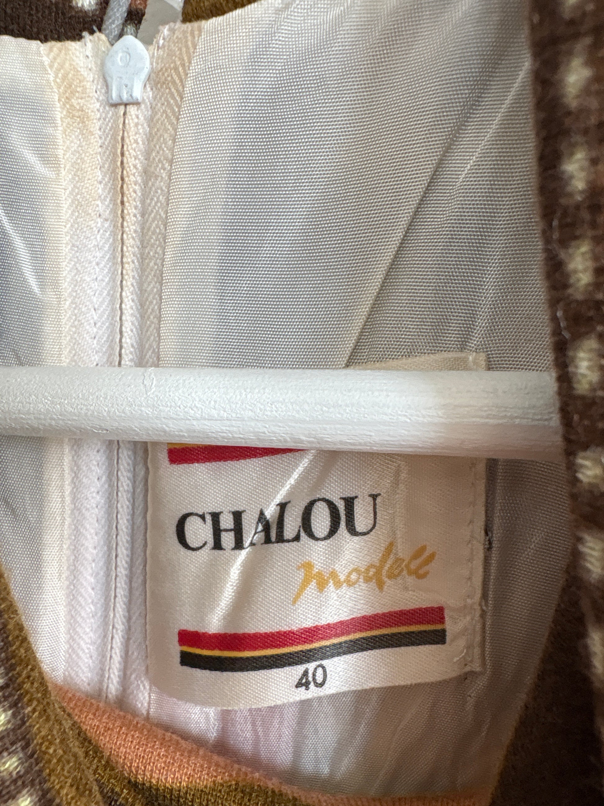 – Rochia este marca germană Chalou Model, eticheta cu font simplu și tricolorul german plasat în partea de jos este specifică anilor 1970