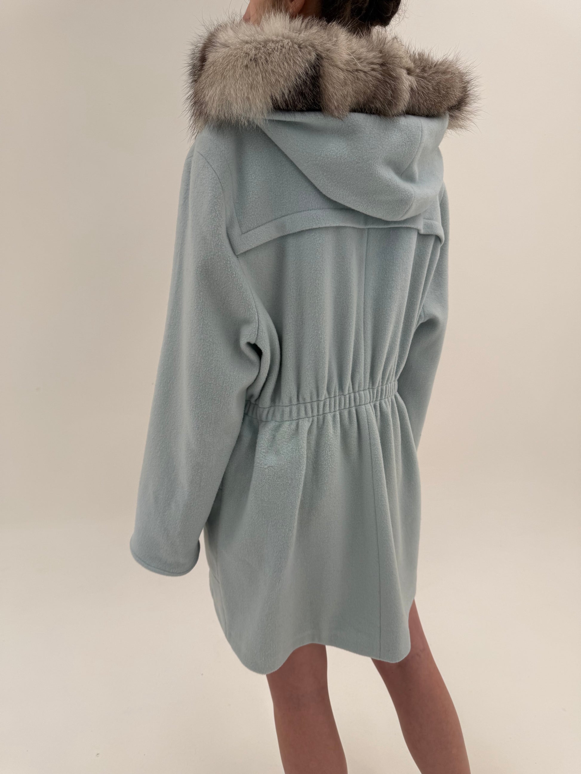 Parka vintage baby blue cu blană de vulpe argintie din lana excepțională