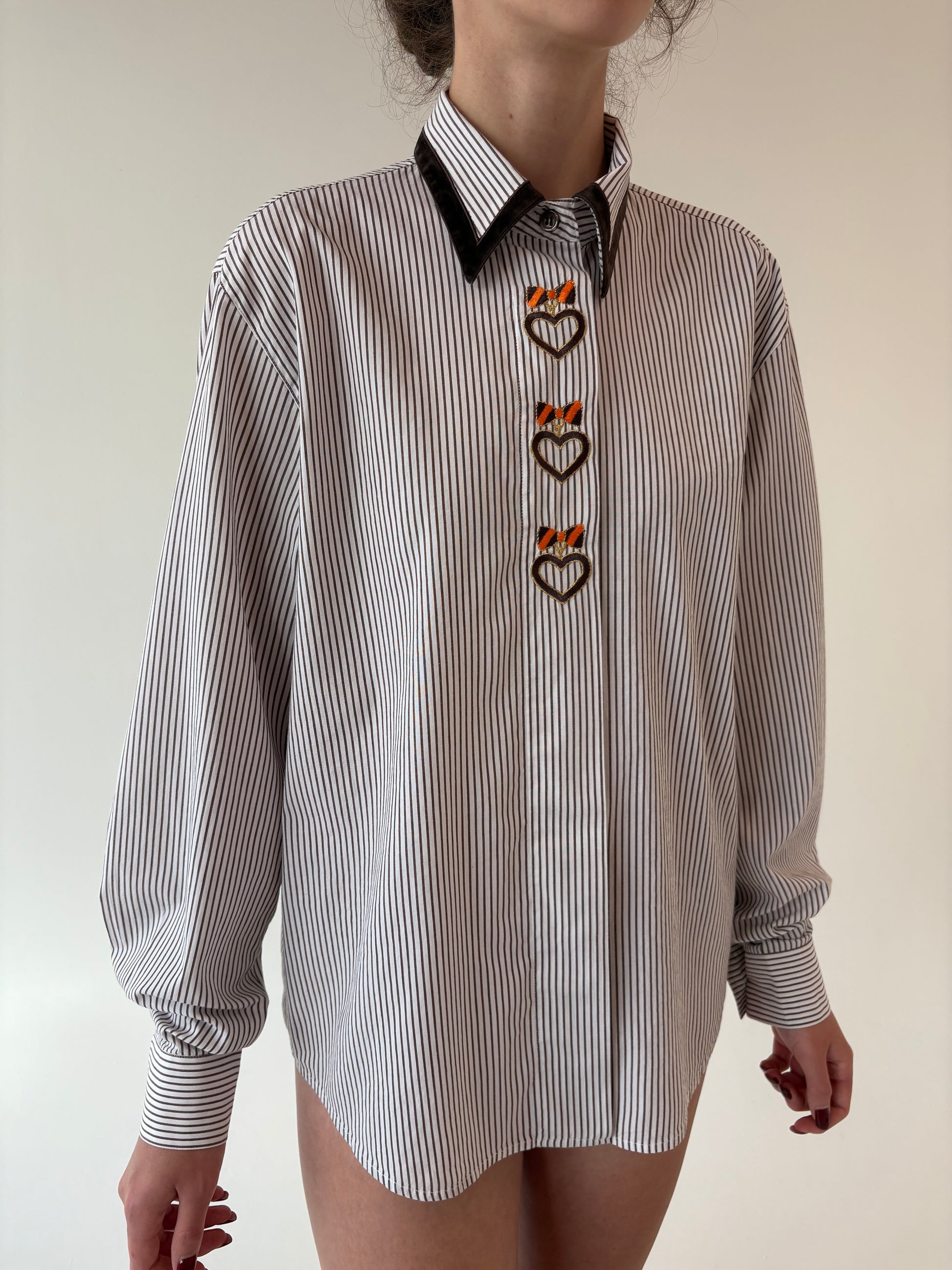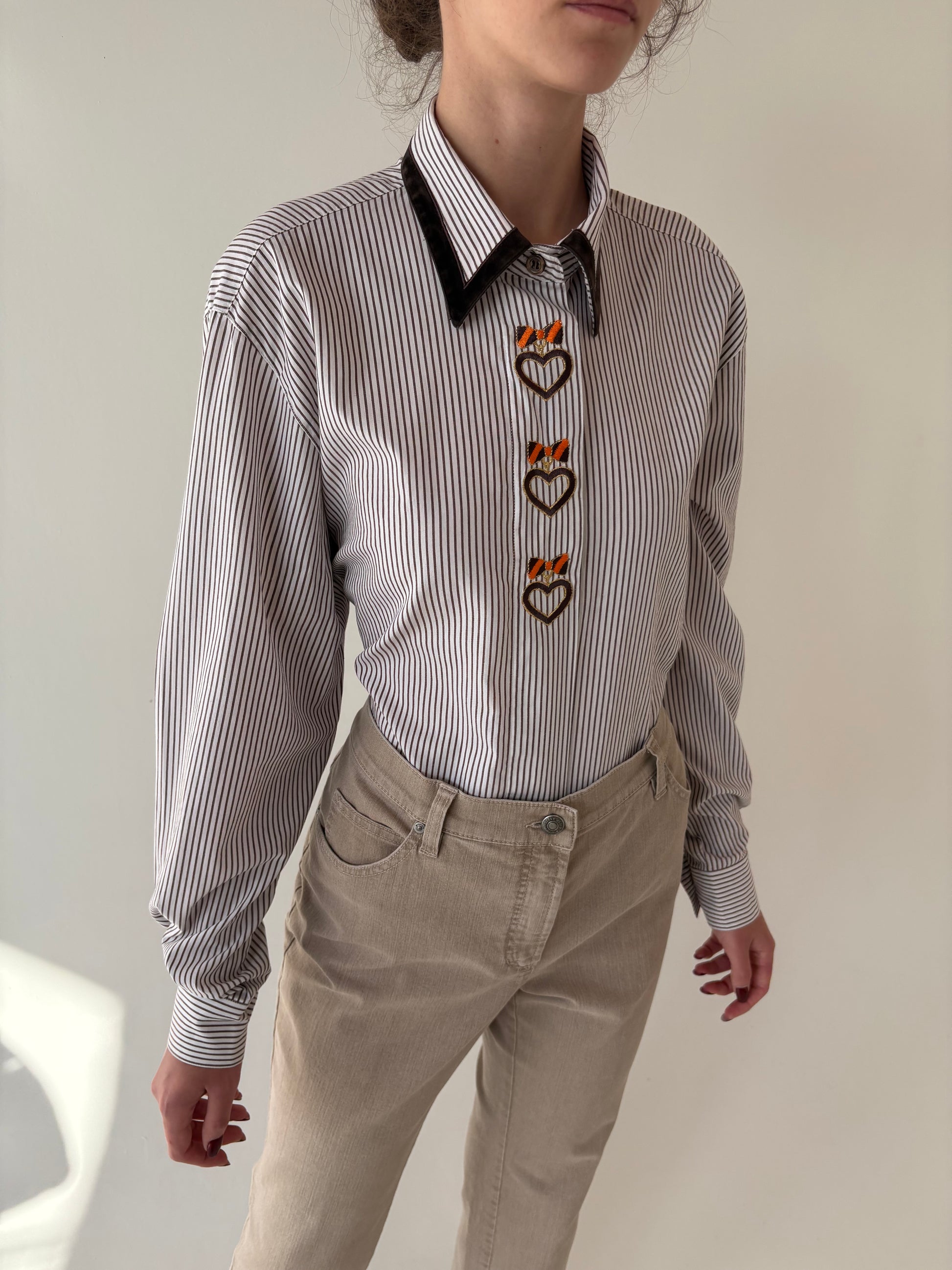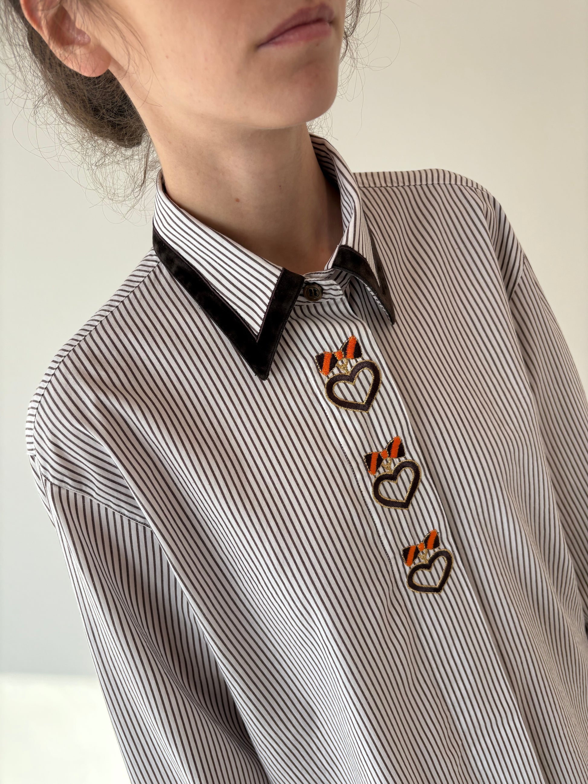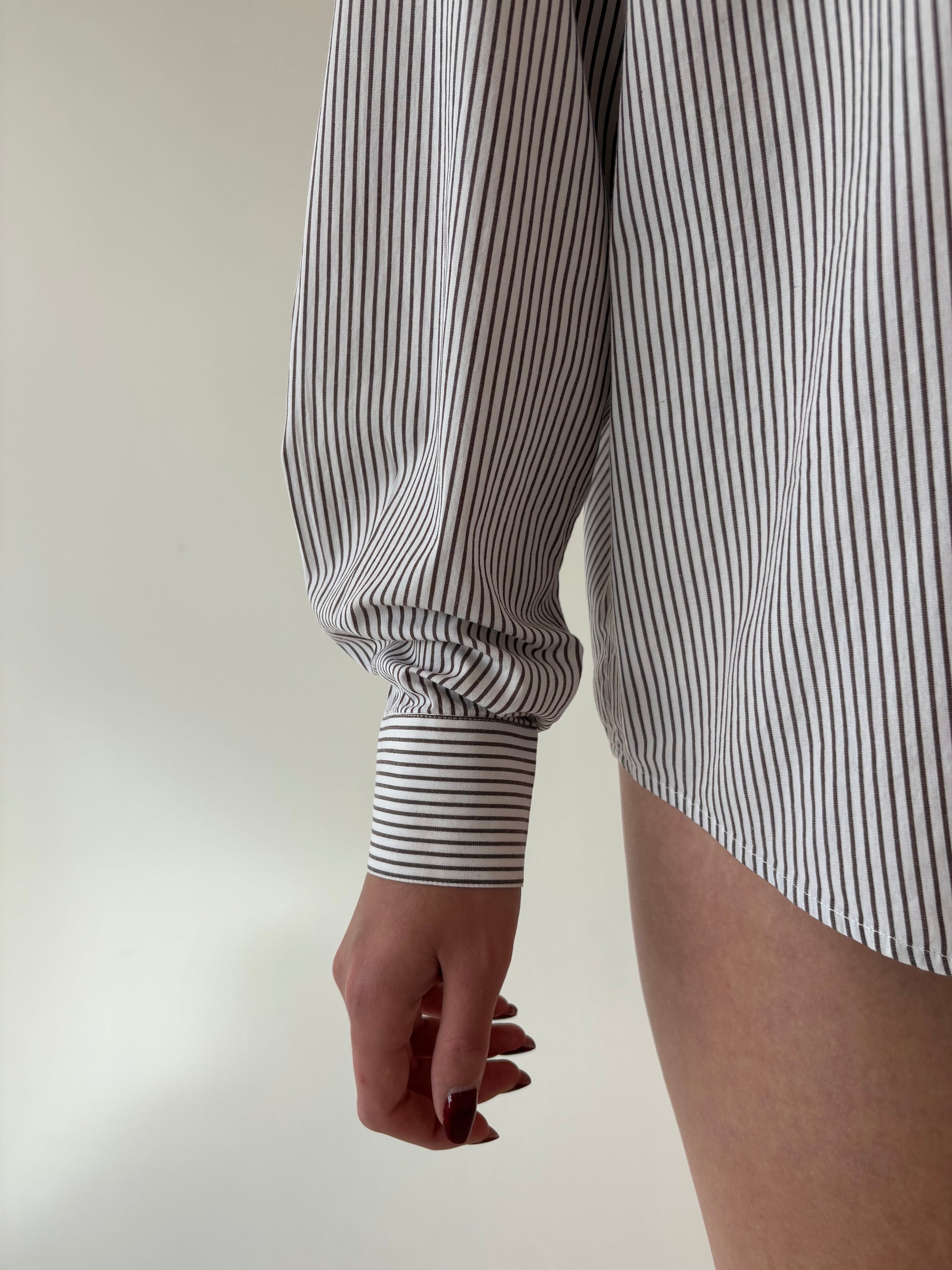 Cămașa premium italiană cu dungi fine chocolate brown și broderie