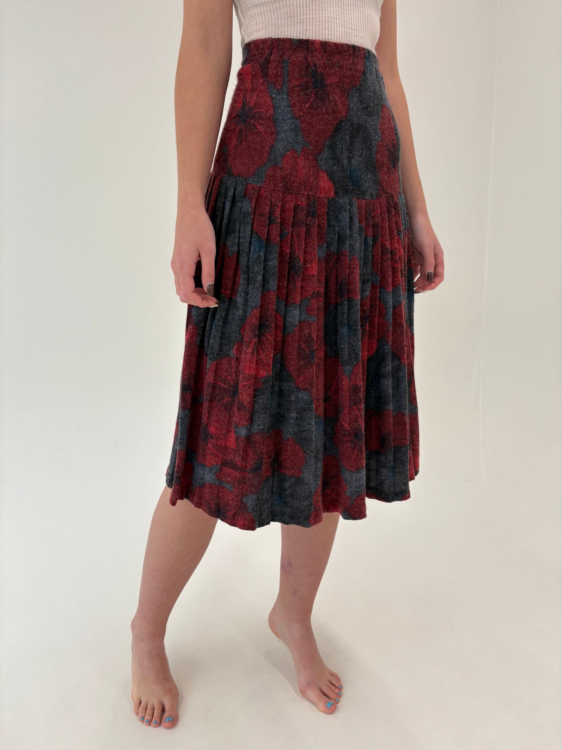Fustă vintage plisată din tricot de lana extrafina cu print floral dark red