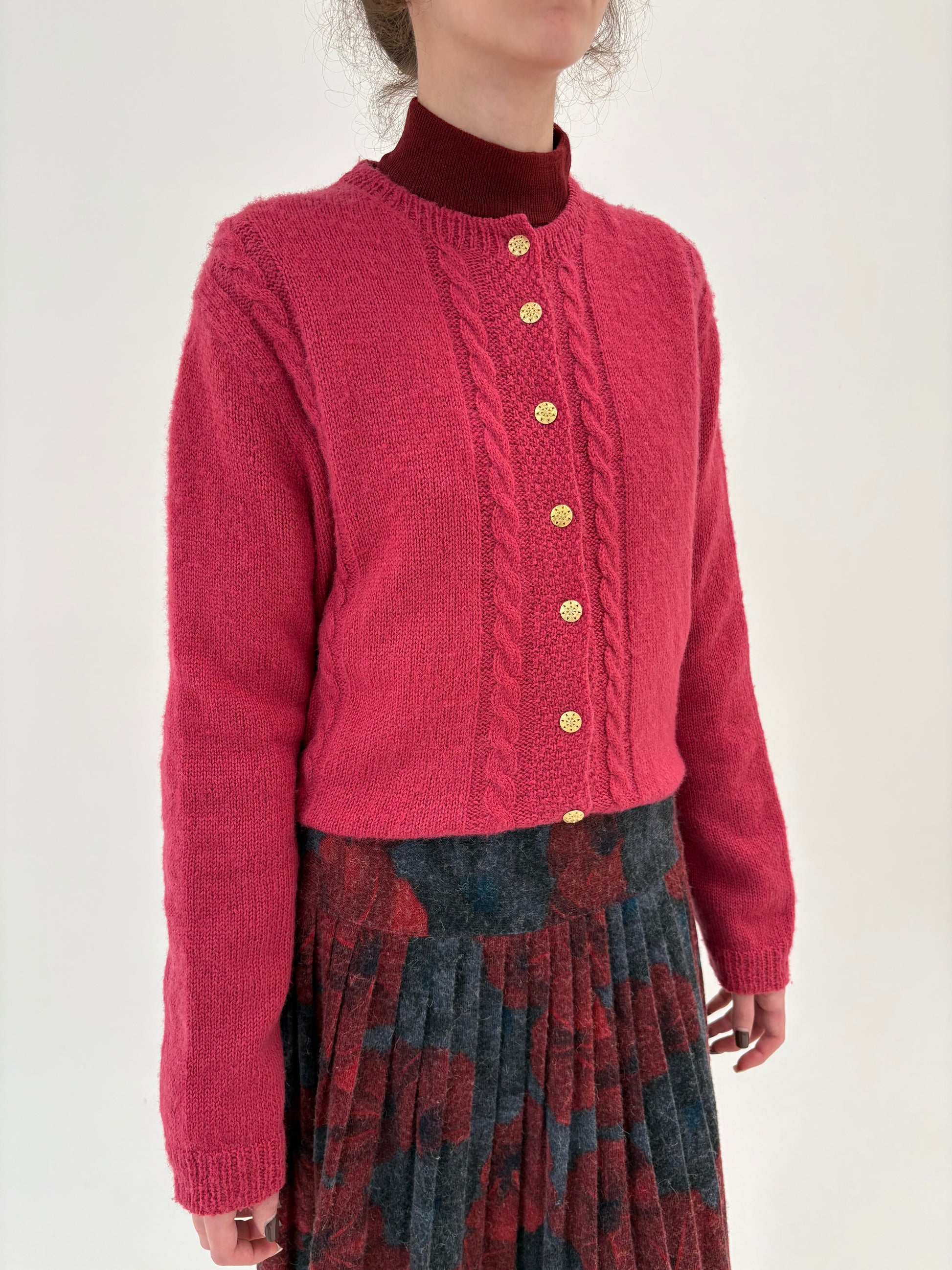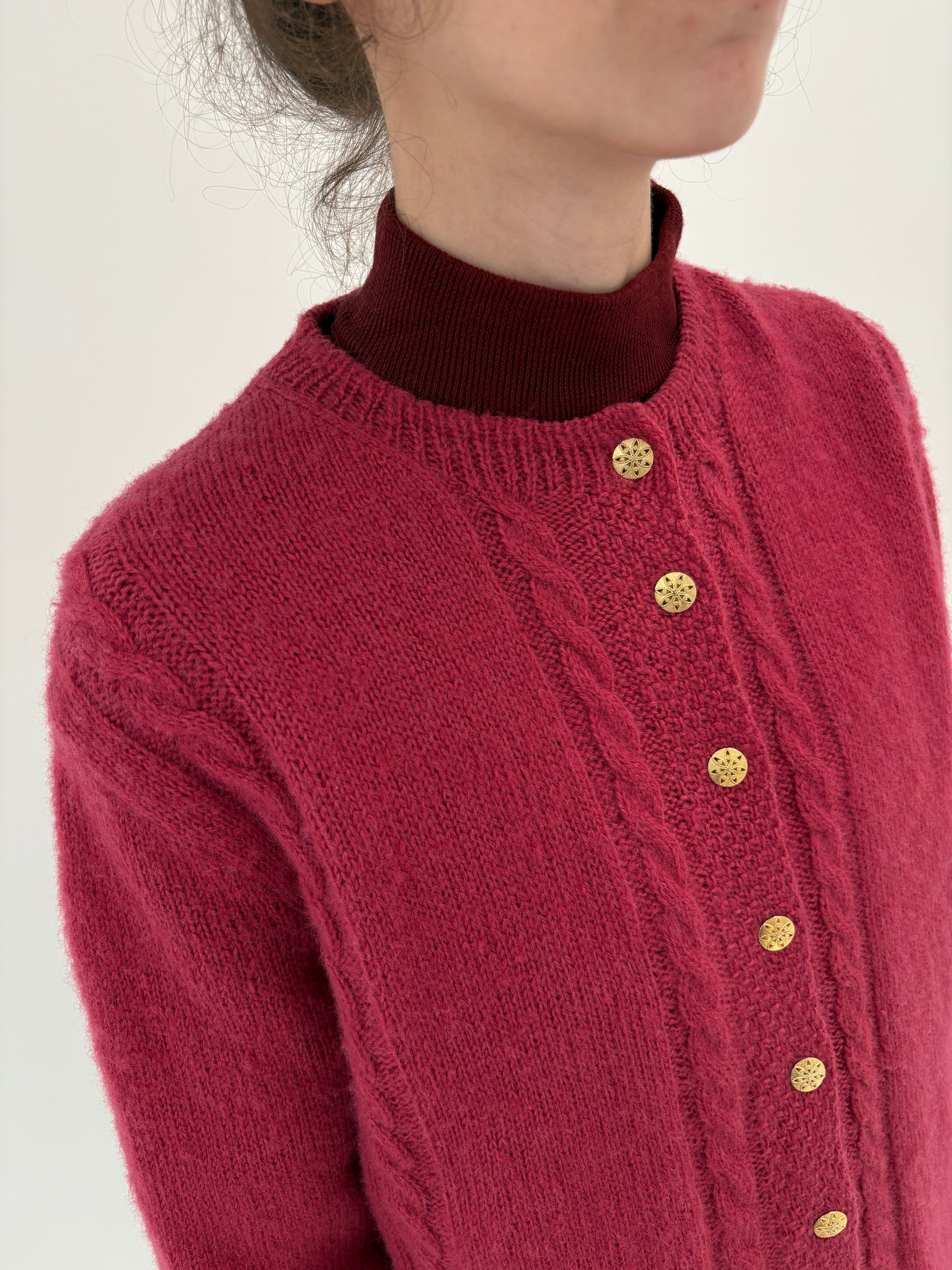 Cardigan gros raspberry red din lana extrafina cu torsade