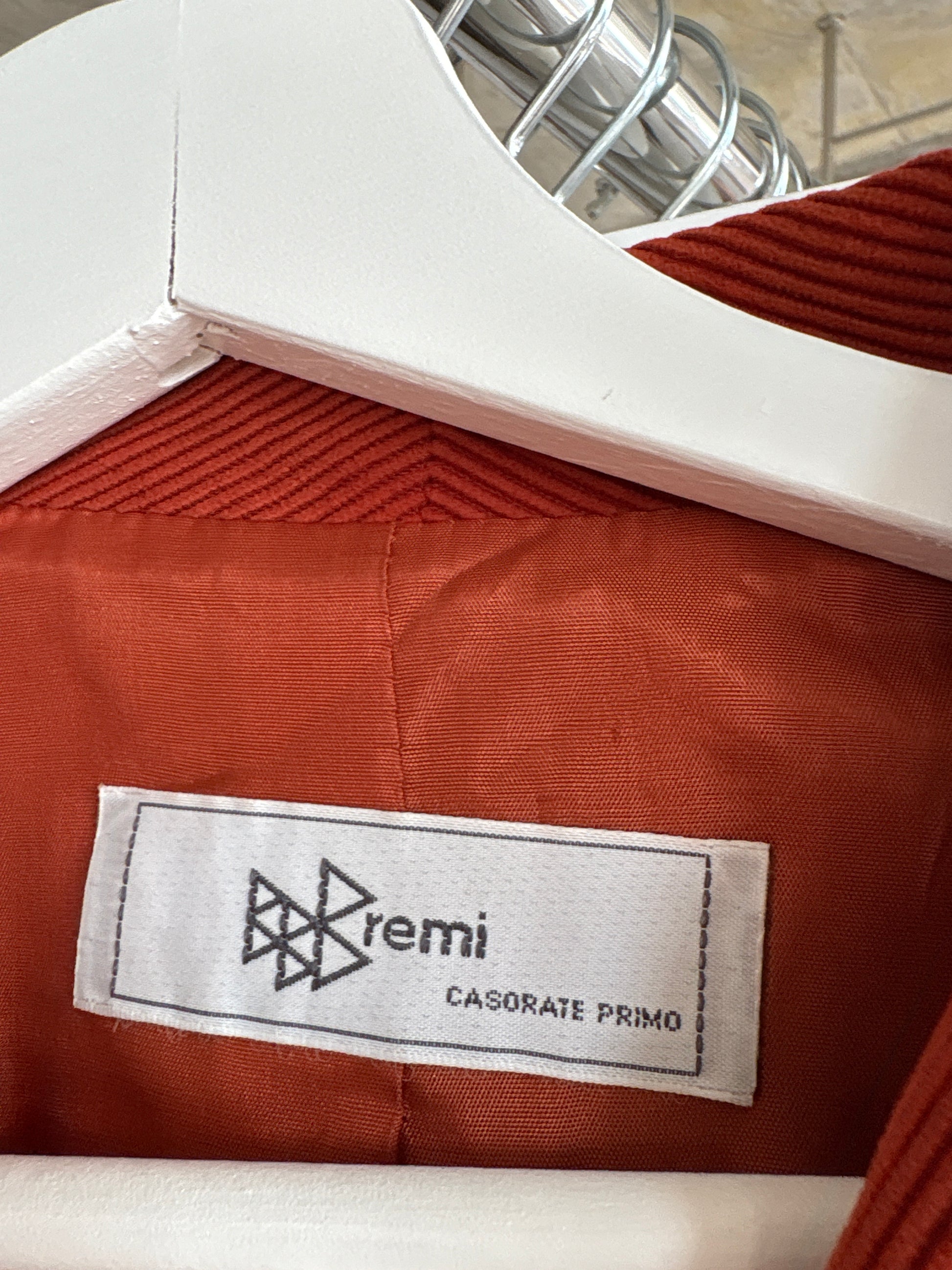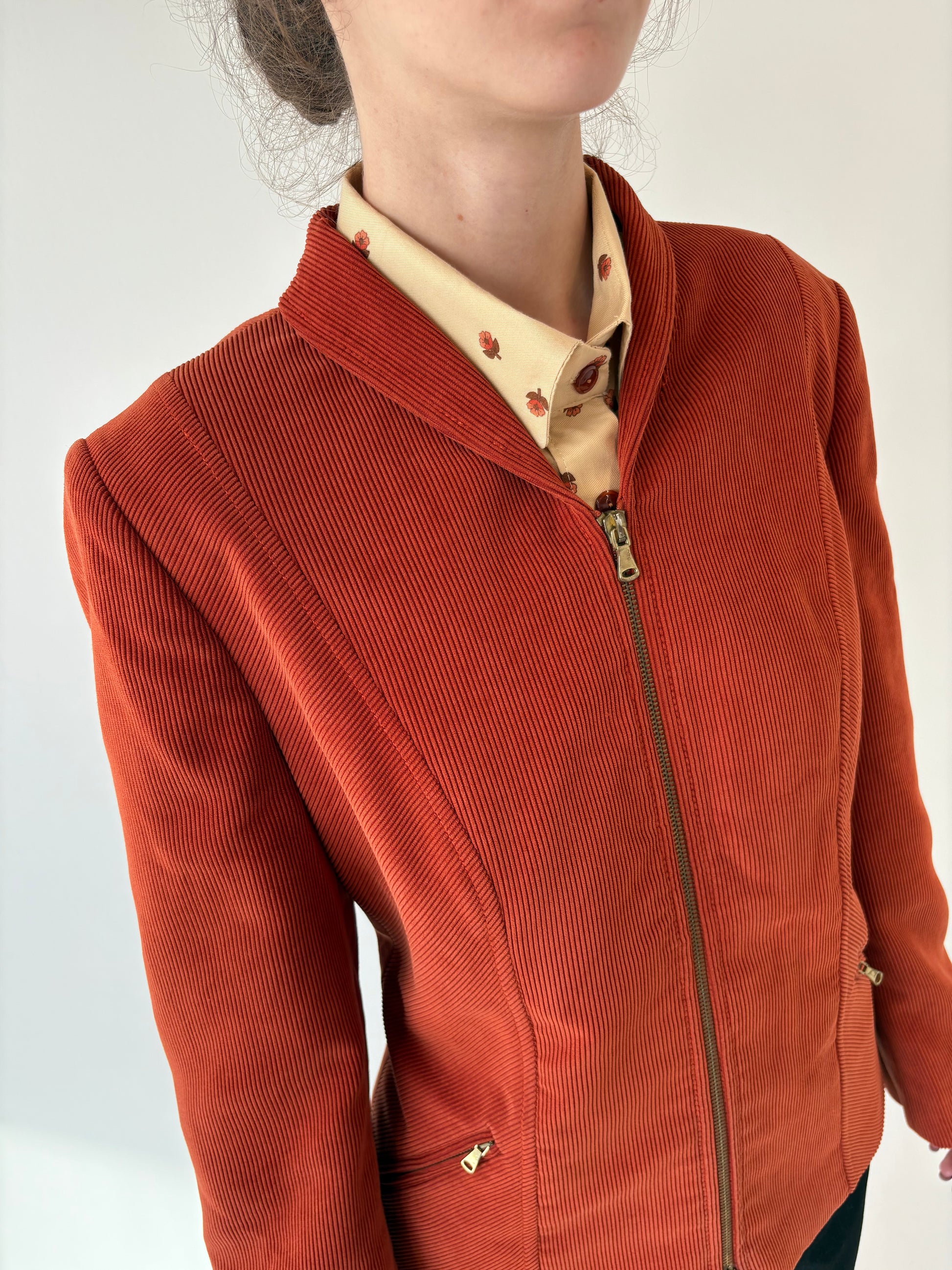 Sacou din corduroy brick red cu influențe caudal și în croi ușor cambrat