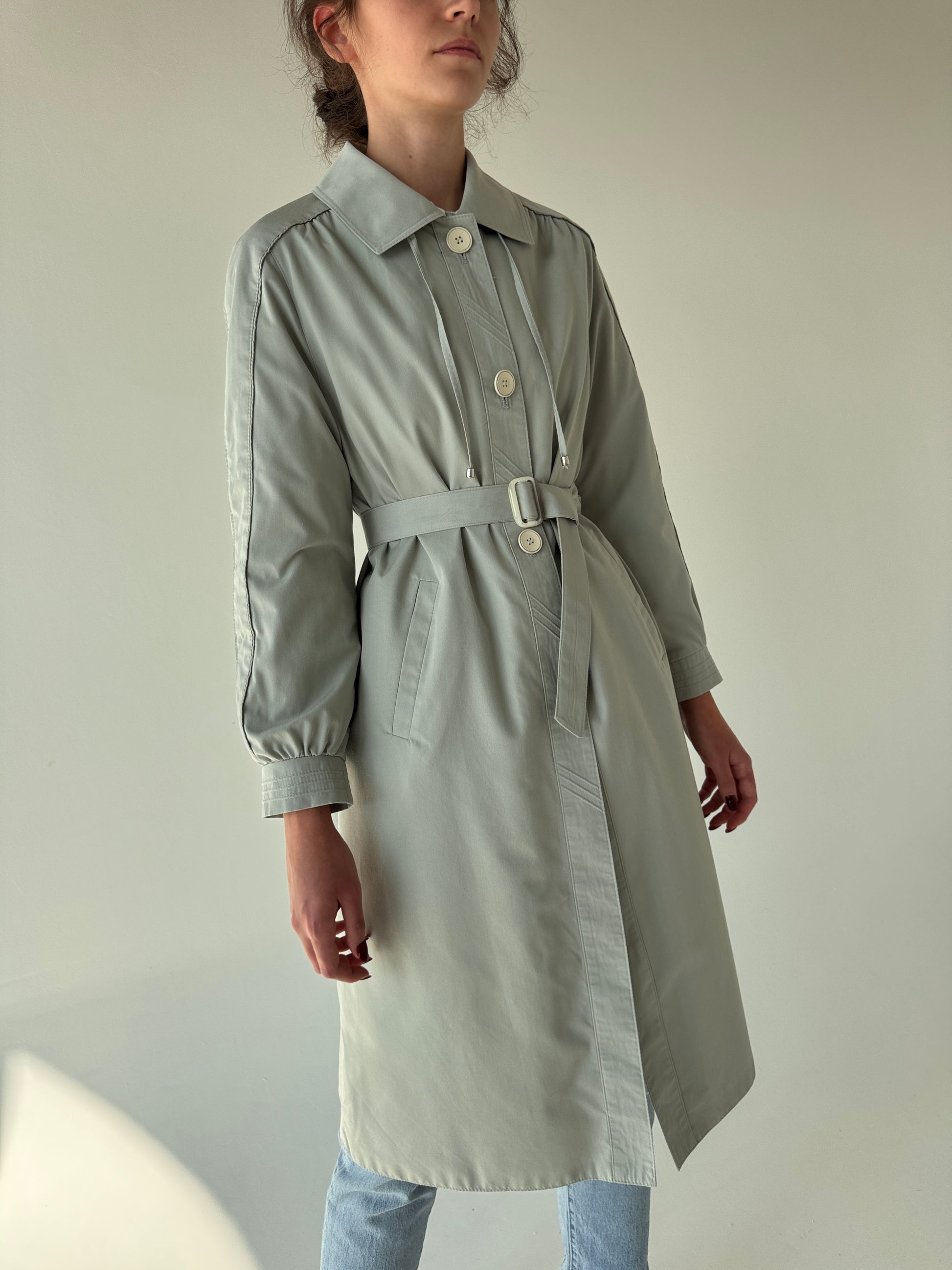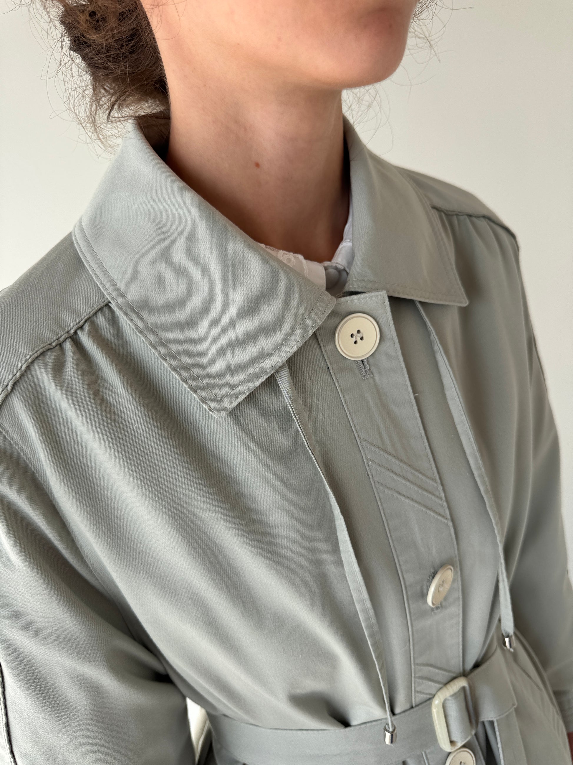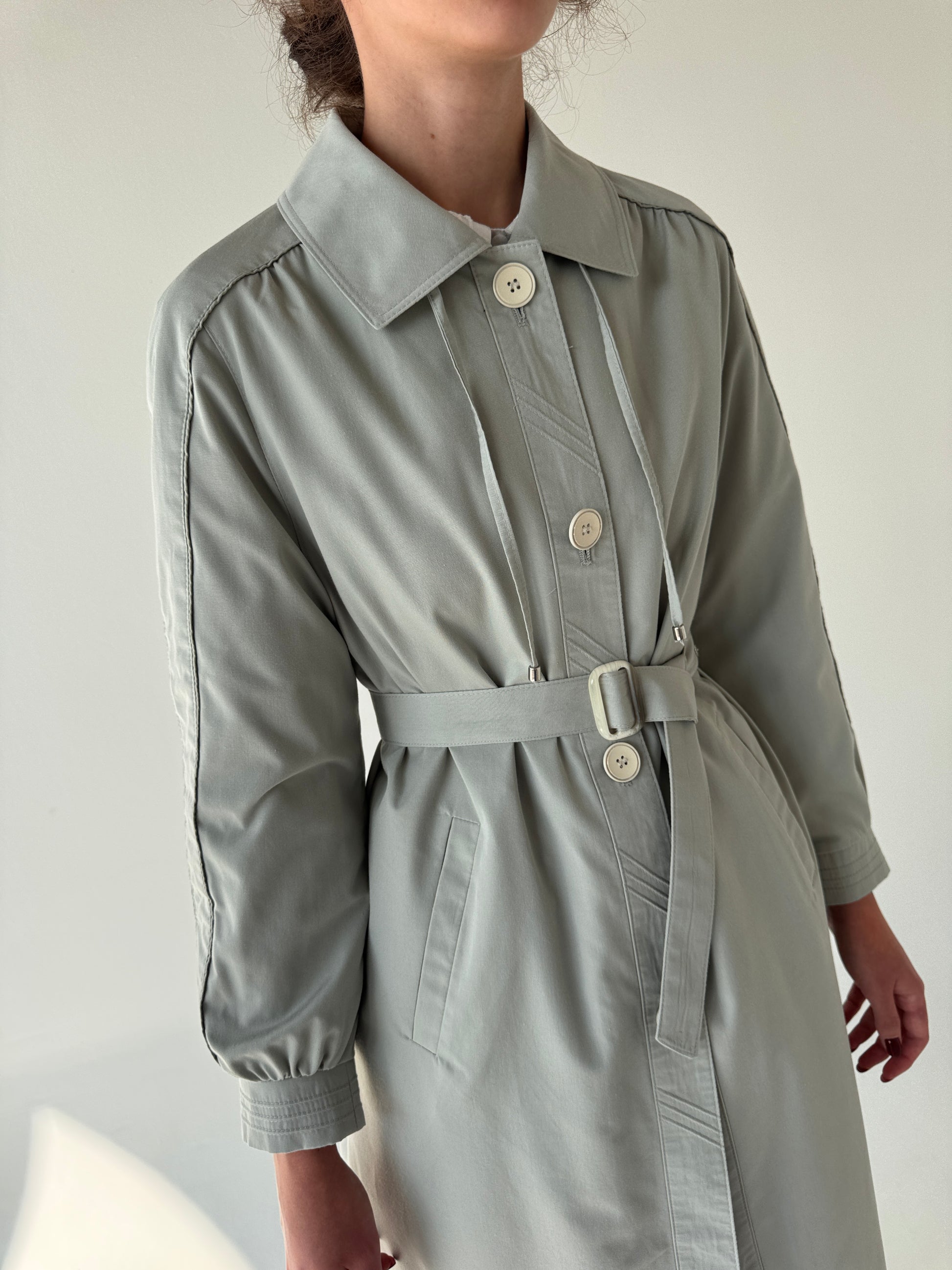 Nasturii mari din plastic ivoire și cureaua cu cataramă învelită în același material sunt elemente definitorii pentru trenchurile de la finalul anilor 70 și începutul anilor 80