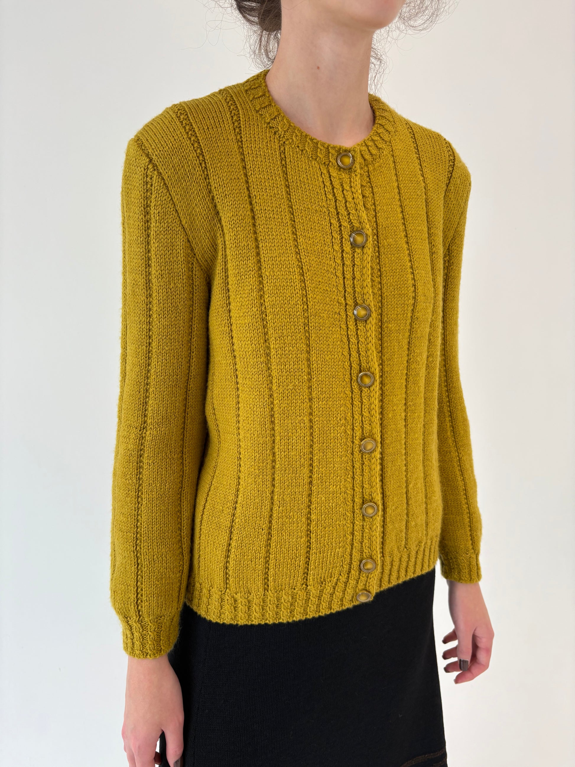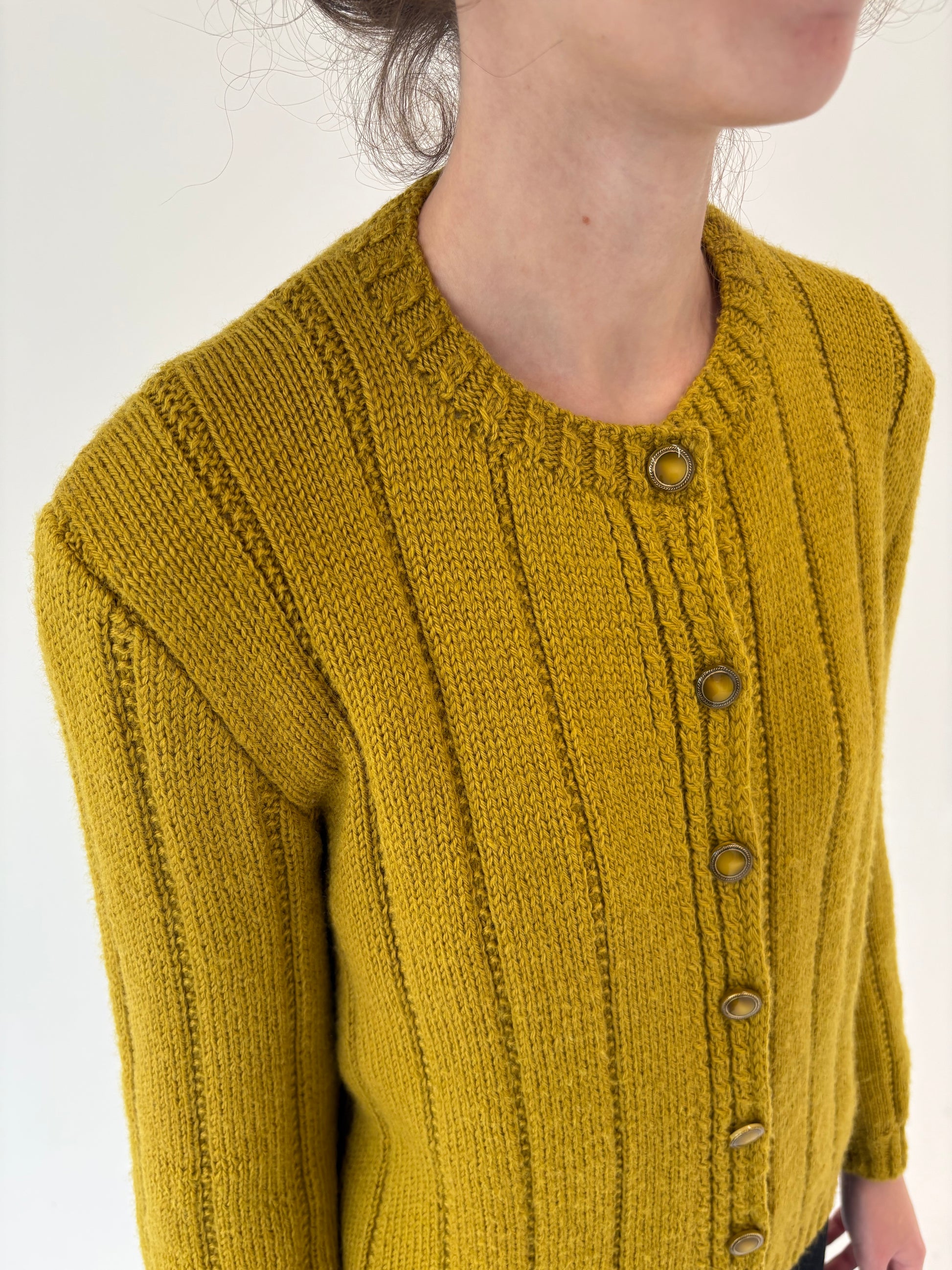 Cardigan vintage mustard green lucrat manual din lana extrafina plină