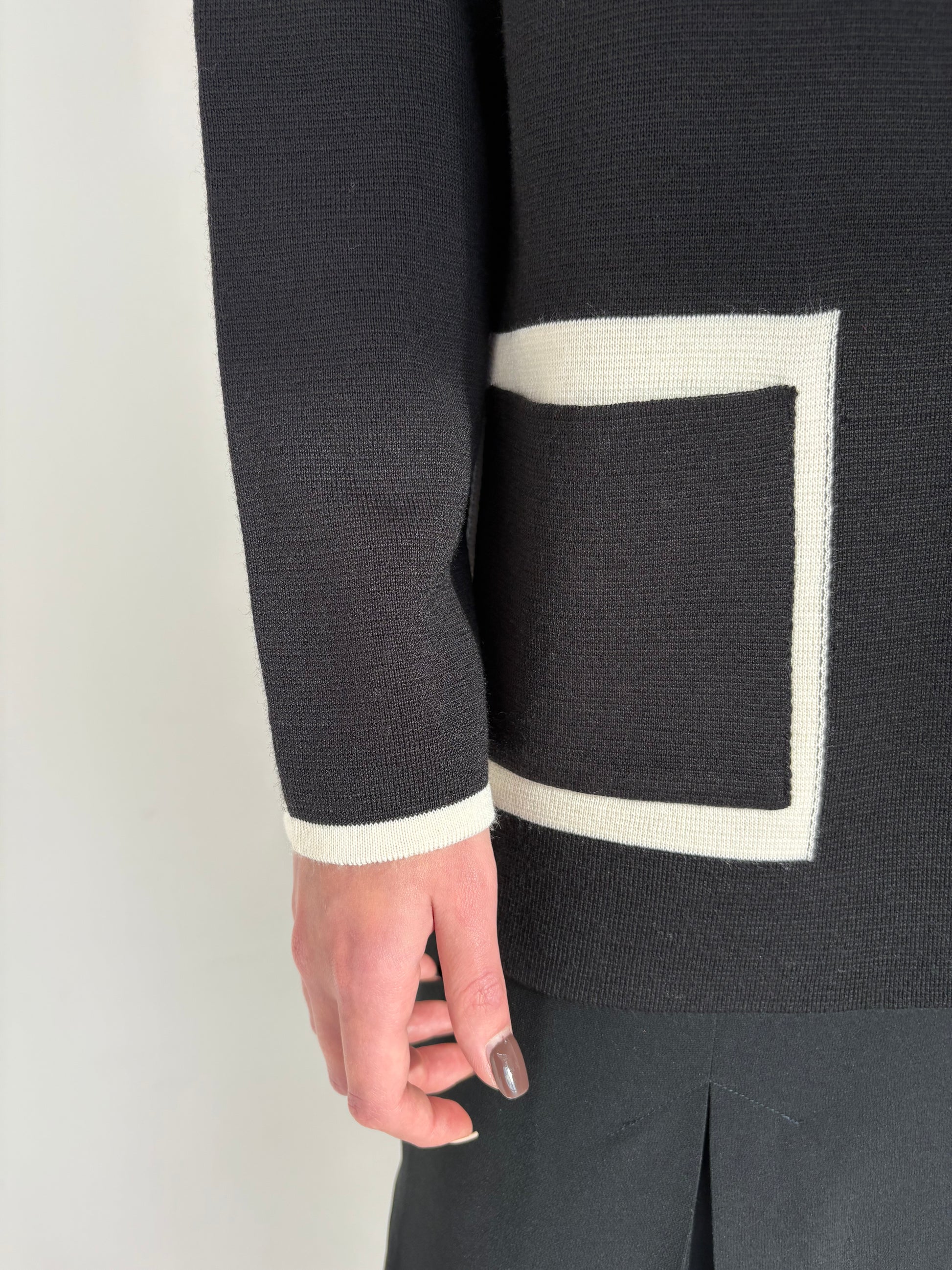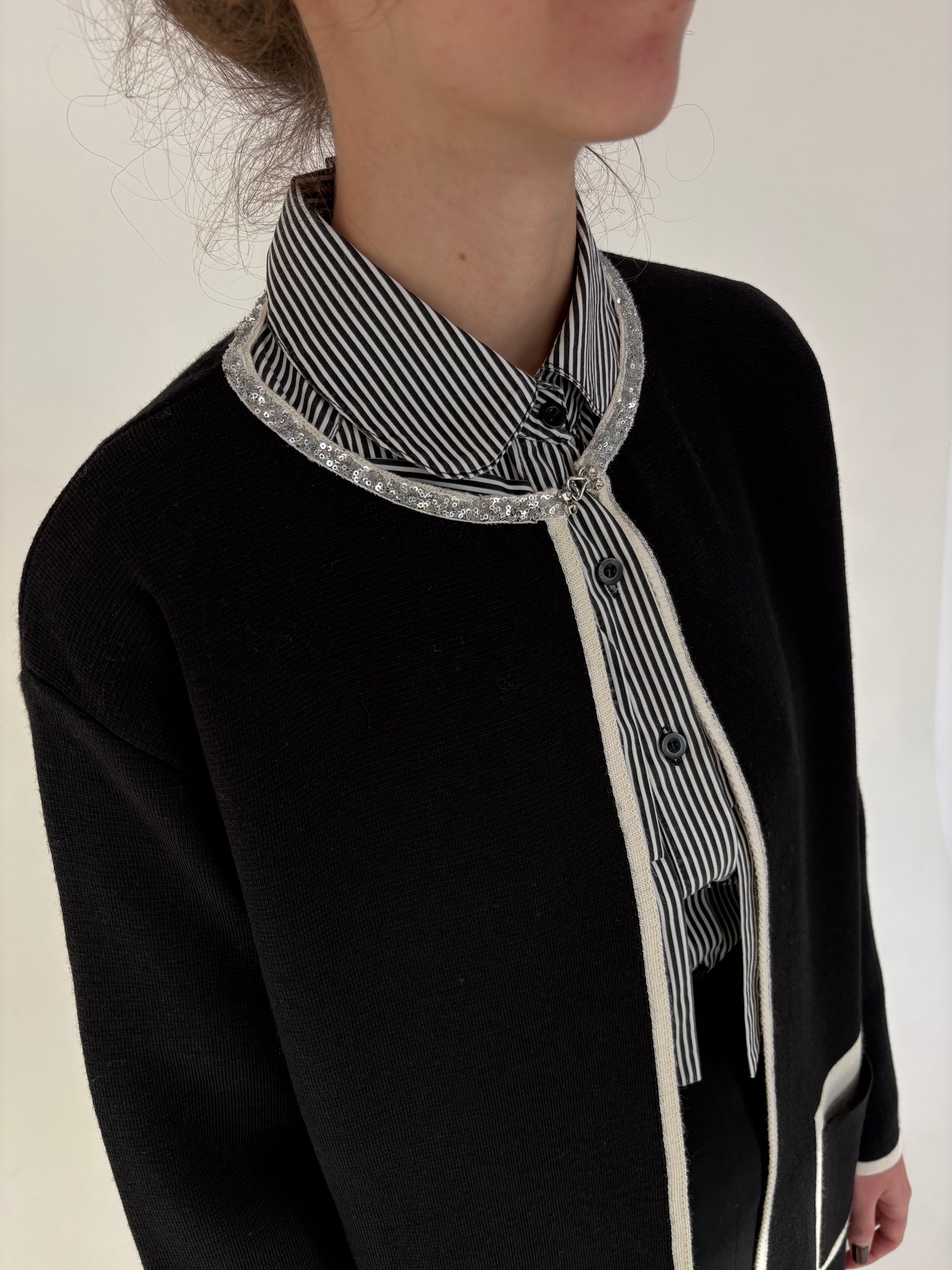 Cardigan negue în stil Chanel cu paspoal ivorie și aplicații manuale
