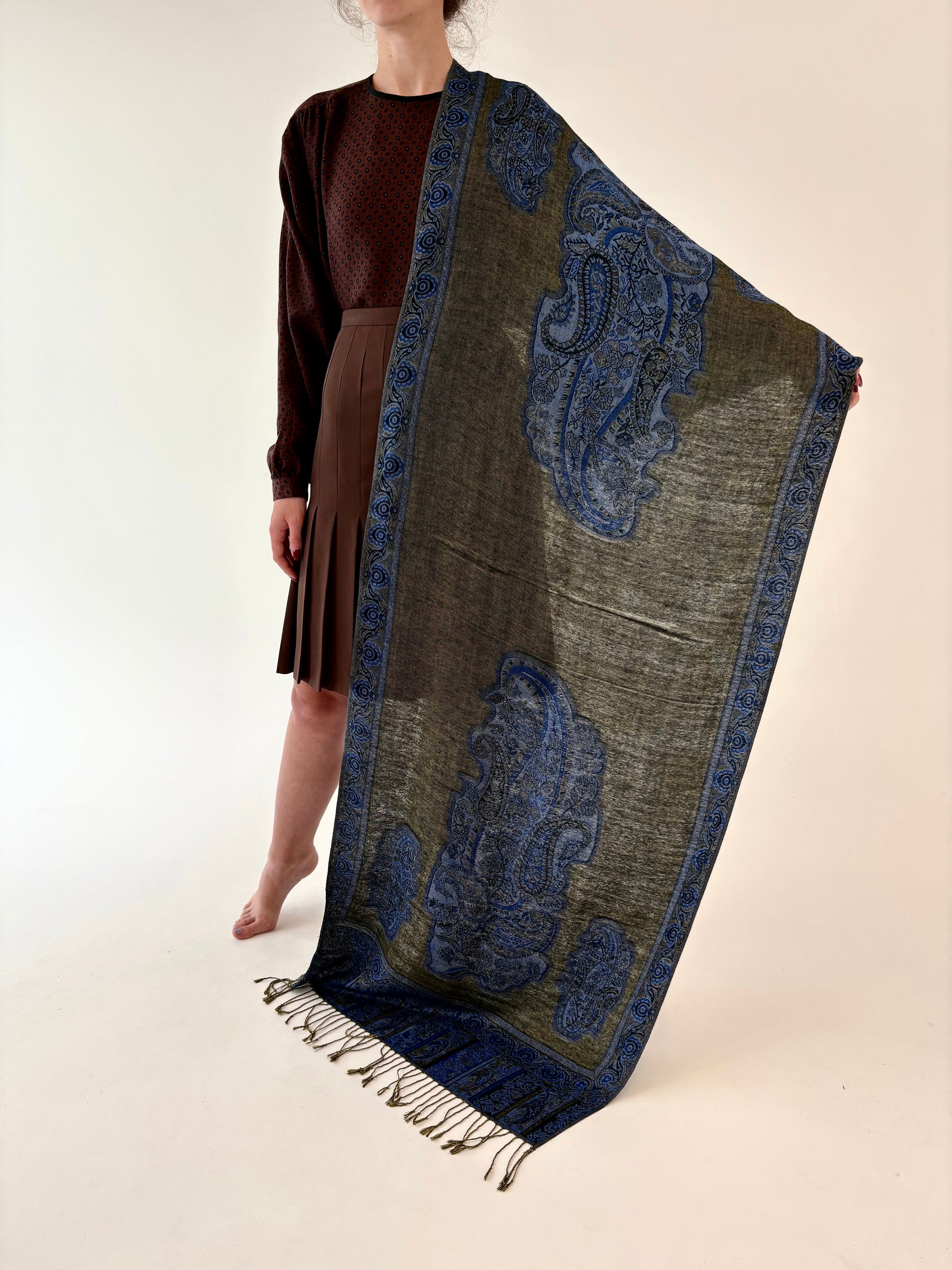 Sal XXXL din cașmir și mătase naturală ușor perlat albastru regal și forest green