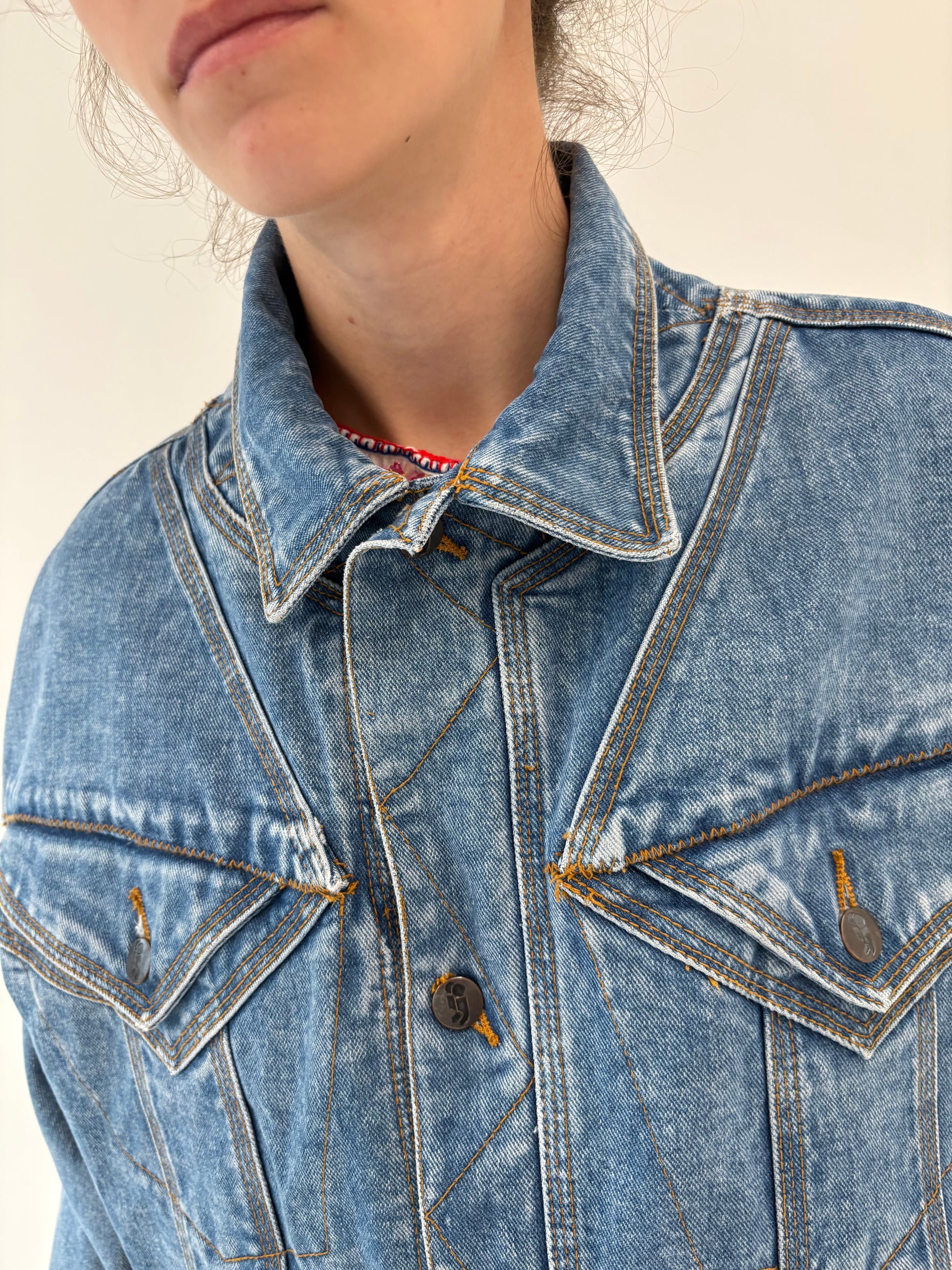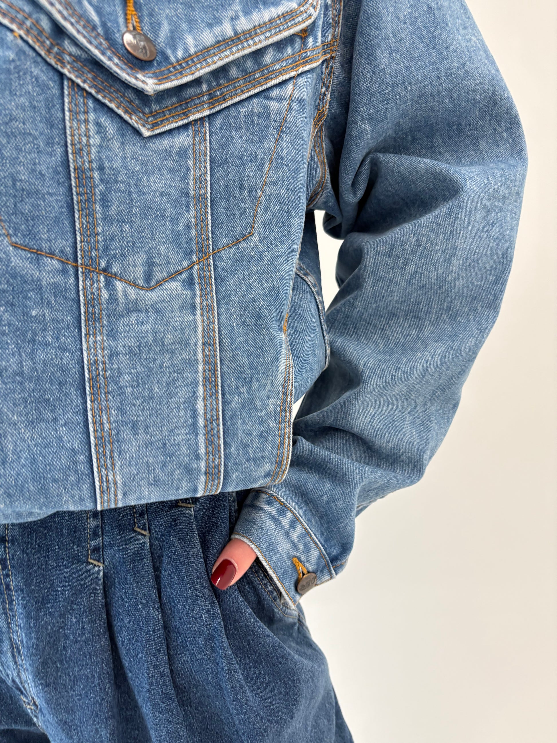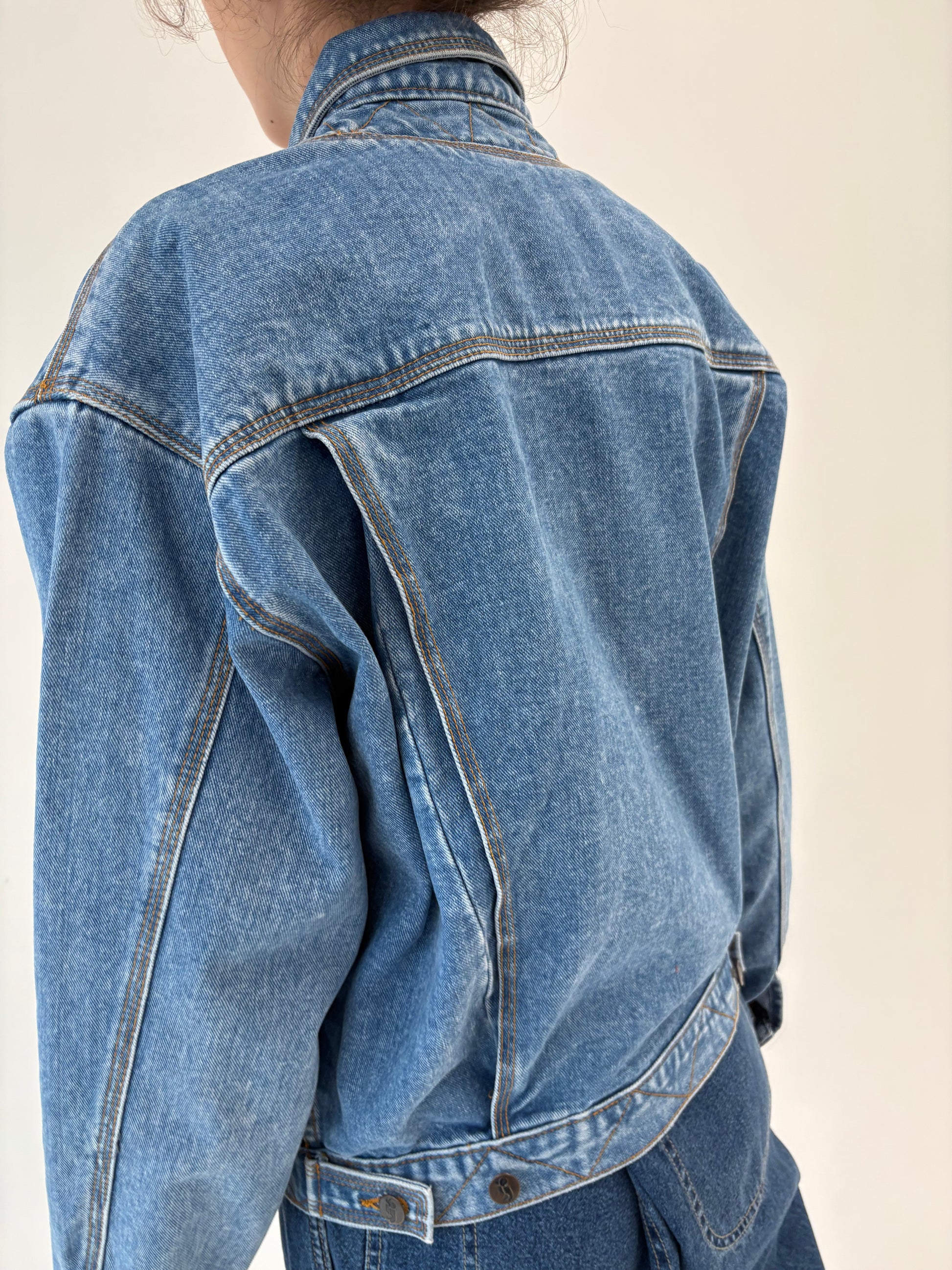–Spălarea uniformă, cu efect stonewash dar nu extrem de decolorat, confirmă perioada de sfârșit de ani 80 anilor Nasturii metalici și ajustorii din talie sunt în linie cu modelele de atunci