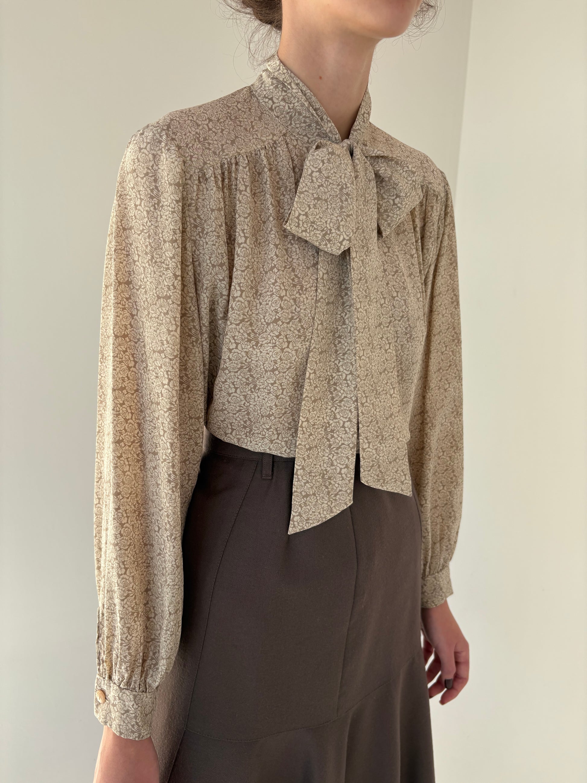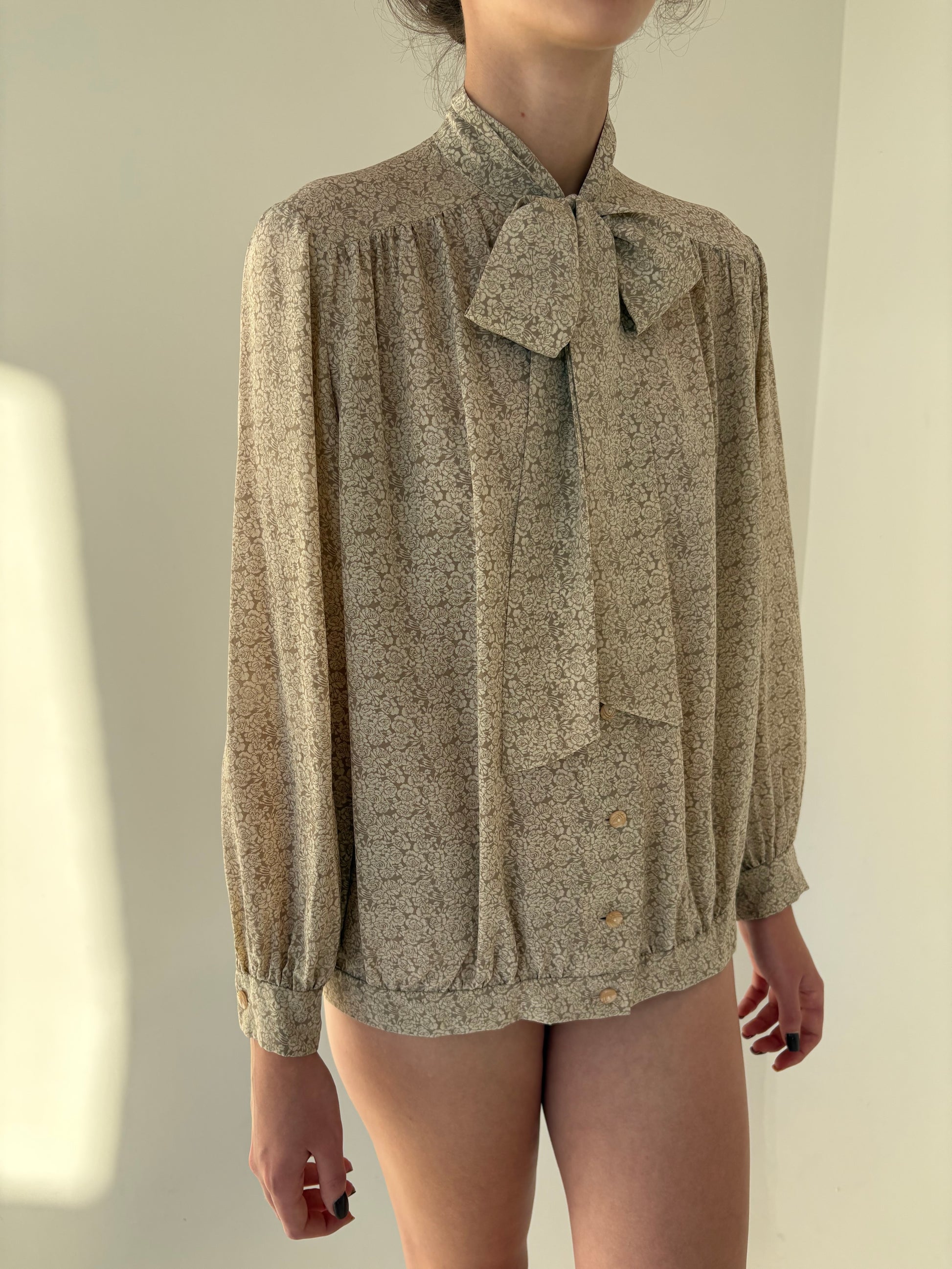 Cămașa vintage din mătase naturală în nuanțe neutre în croi amplu cu funda