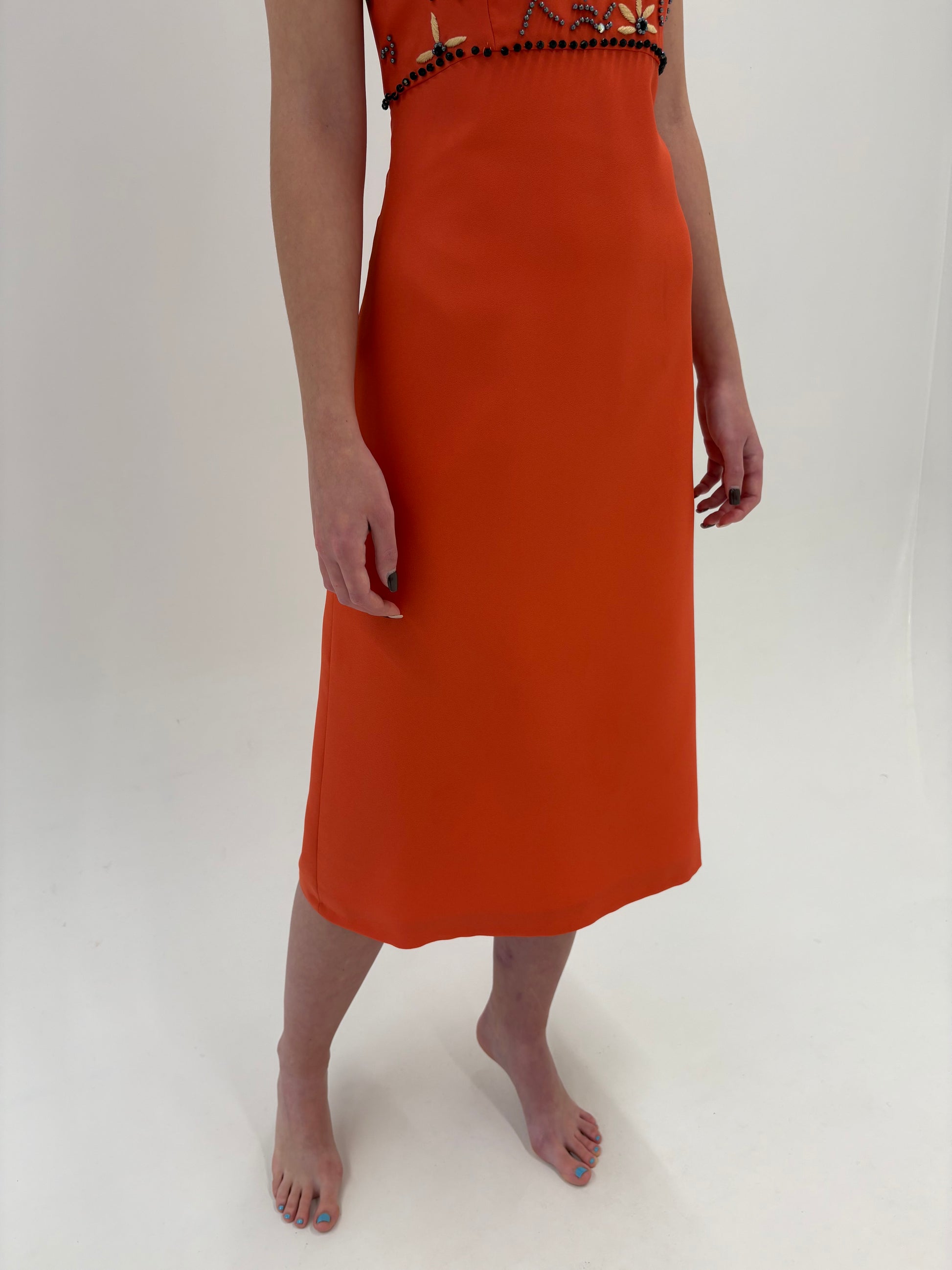 Broderia colorată cu paiete, mărgele și flori aplicate manual este specifică modei de seară a anilor ’60, când influențele orientale și arta decorativă au intrat puternic în haute couture și în creațiile artizanale europene