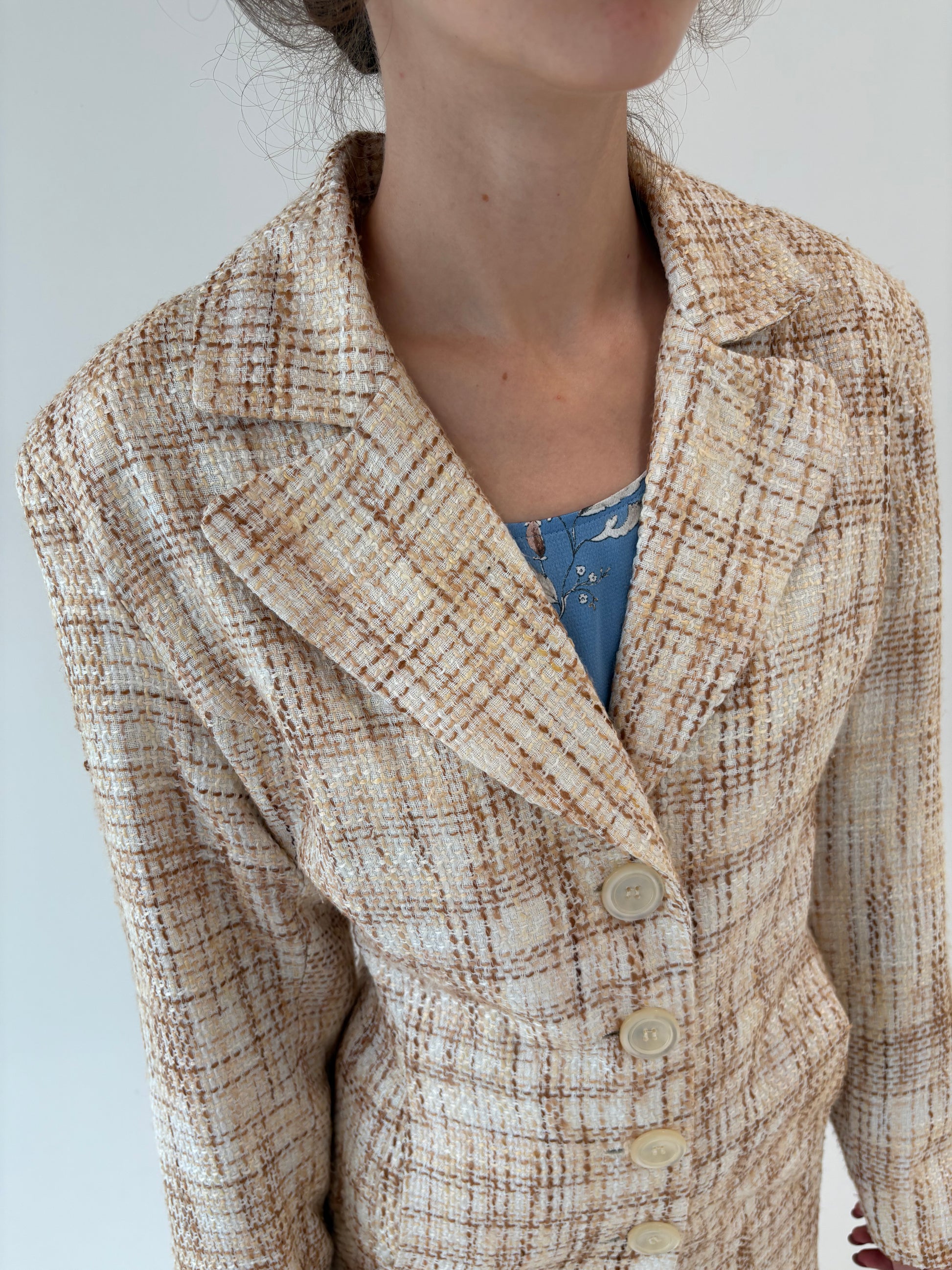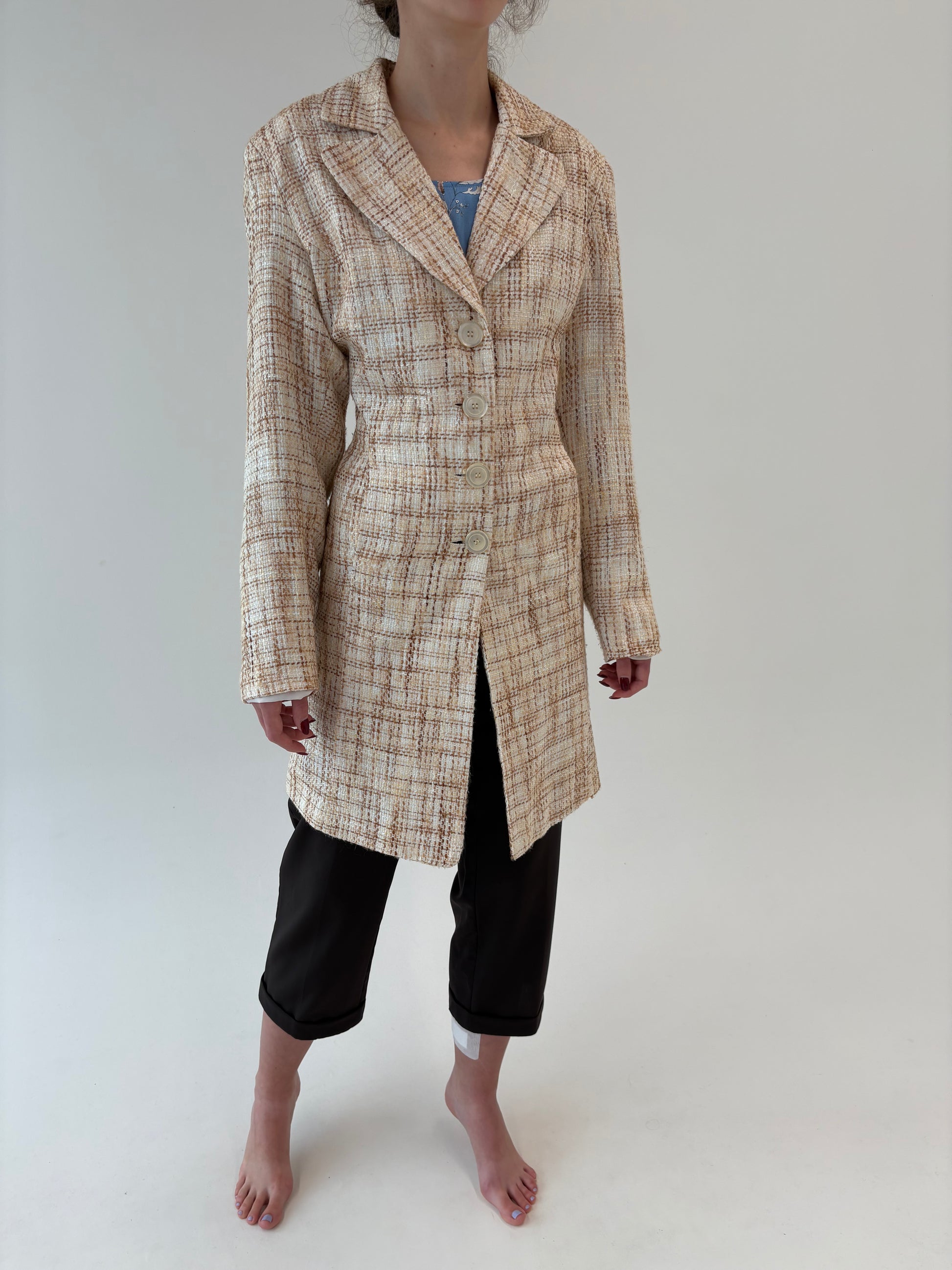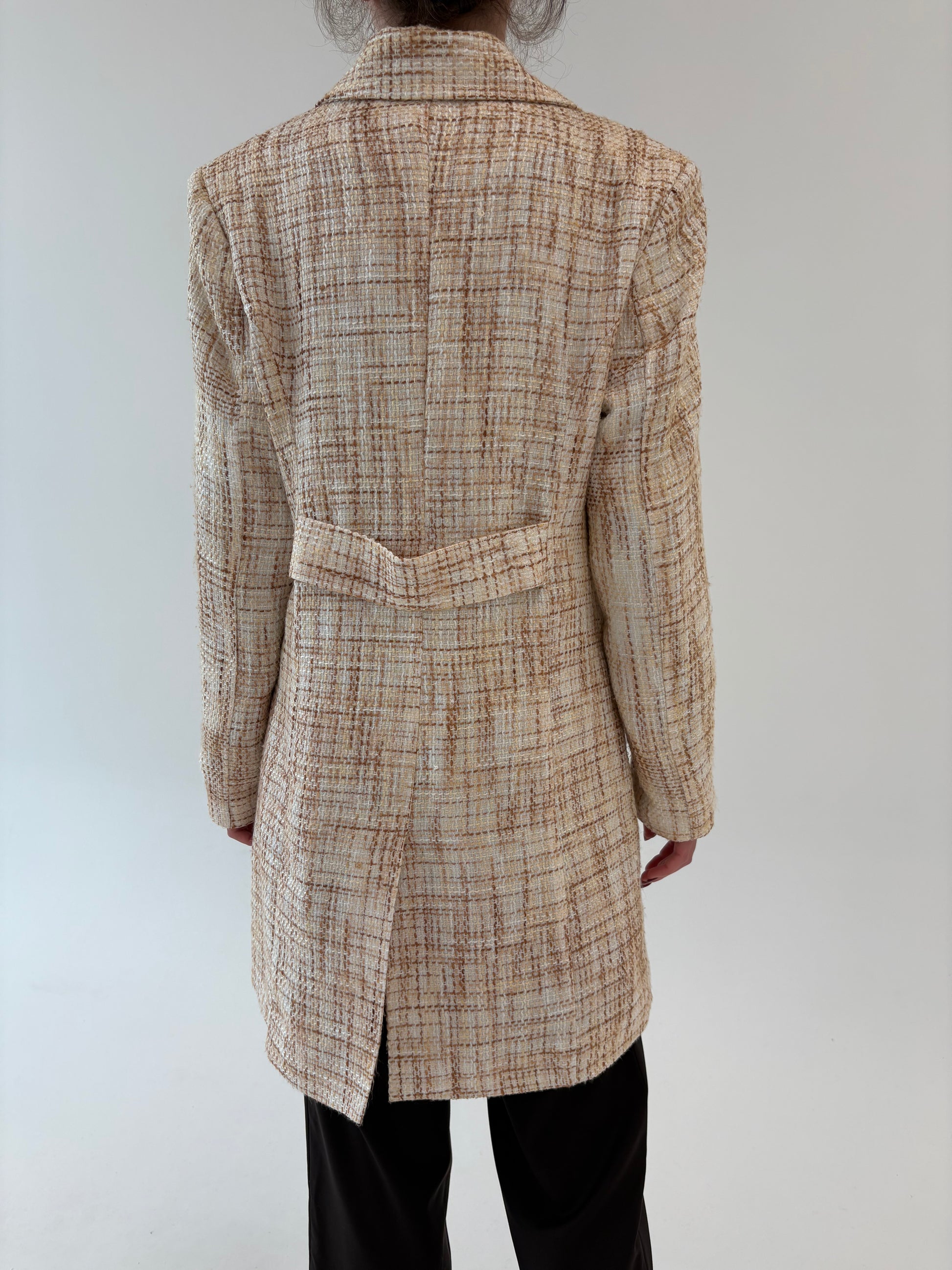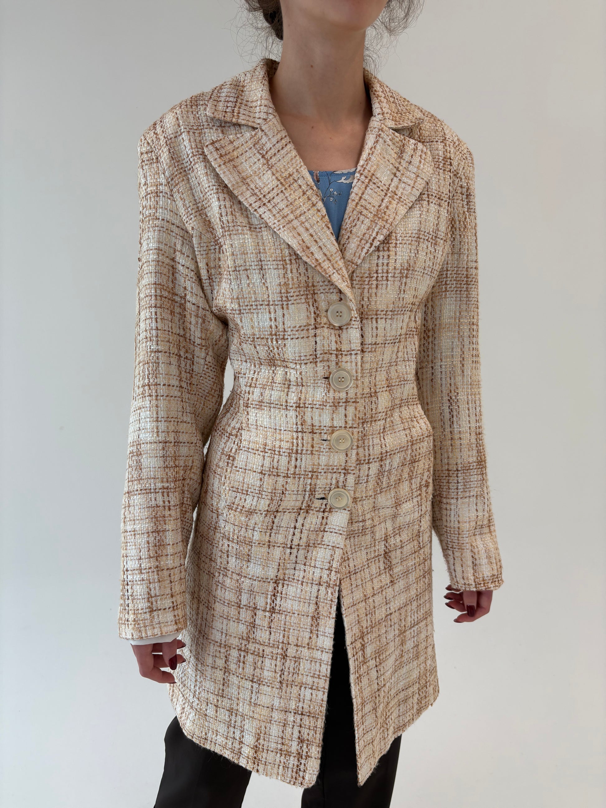 Pardesiu tall în stil Chanel din tweed în nuanțe de nude și croi ușor cambrat