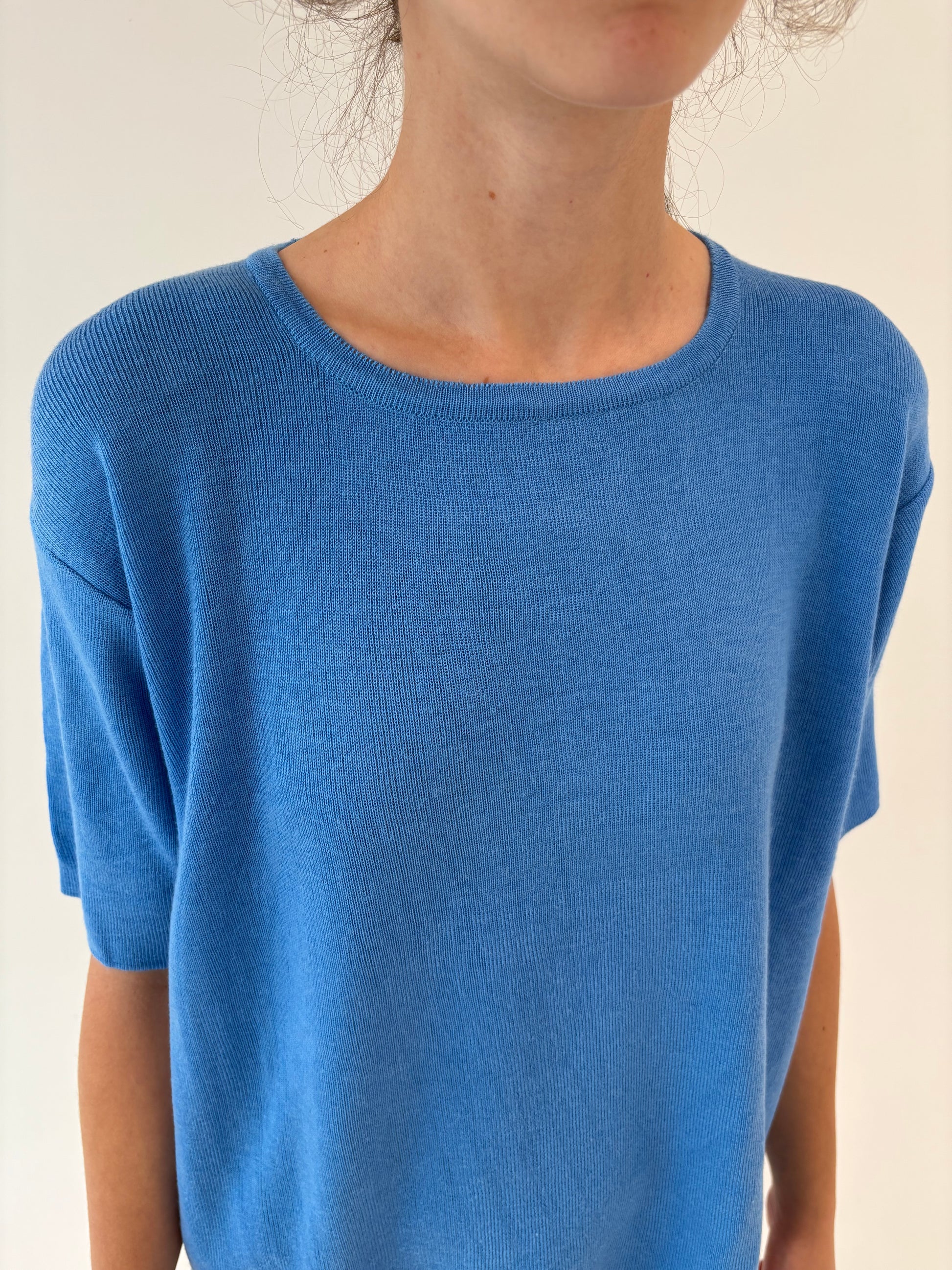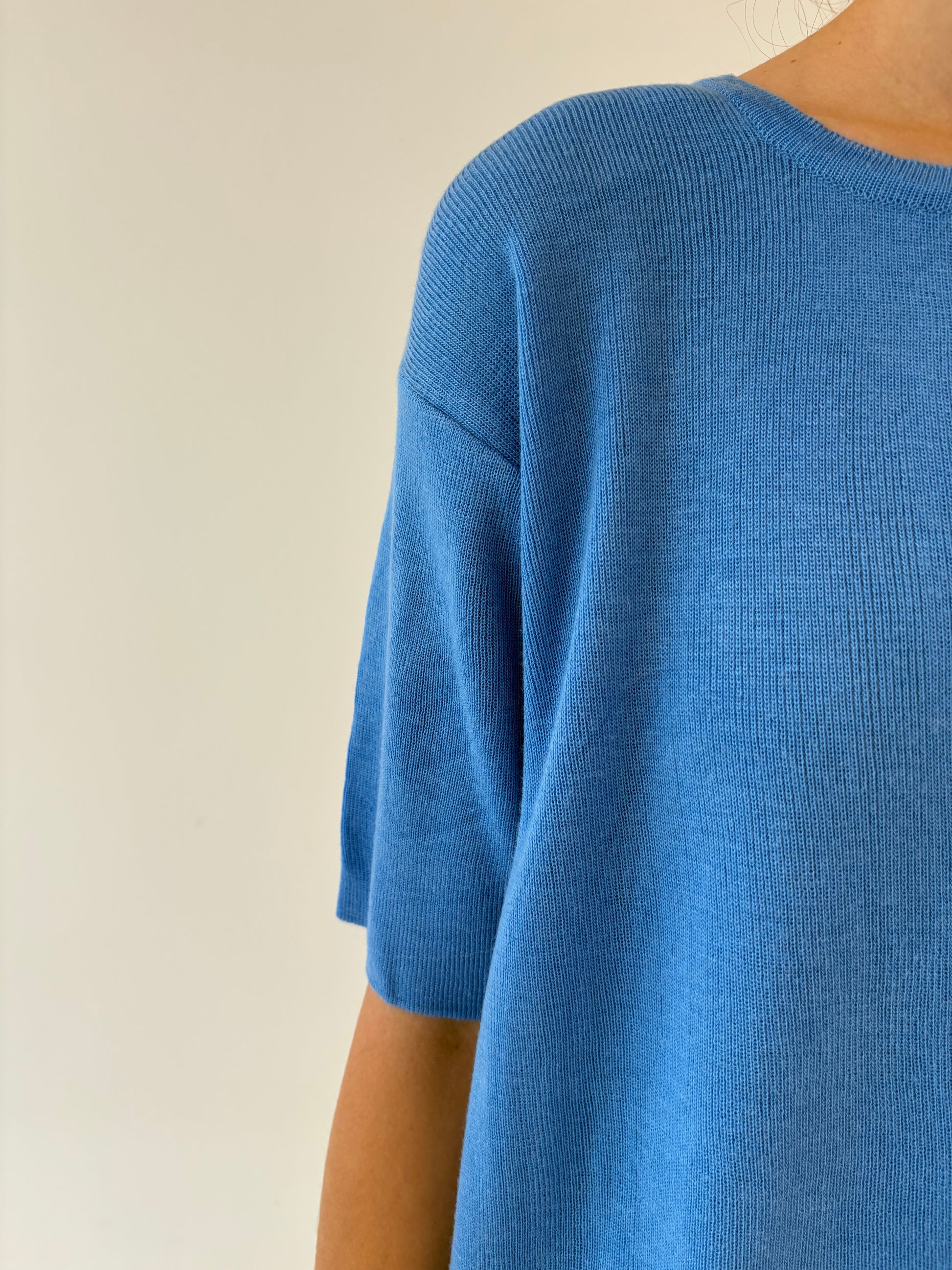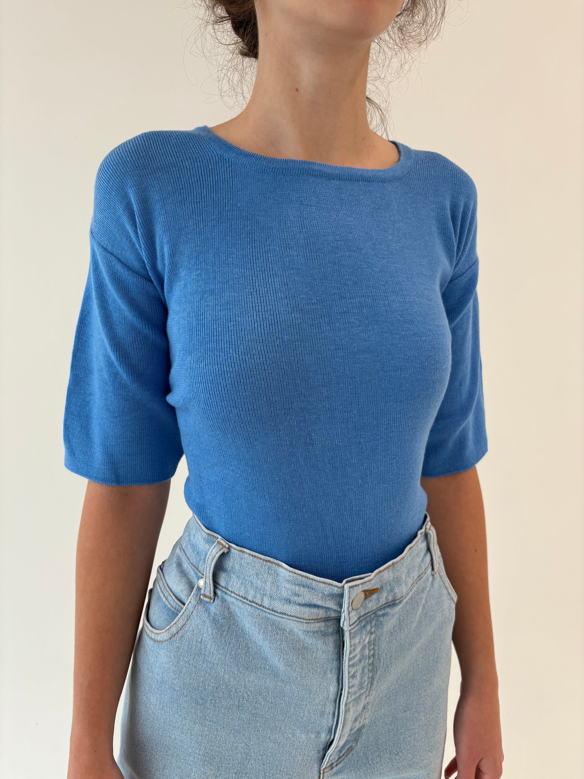 Top albastru ciel din mix de lana extrafina și bumbac