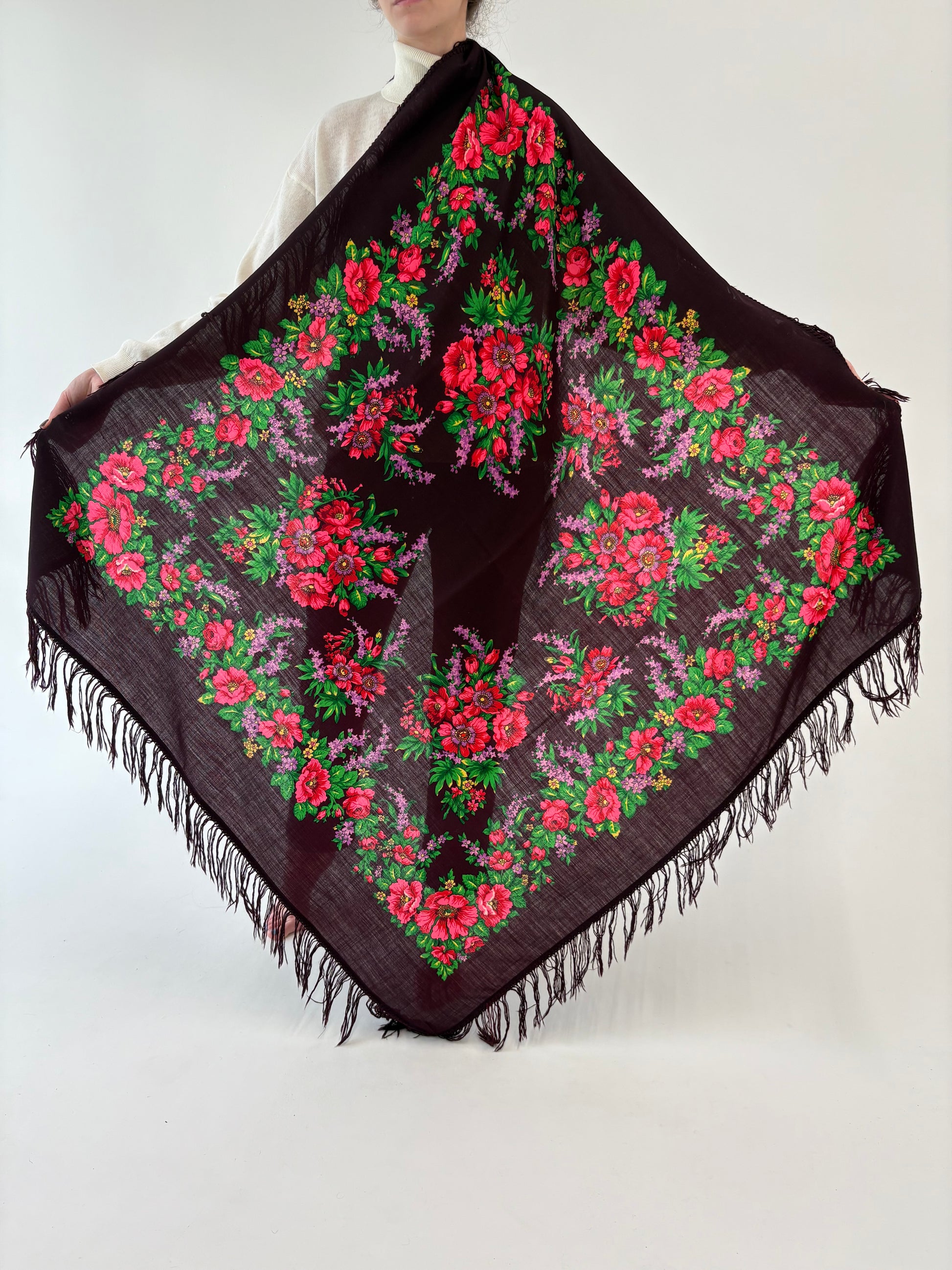 buchetele mari de trandafiri roșii cu frunze verde-intens și inflorescențe liliachii, dispuse simetric pe diagonale sunt tipice pentru șalurile rusești Pavlovo Posad din anii 1960–1980