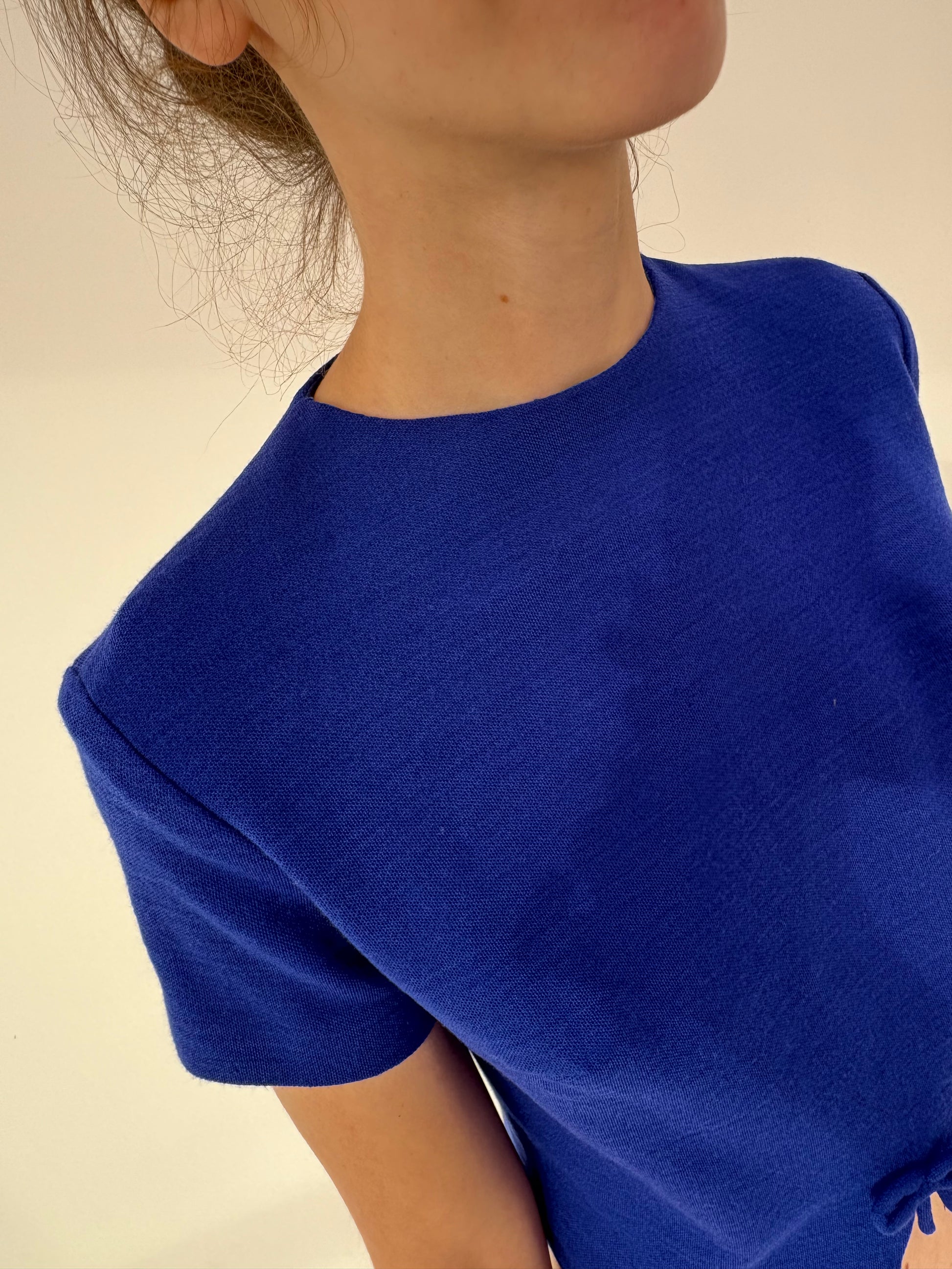 Forma este tipică pentru începutul anilor 60: croială scurtă, aproape „shell top”, umeri ușor structurați, mânecă scurtă simplă, guler rotund foarte curat. Detaliul cu șlițul mic în față și fundița micro este exact estetica fină, minimalist-feminină a acelei perioade (inspirată de Balenciaga, Courrèges, Pierre Cardin).