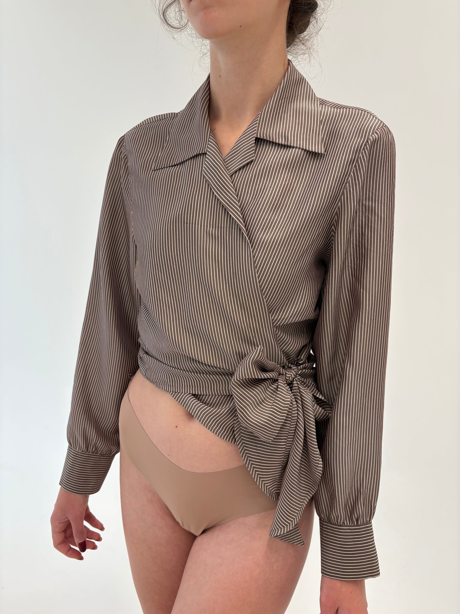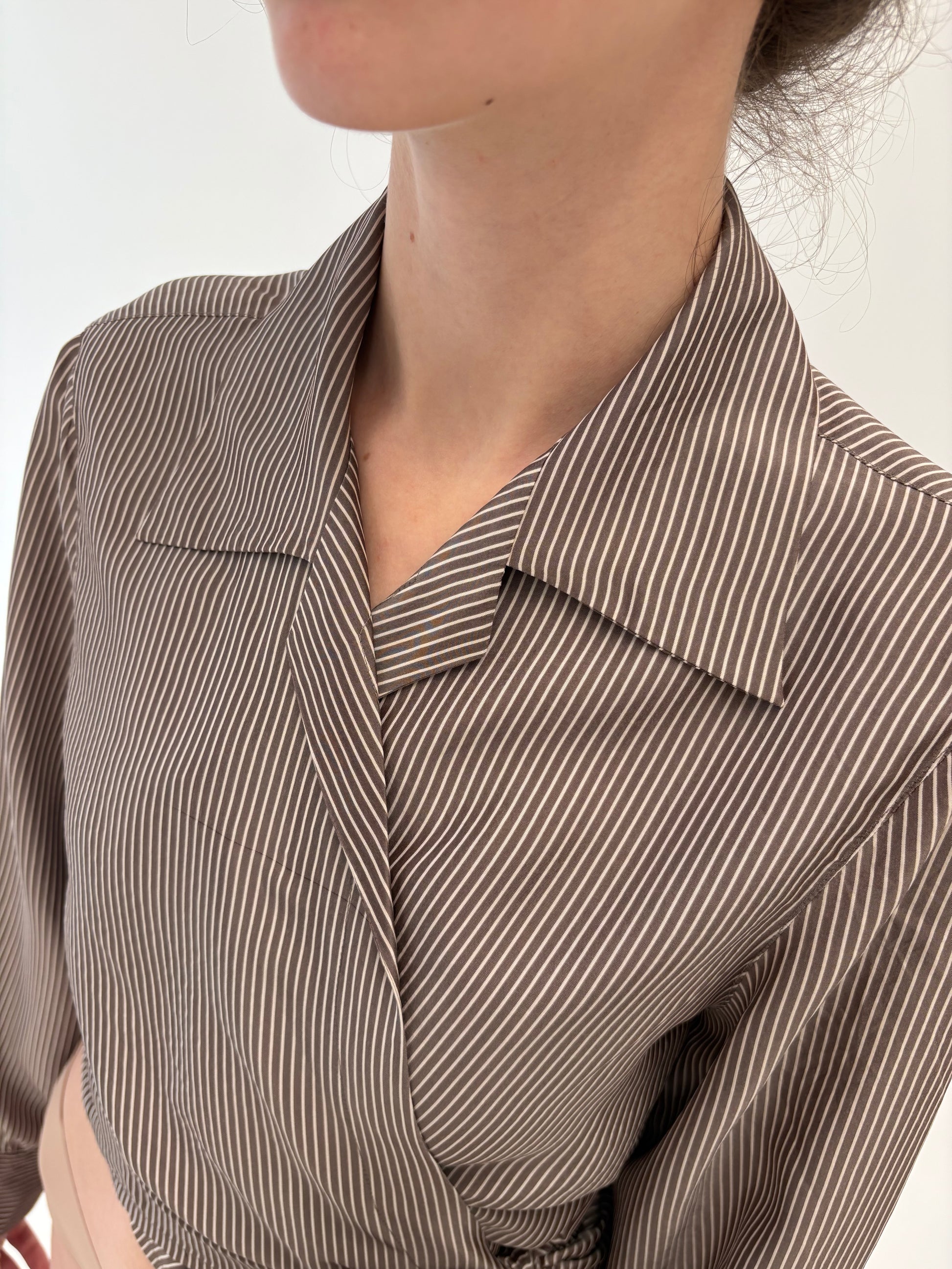Cămașa petrecută din mătase naturală chocolate brown cu dungi ivoire