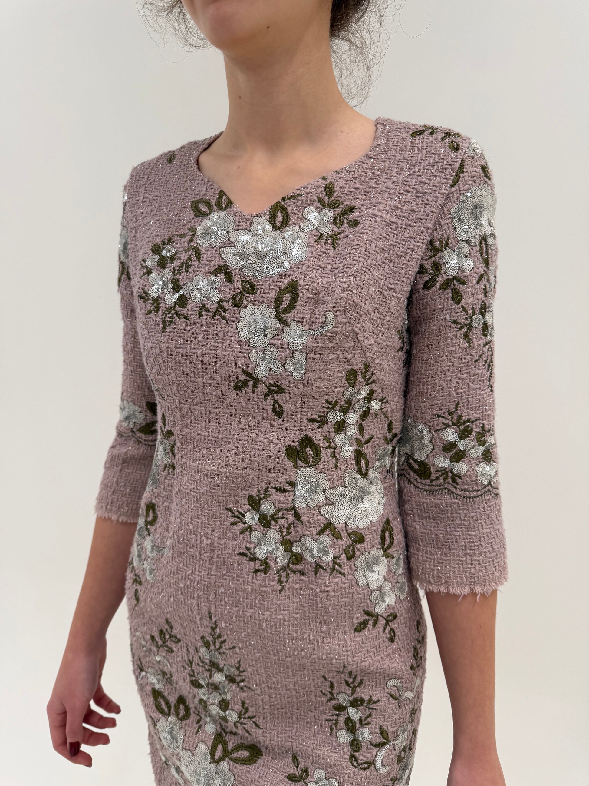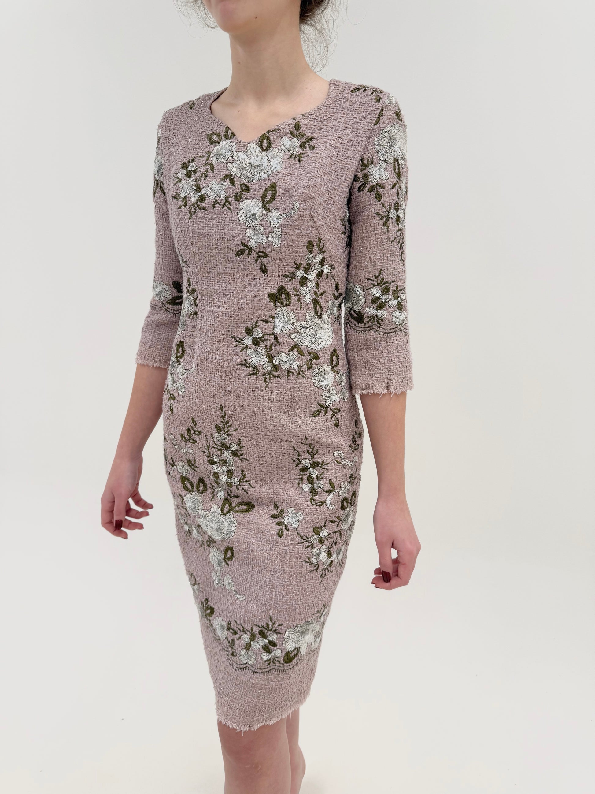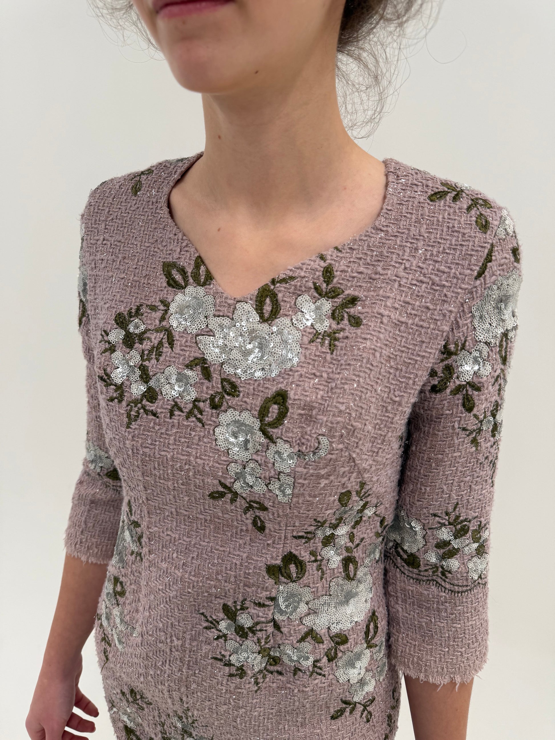 Rochie in stil Chanel din tweed dusty Pink cu aplicații și broderie