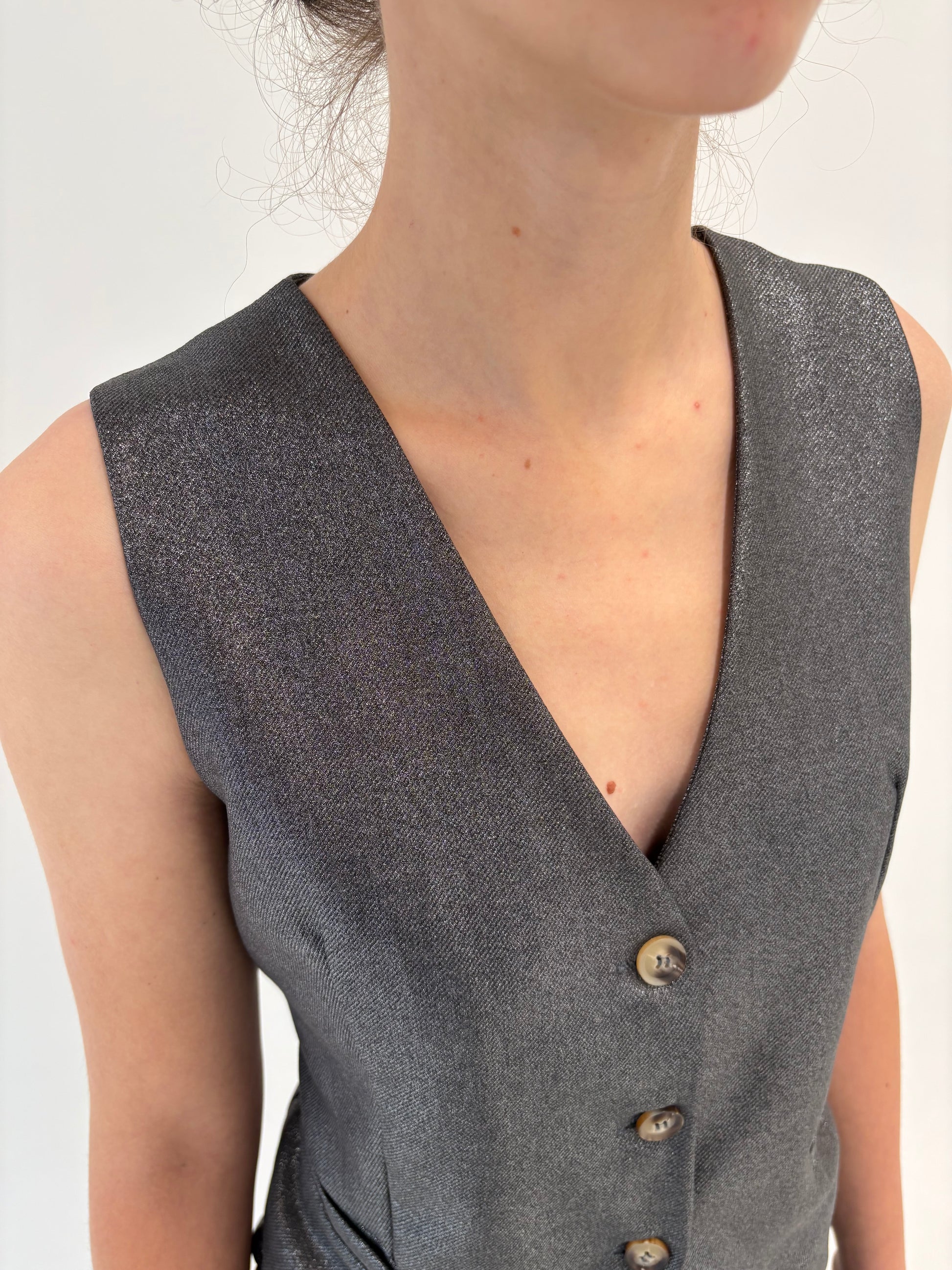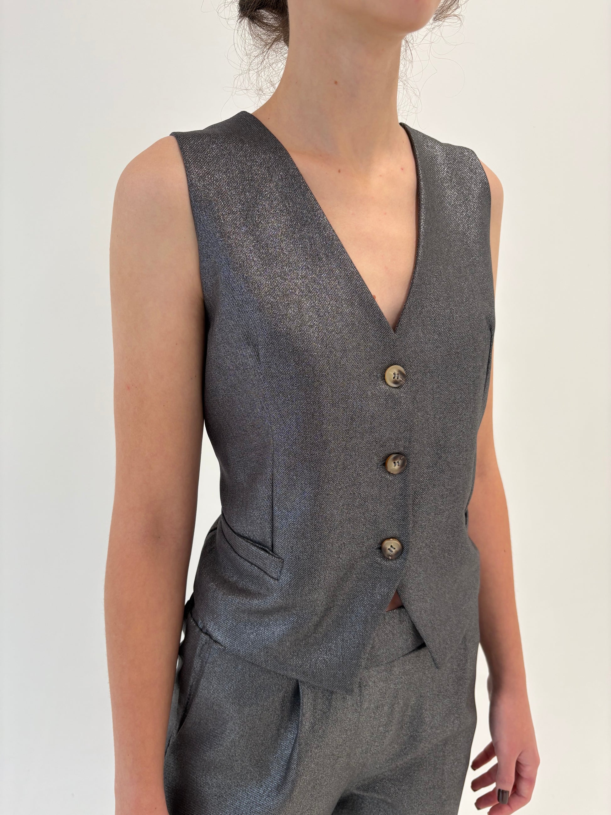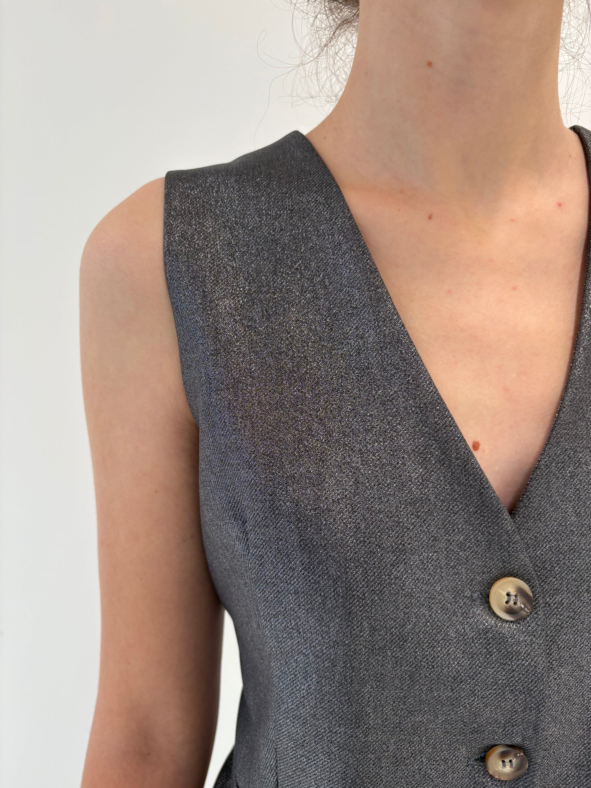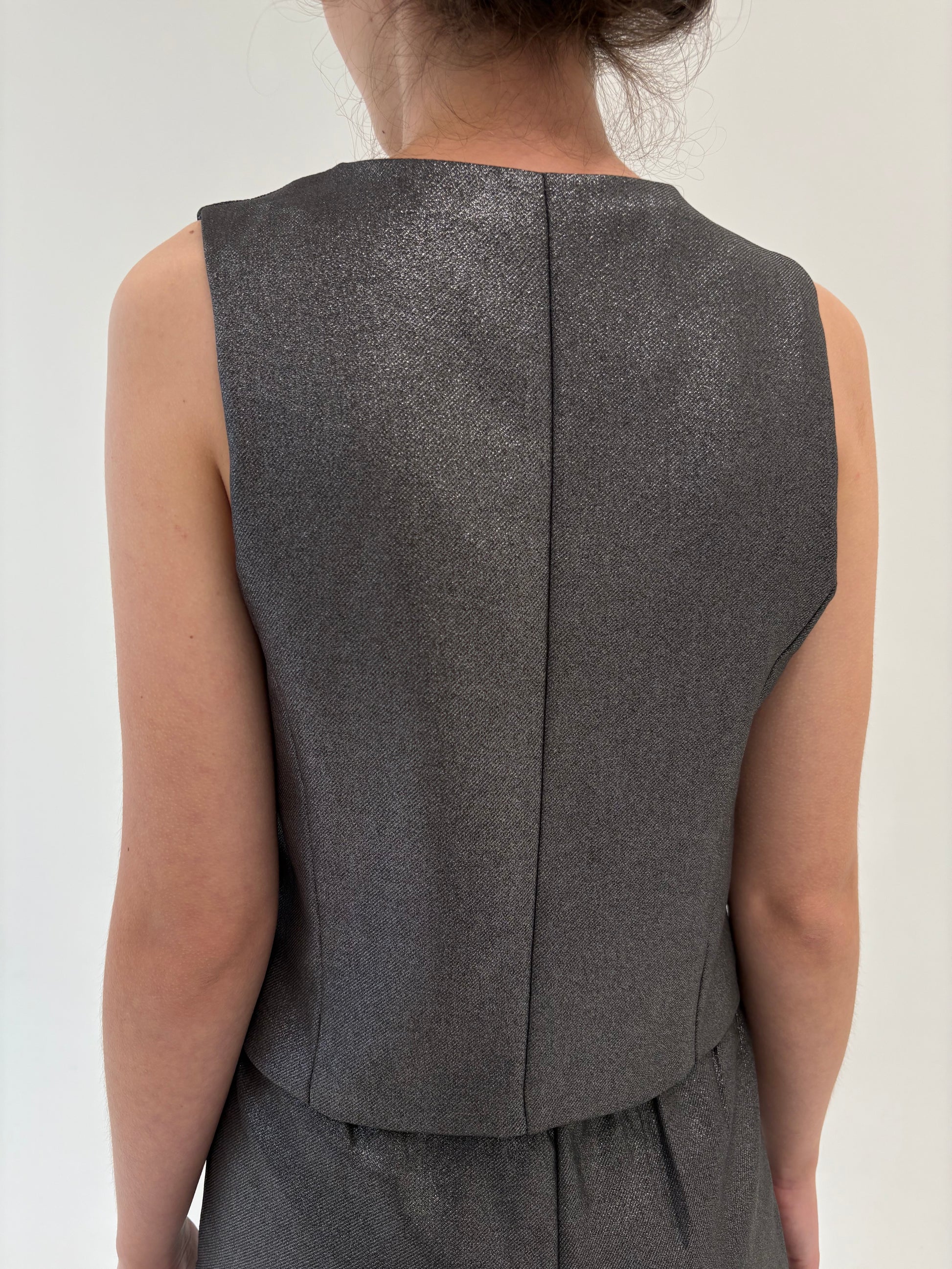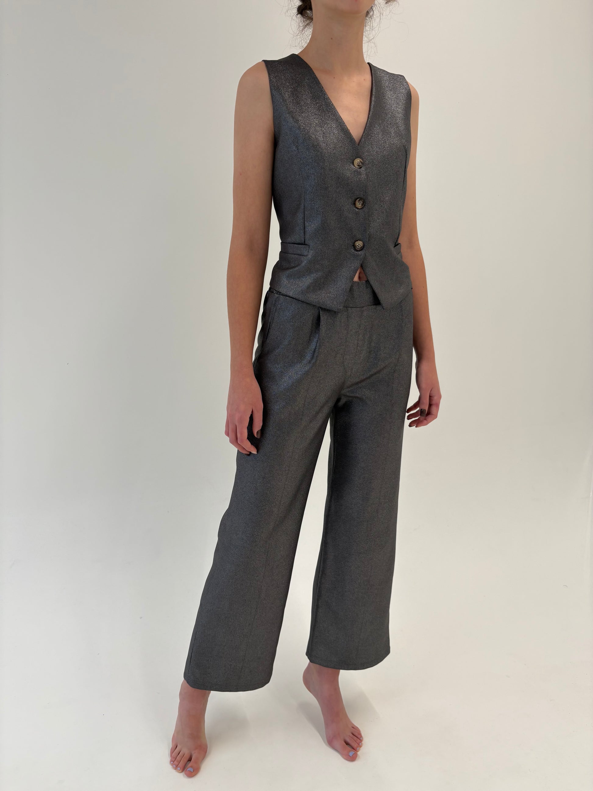 Set argintiu de la zi la seară cu pantaloni palazzo și top cambrat