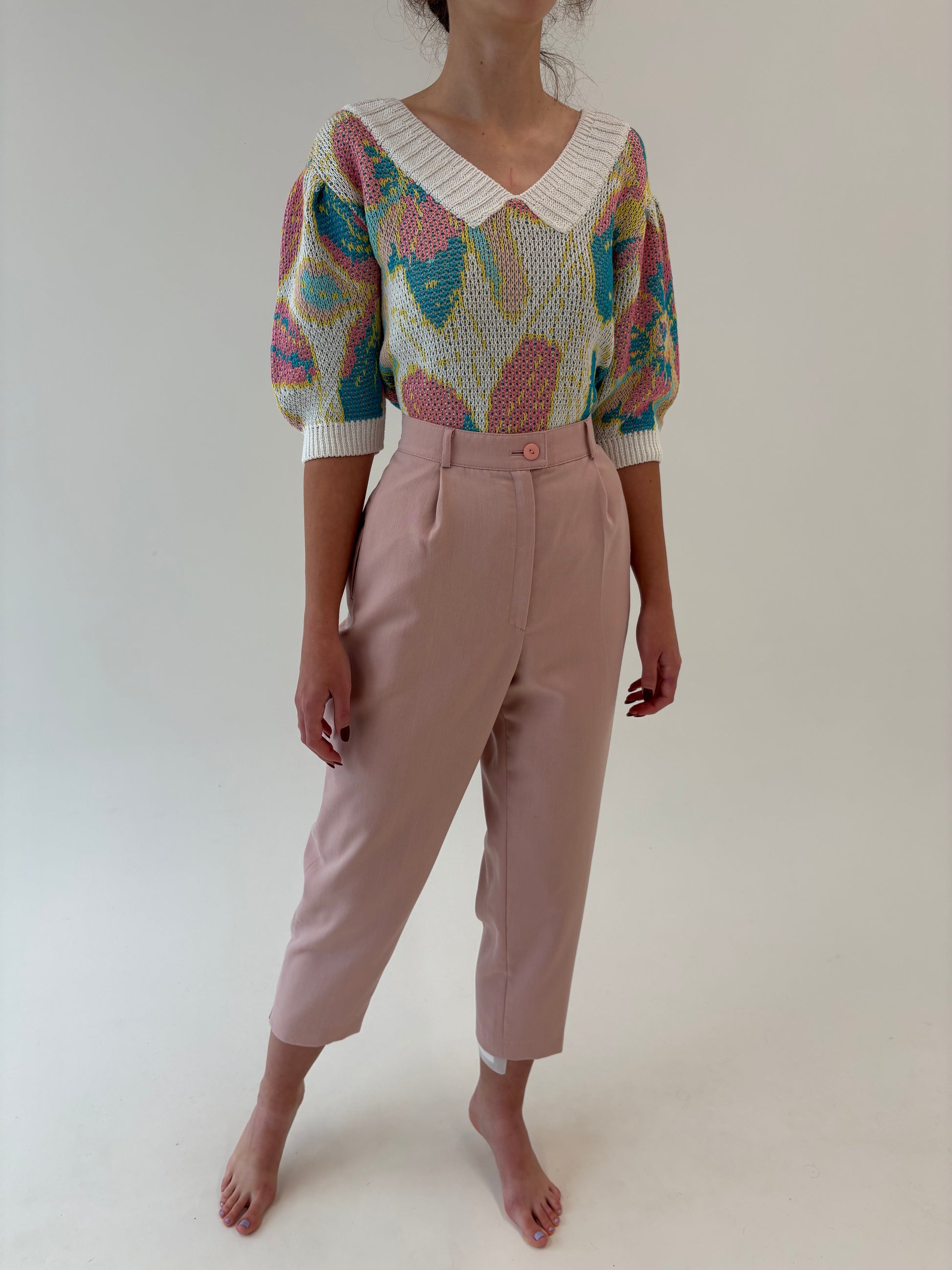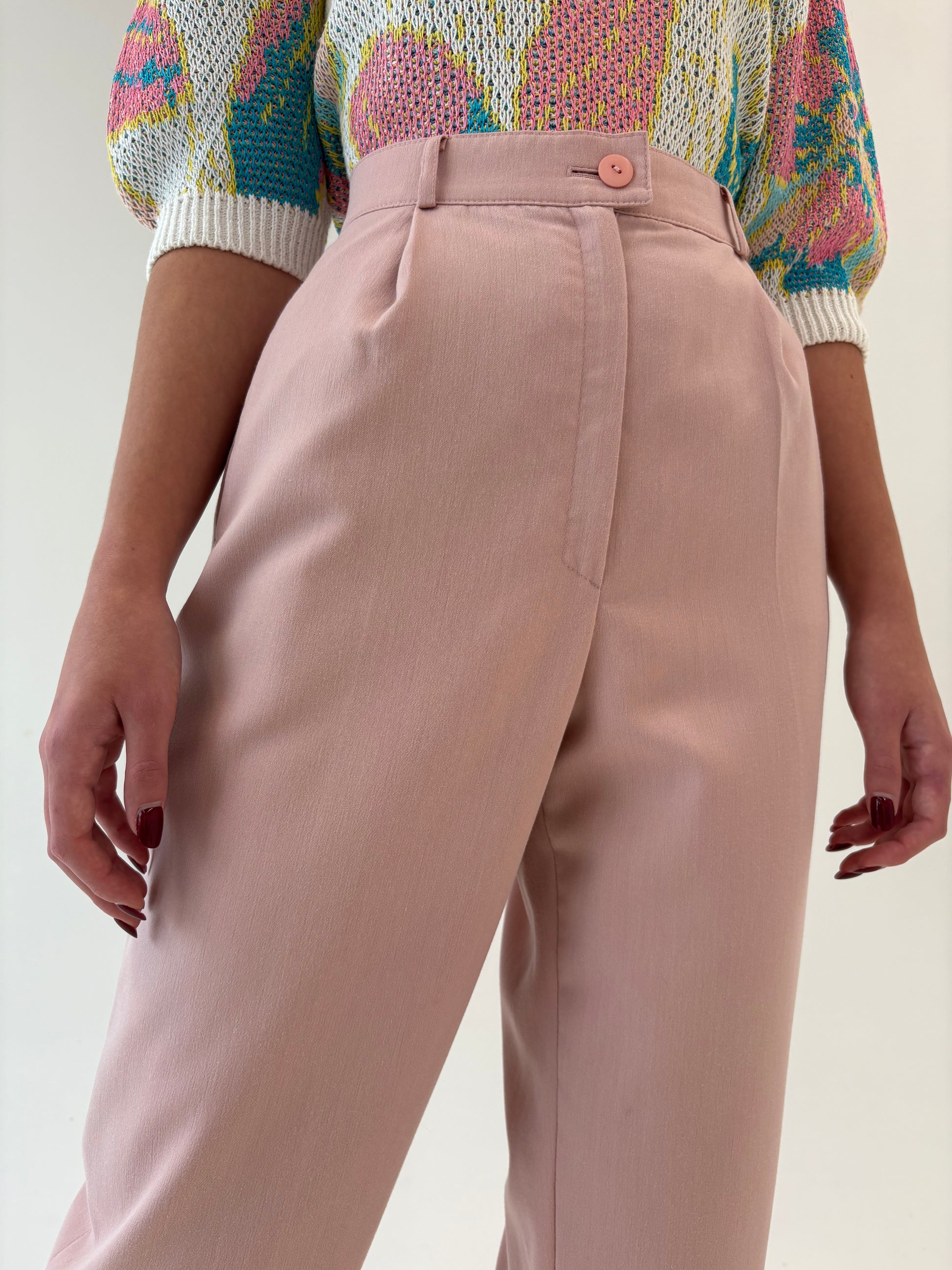 Pantaloni roz pudrat din stofita cu talie ultra înaltă marcată și pense