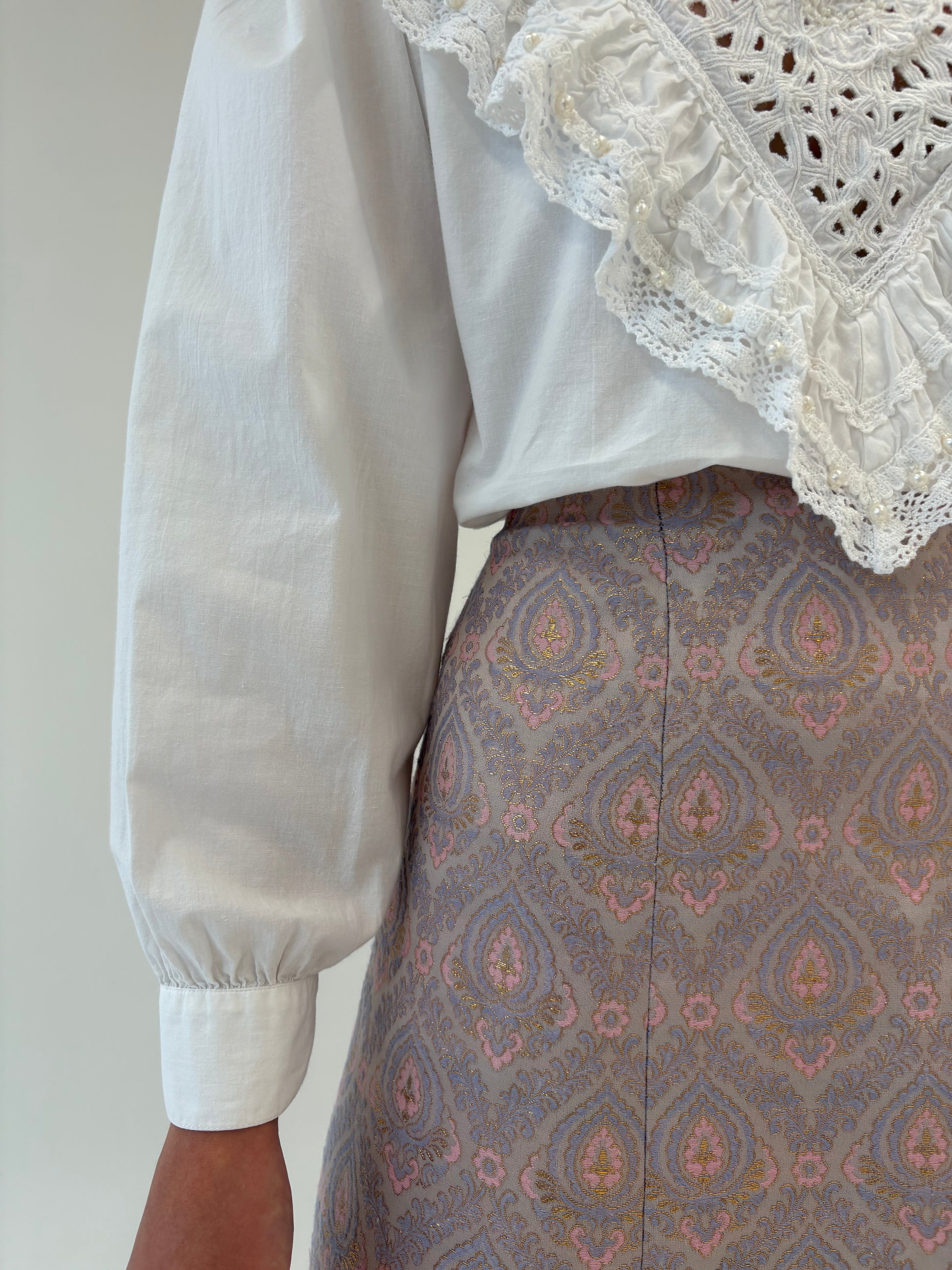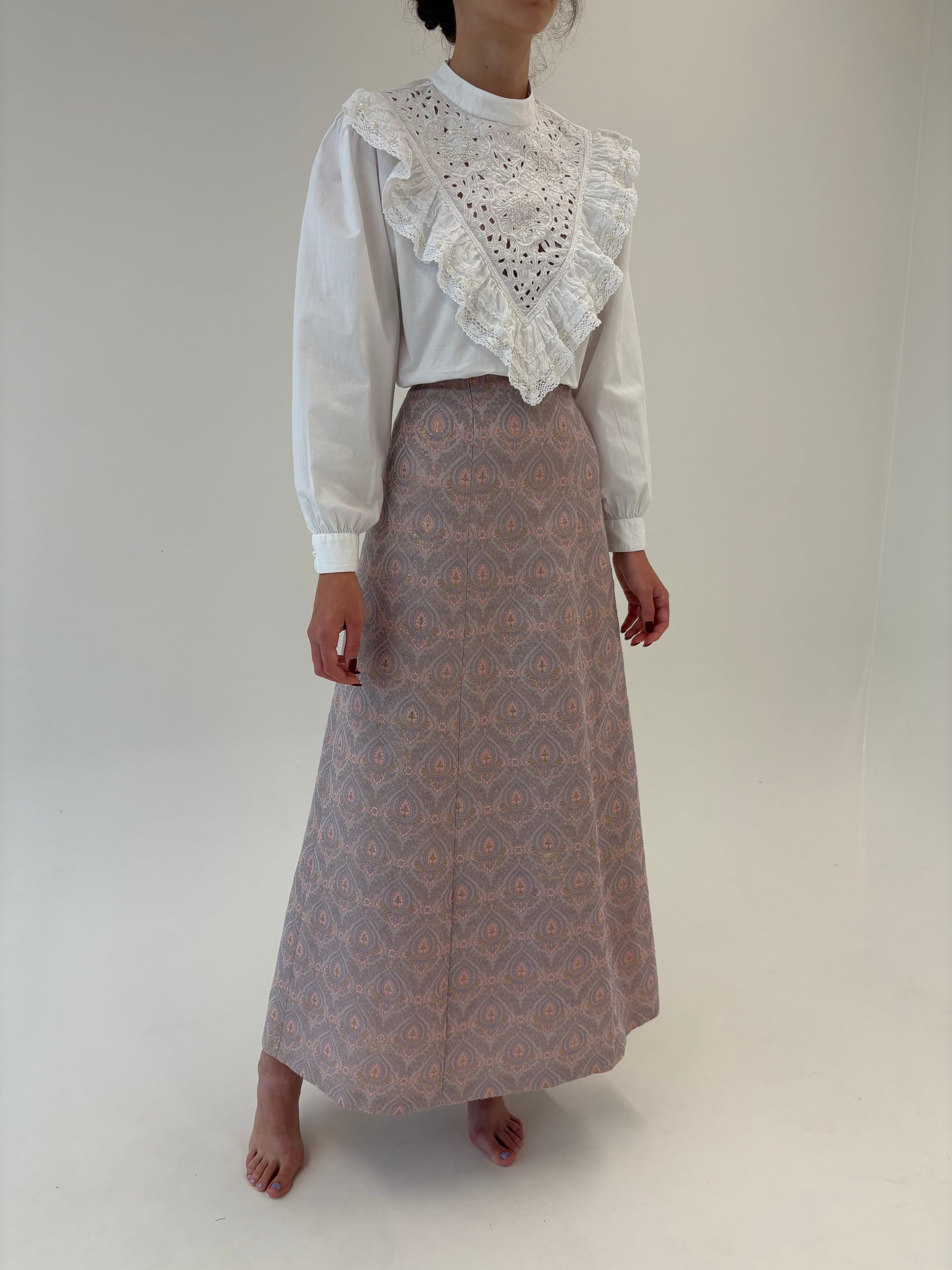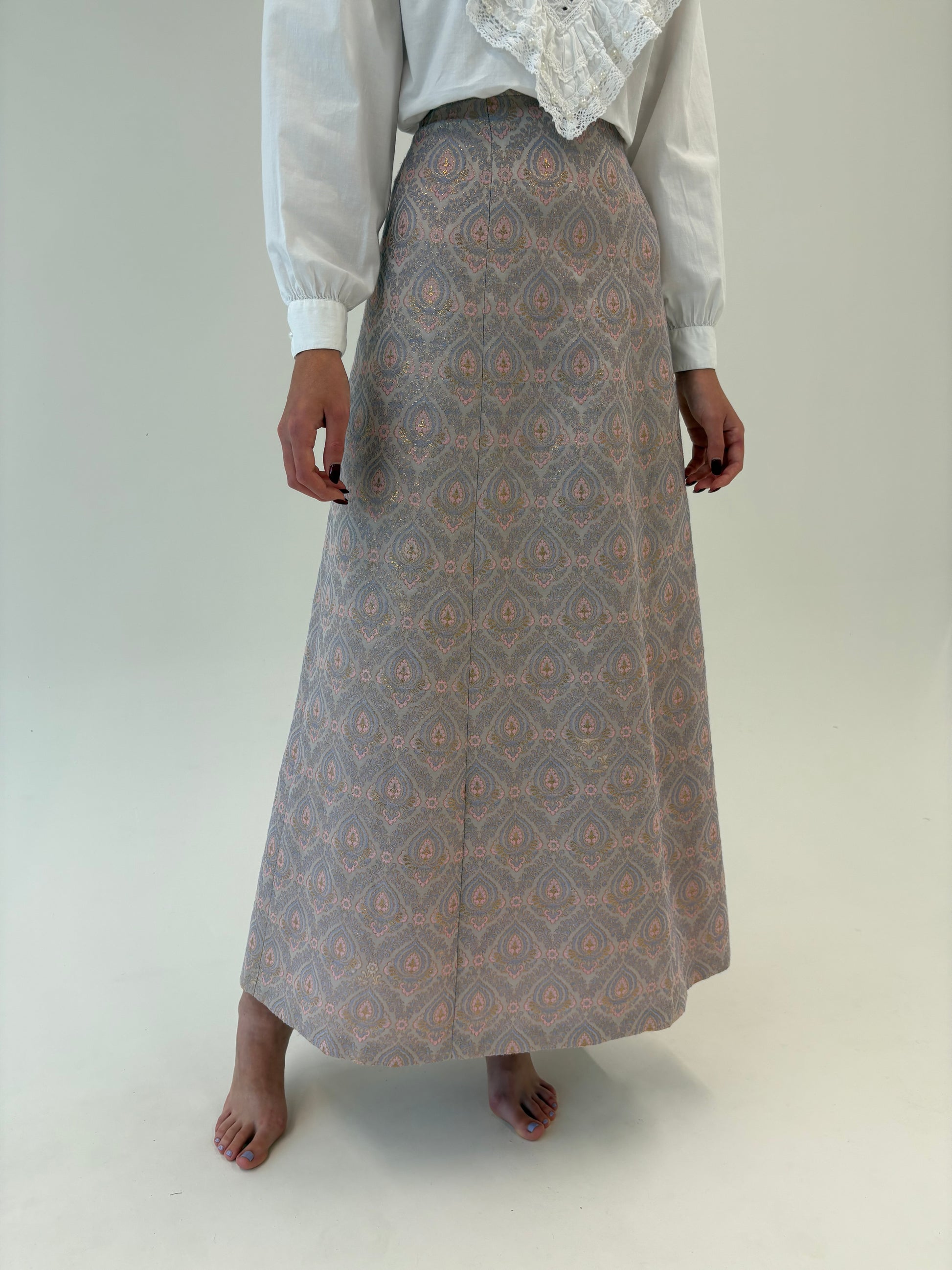 Fustă vintage maxi din brocart excepțional de lana în culori pudrate