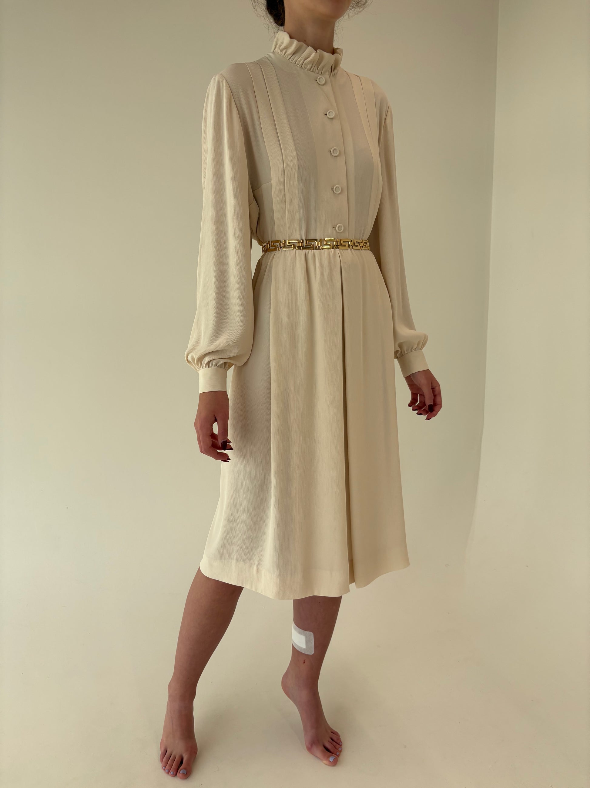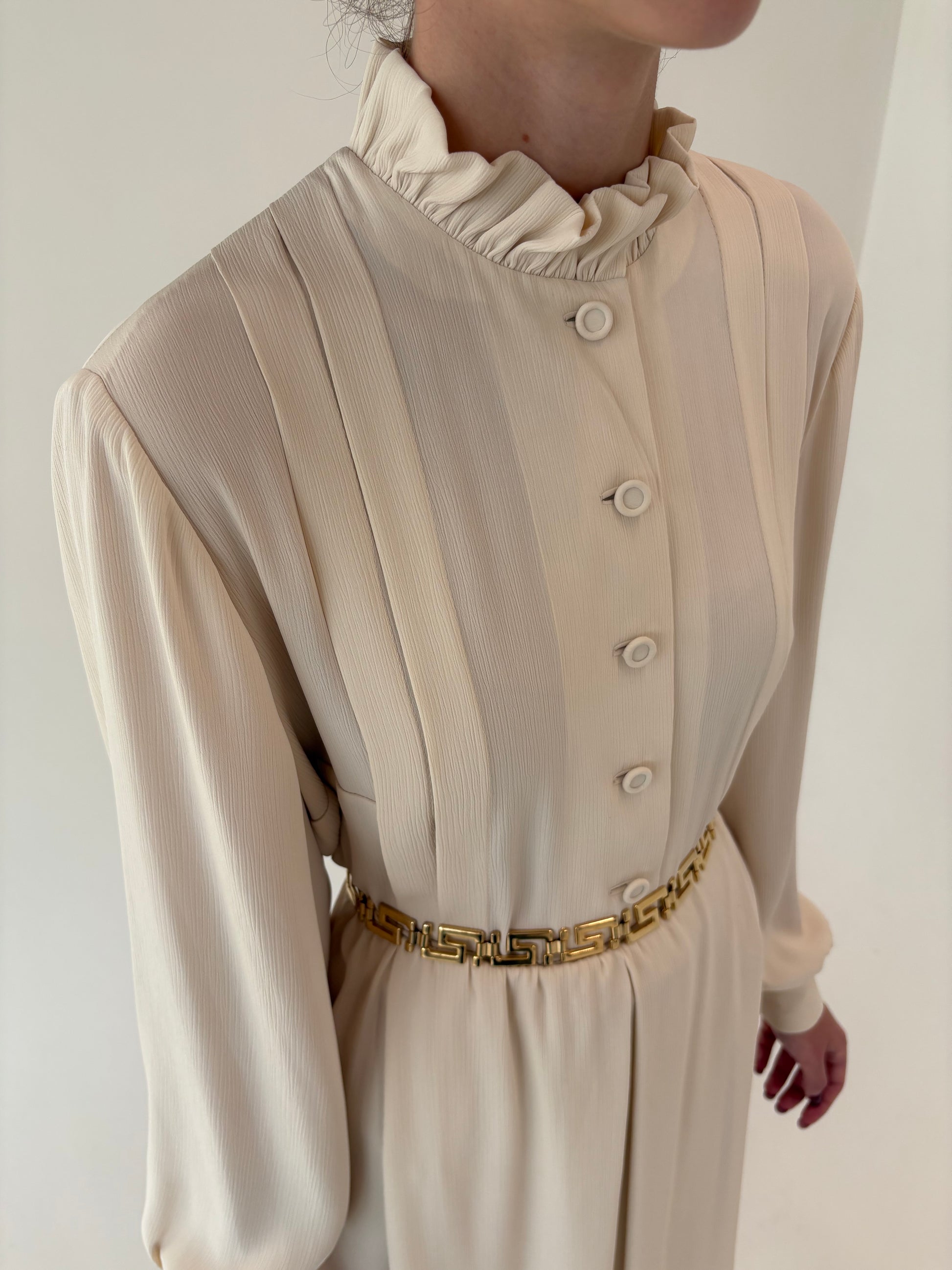 Gulerul înalt plisat și mânecile bufante cu manșetă sunt caracteristice rochiilor elegante din anii 70 târzii
