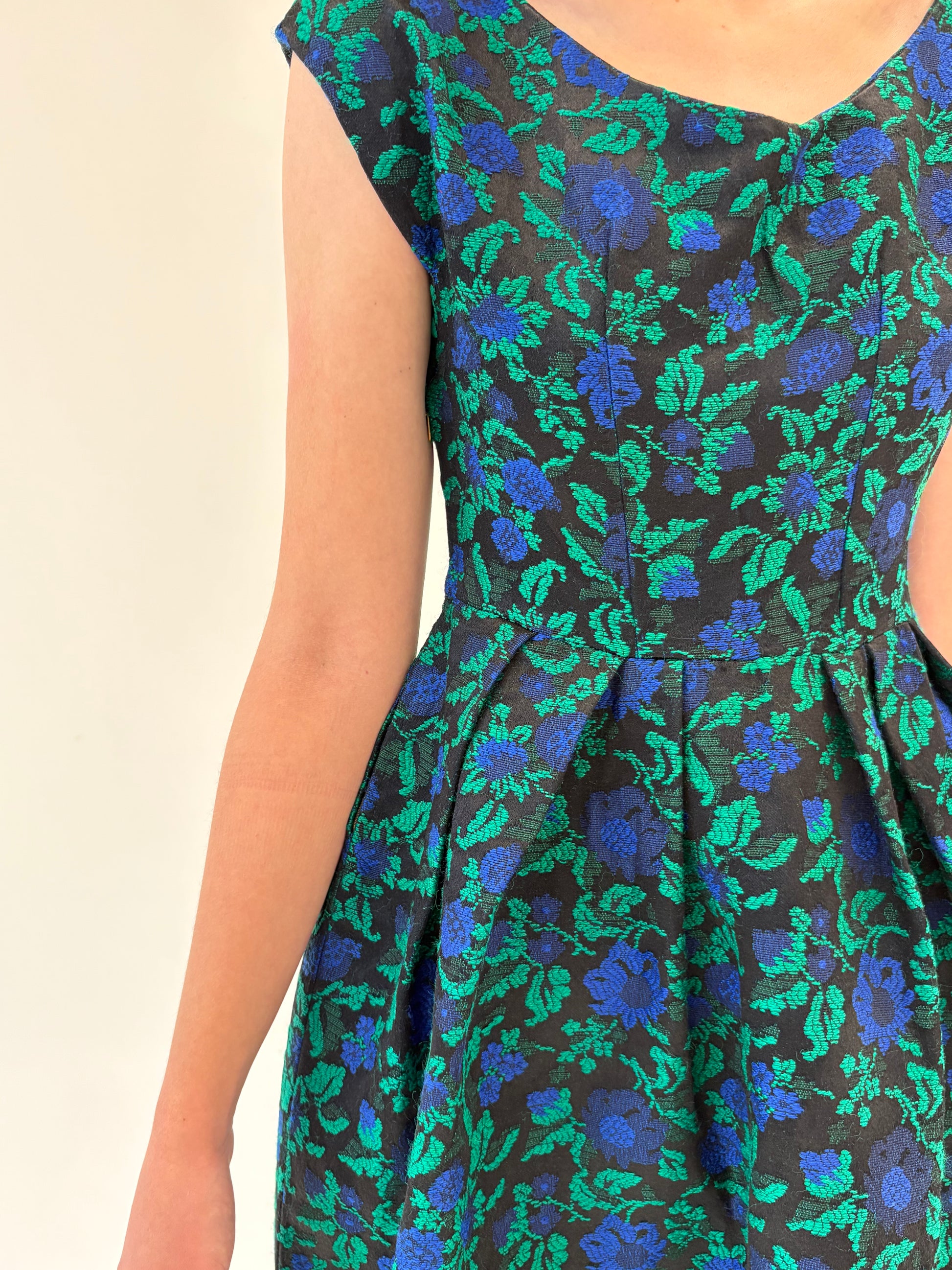 – Rochia este din brocart gros de lână cu imprimeu floral în albastru și verde pe fond negru