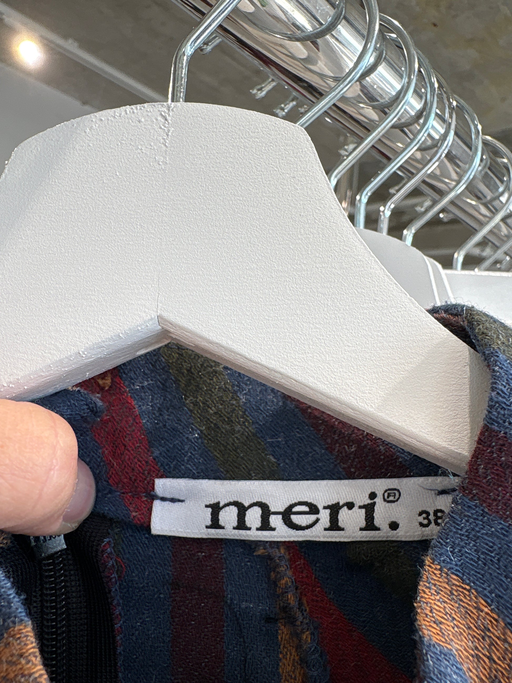 –combinația de dungi verticale multicolore în nuanțe calde (ocru, burgund, bleumarin, verde măsliniu) este tipică imprimeurilor de la sfârșitul anilor ’70, când se preferau texturile vizibil țesute și firele ușor melanj