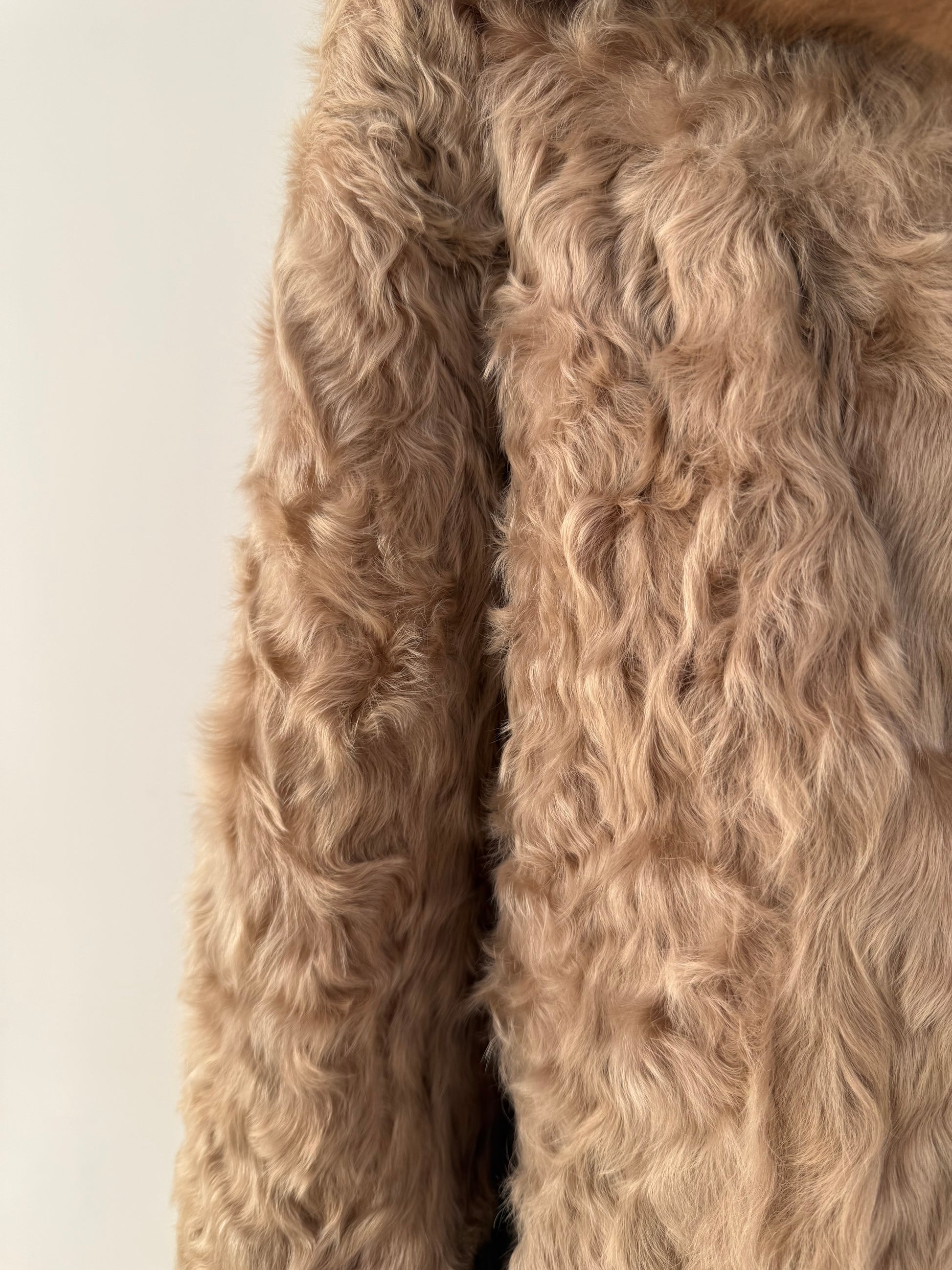 Blană vintage luxury mouton frisé light camel cu guler din blană de nurcă