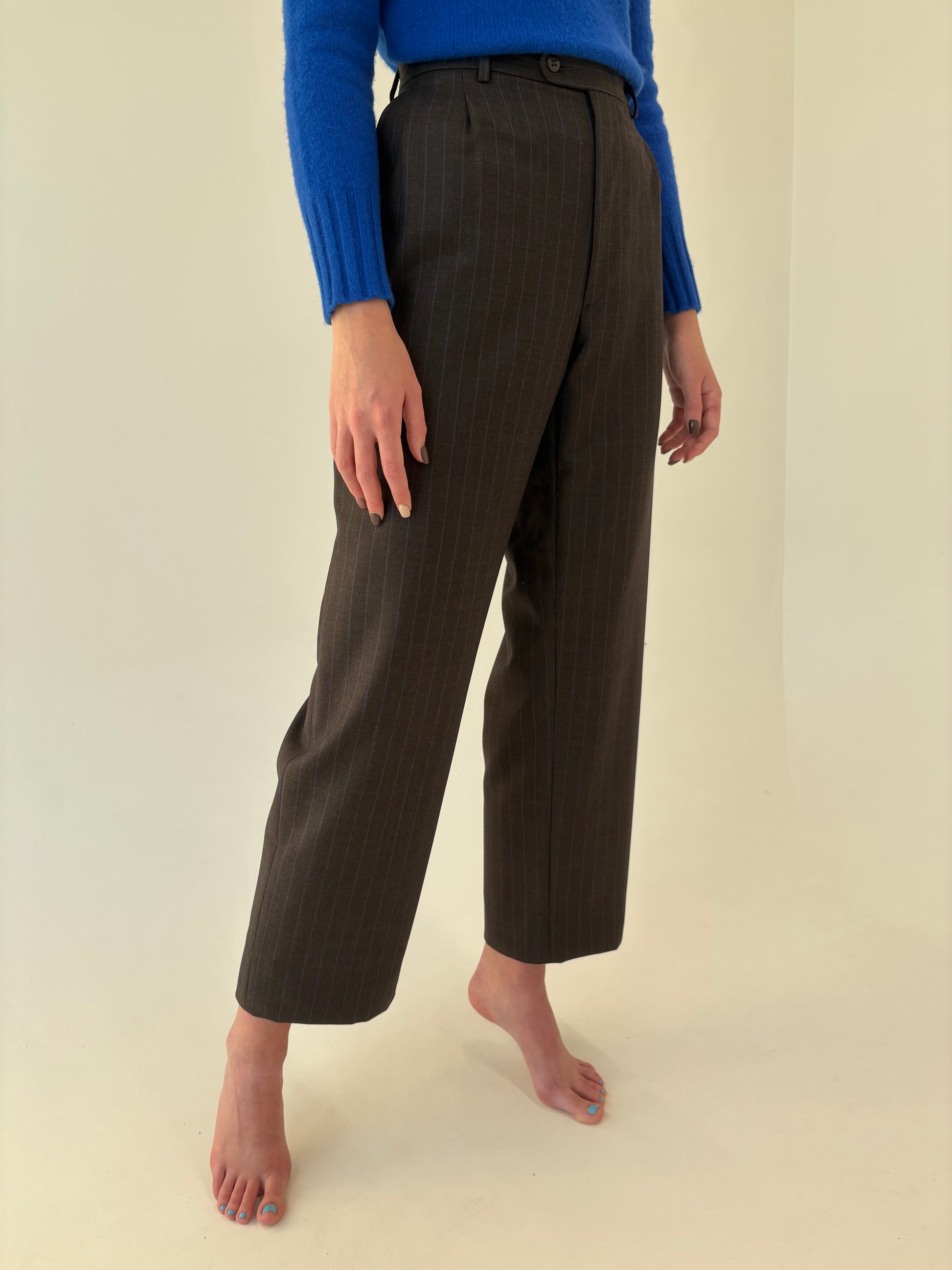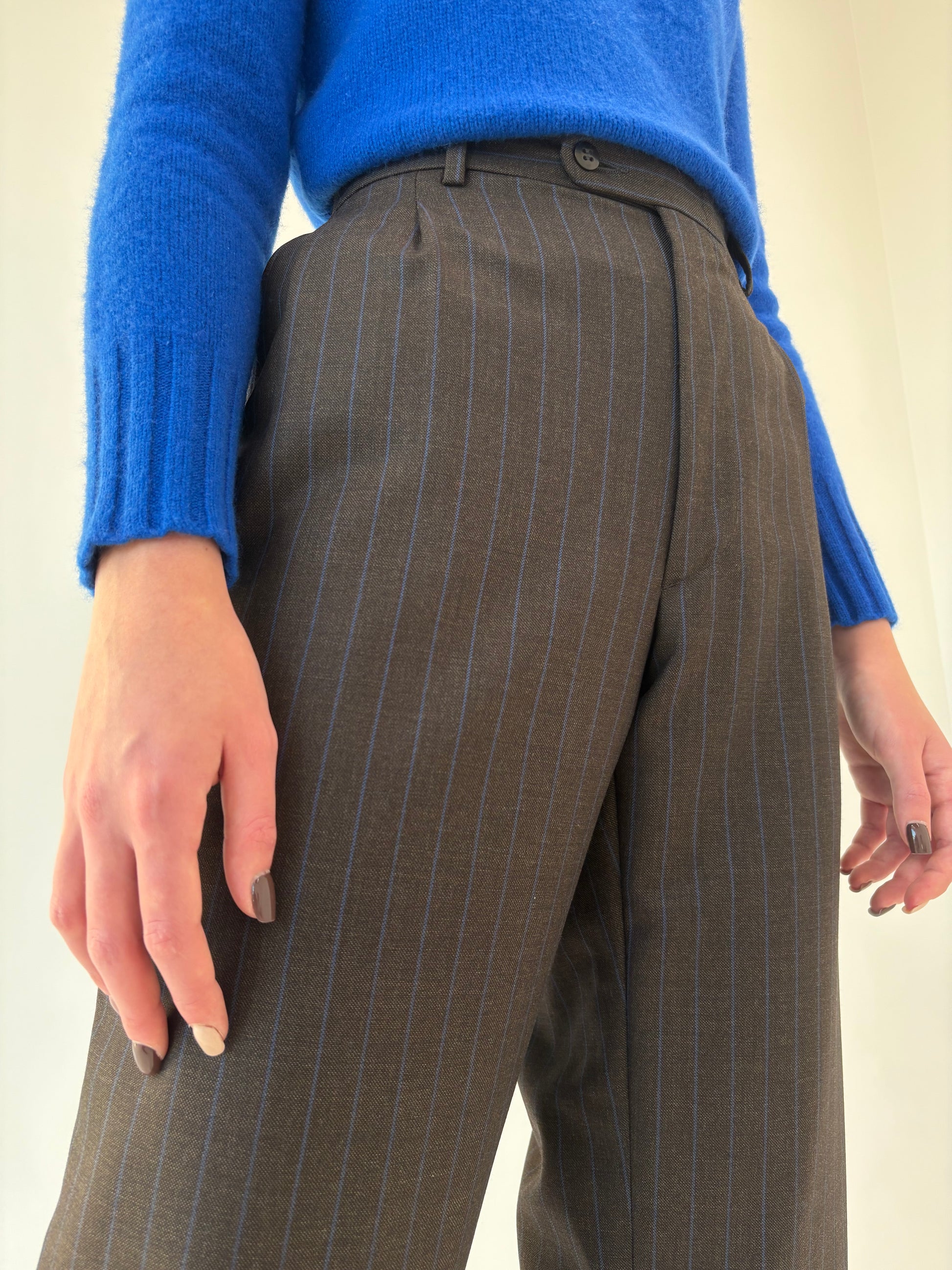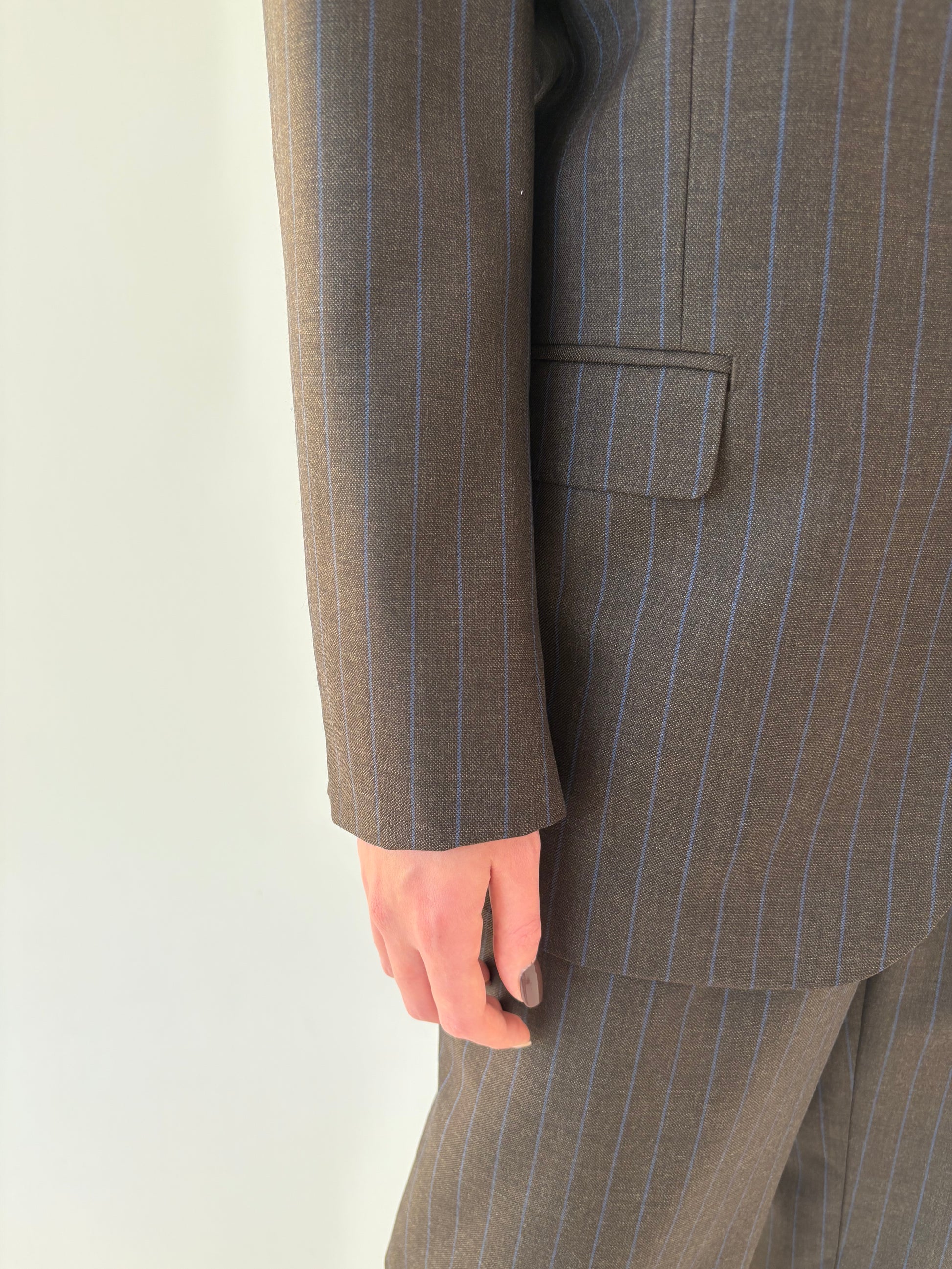 Costum italian chocolate brown cu dungi fine verticale albastru regal