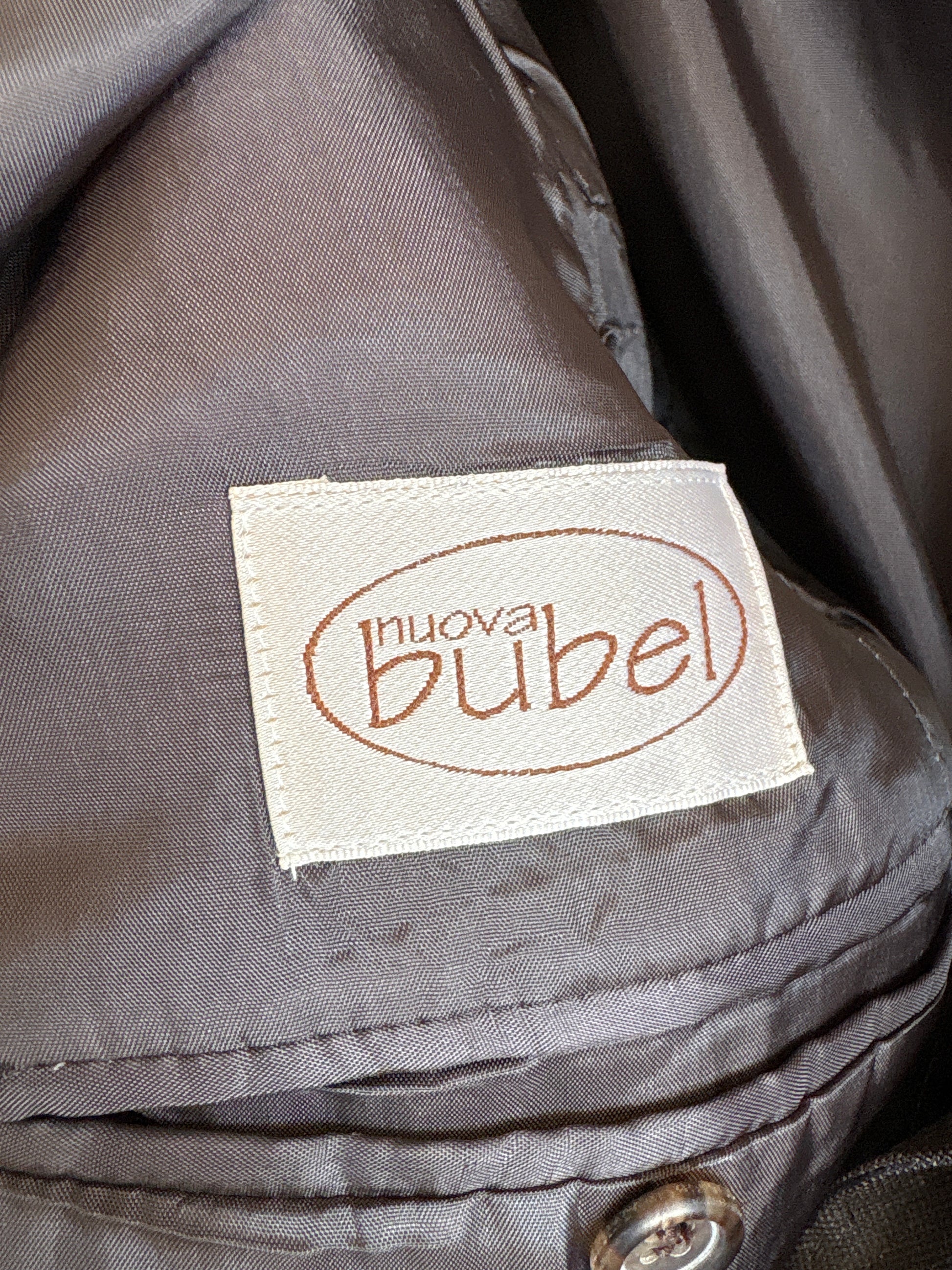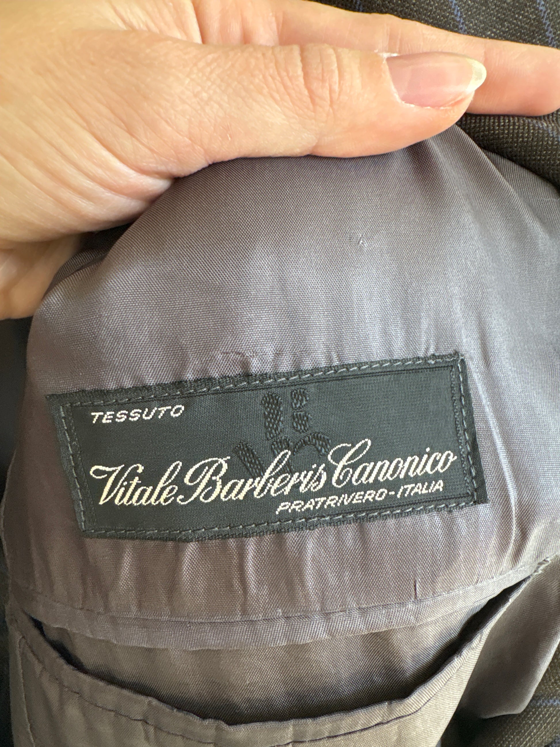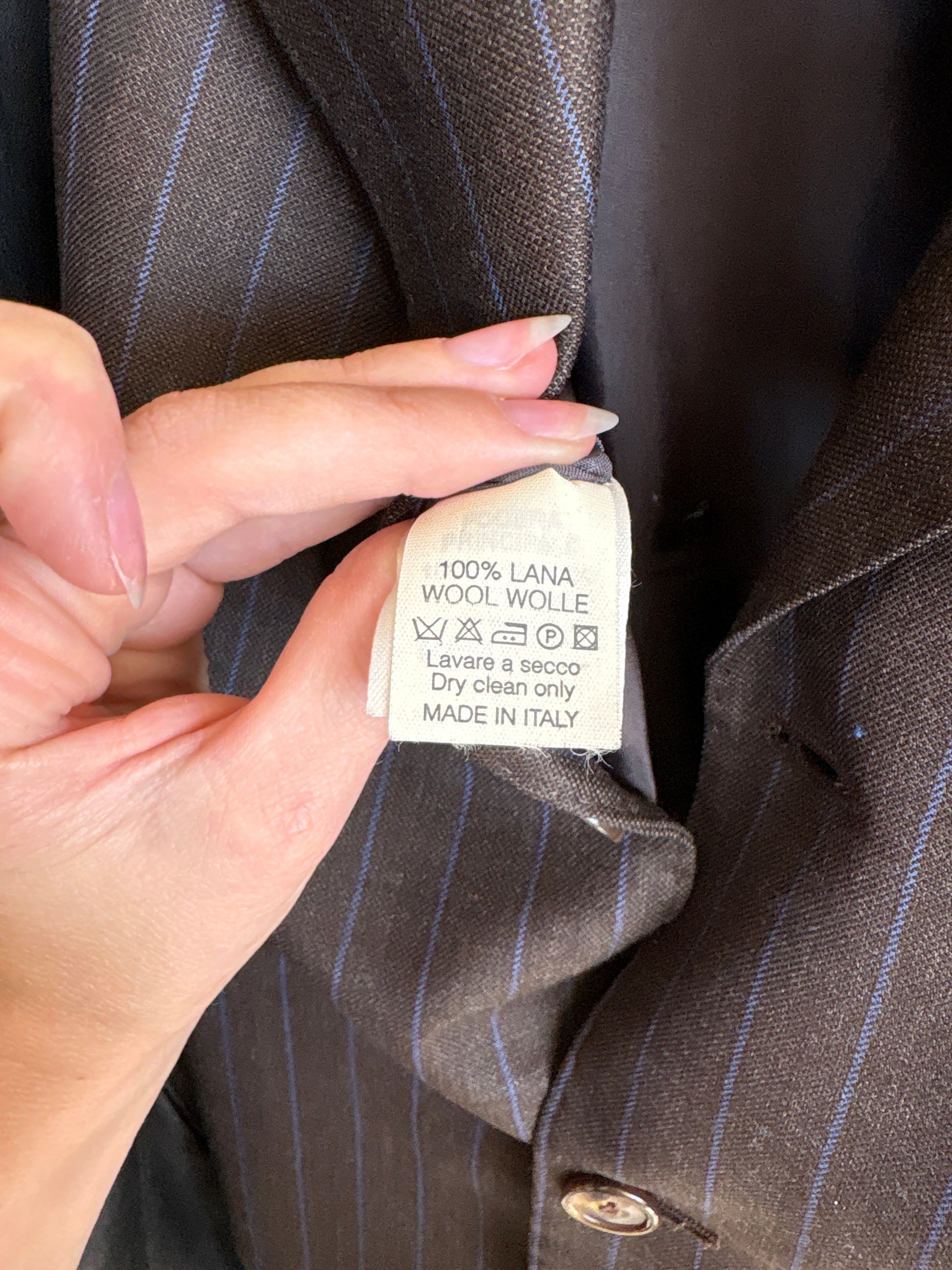 Costum italian chocolate brown cu dungi fine verticale albastru regal