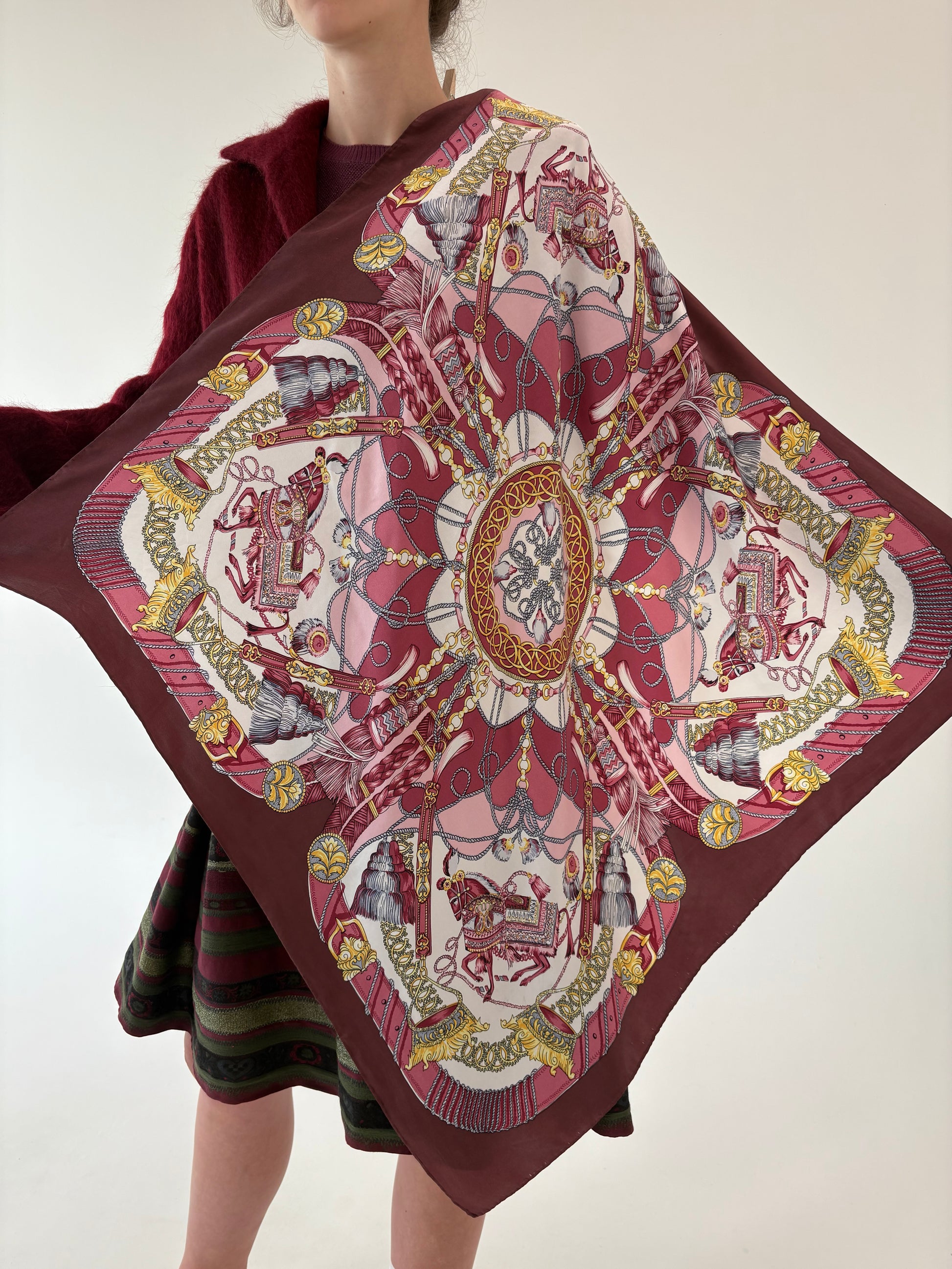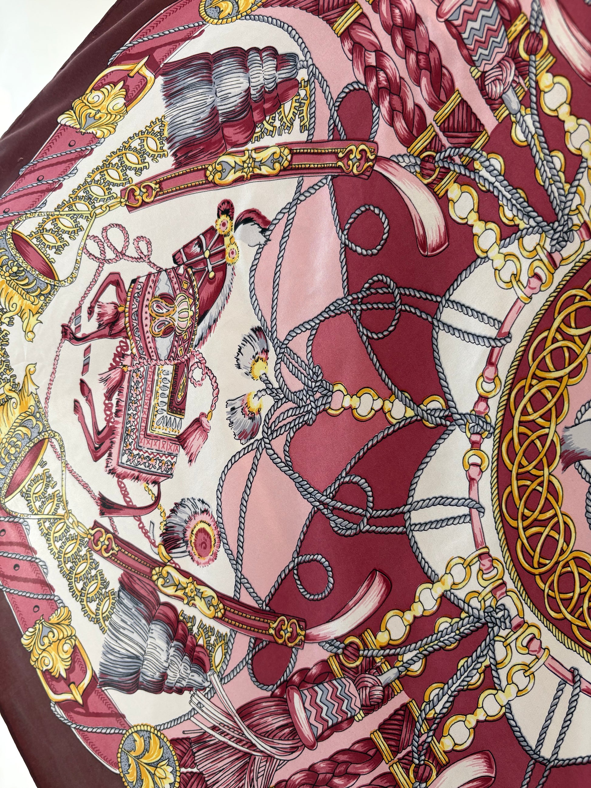 Eșarfă XXL cu print baroc cu burgundy și roz pudrat din mătase naturală