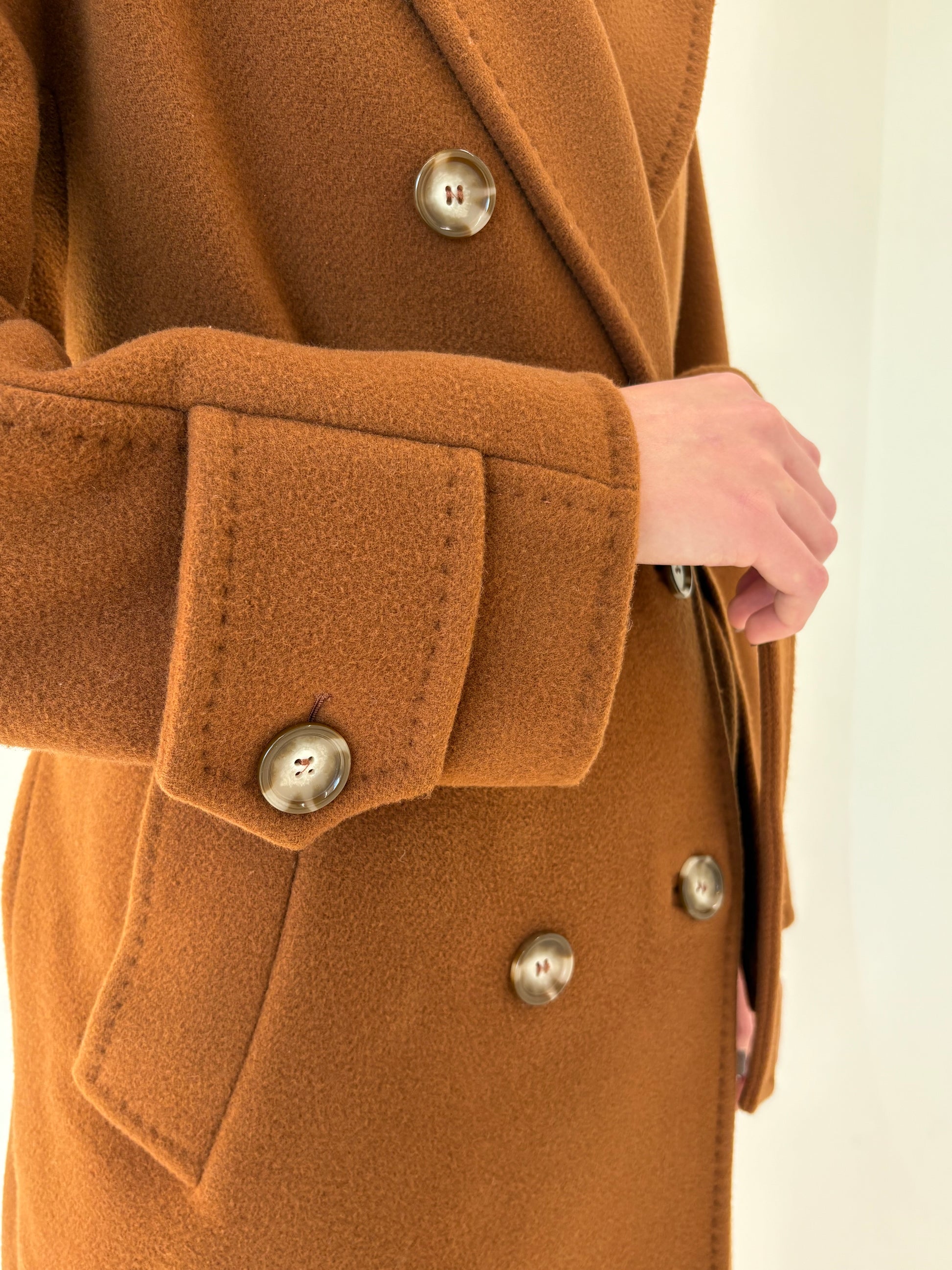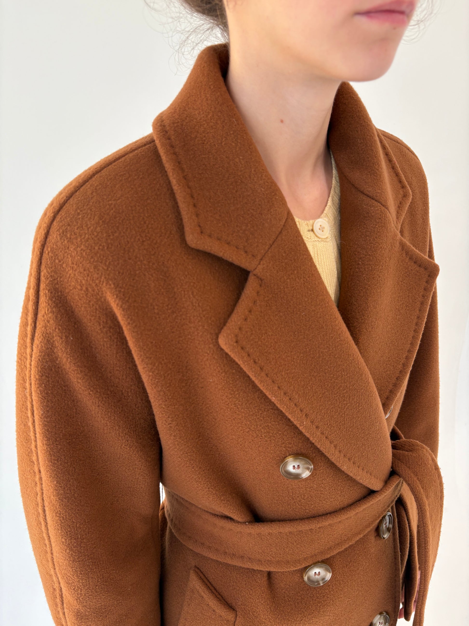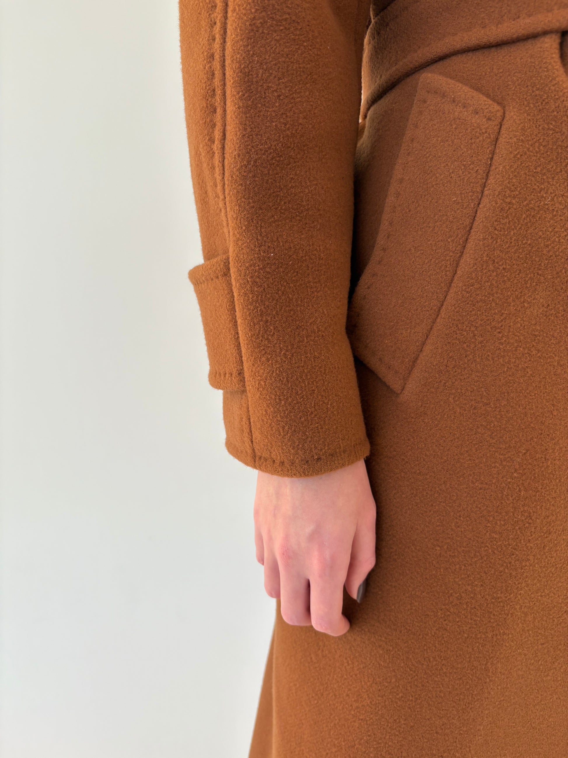 Palton caramel din stofă plină de lana cu cordon și cusături decorative