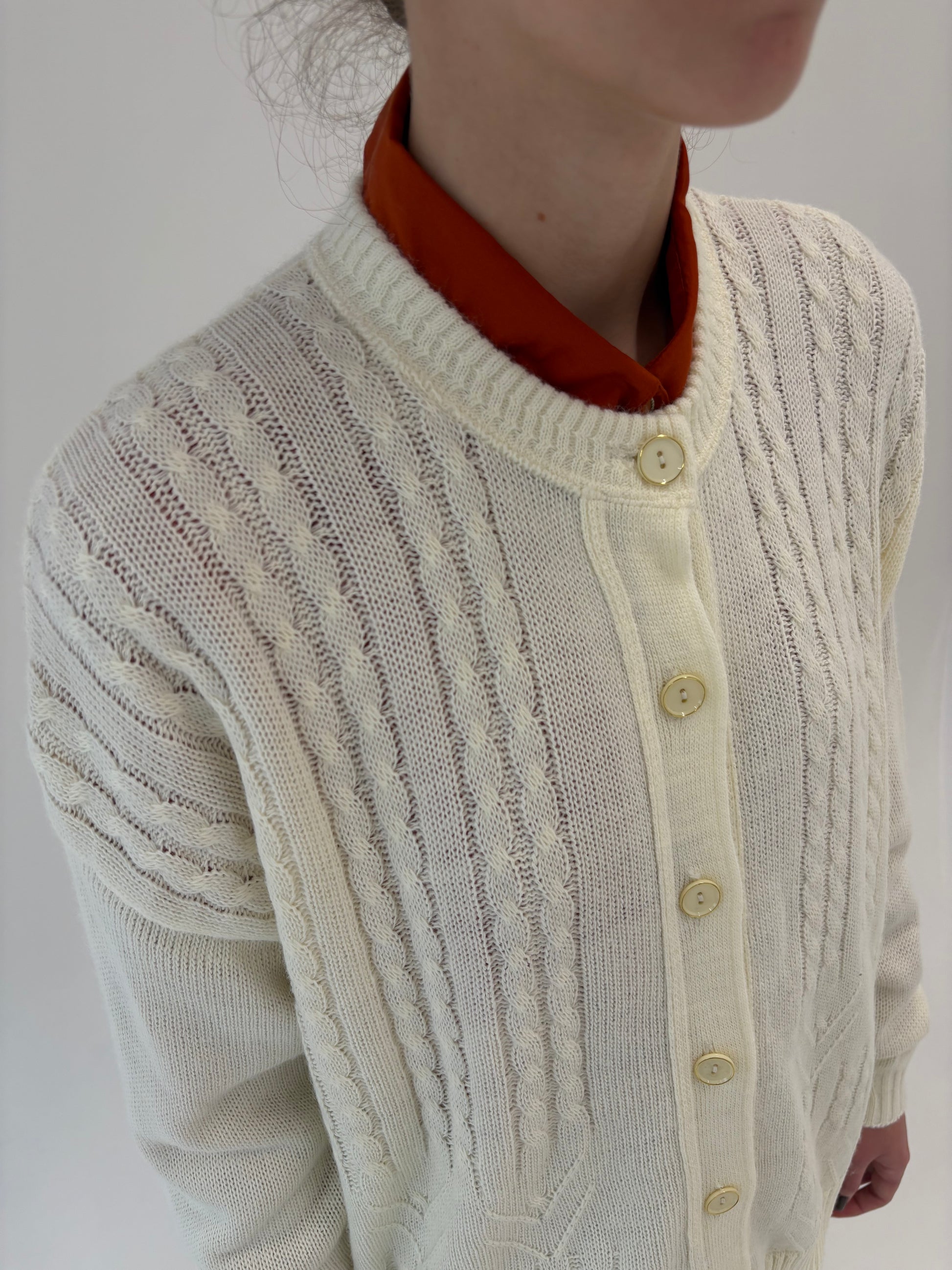 Cardigan vintage butter white cu torsade din lana extrafina plină