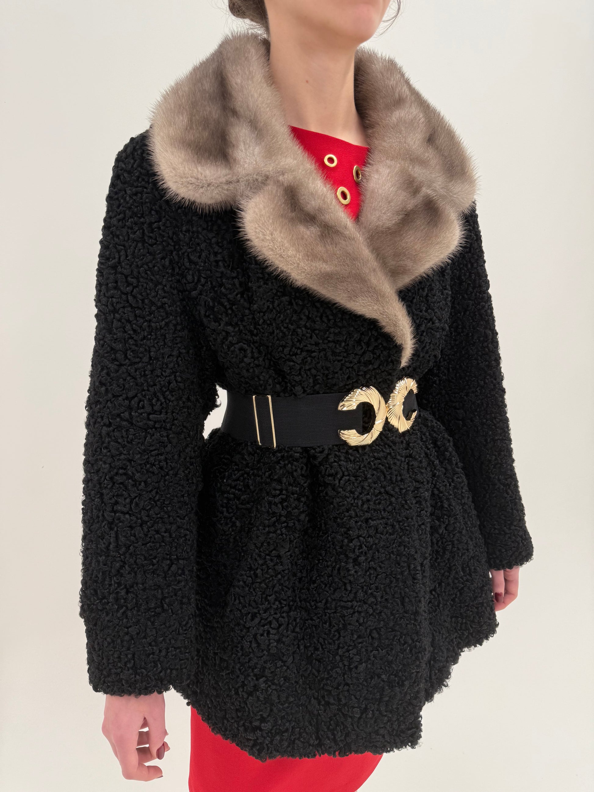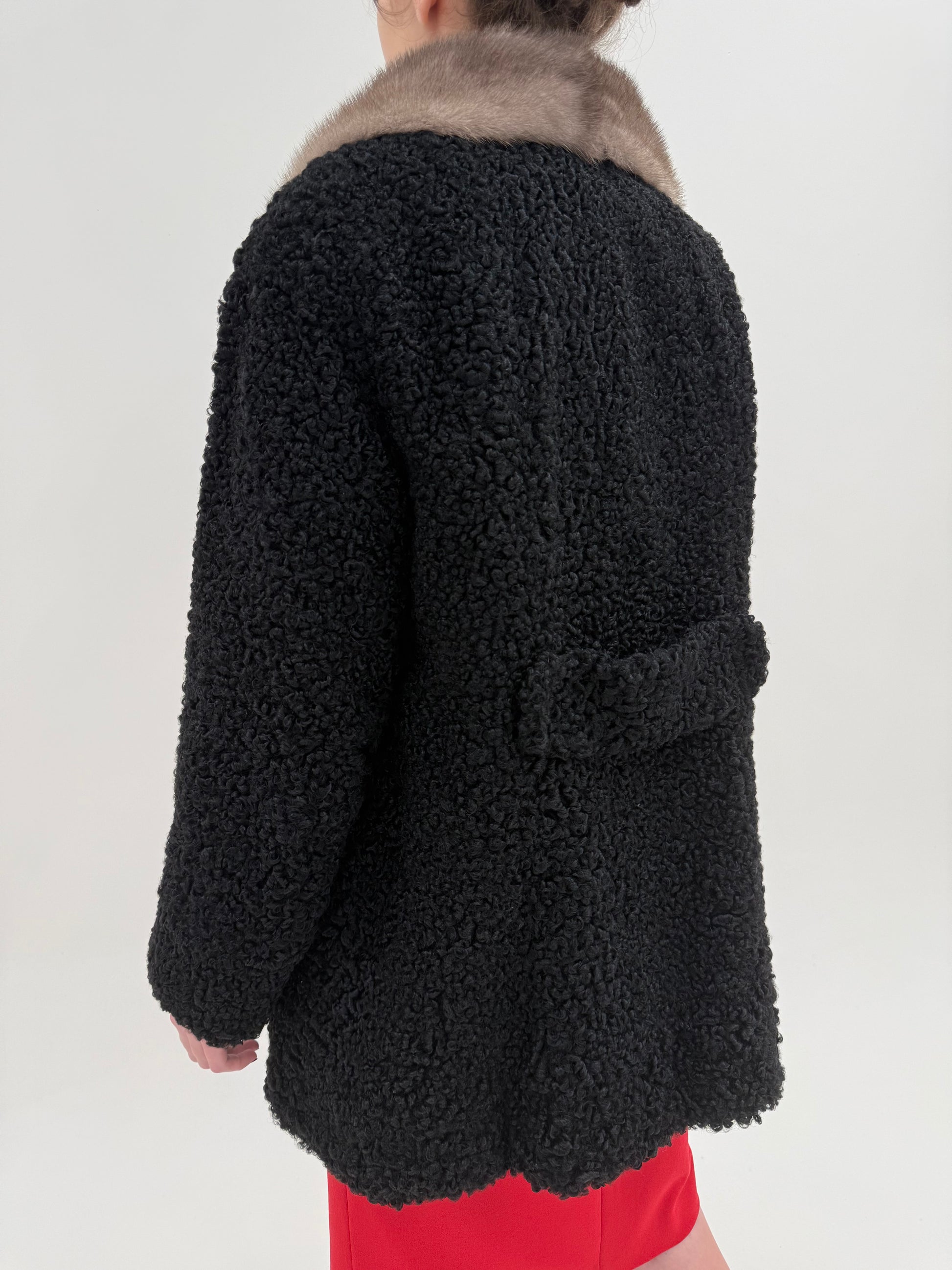 Blană naturală de miel Karakul cu guler din blană naturală de nurcă