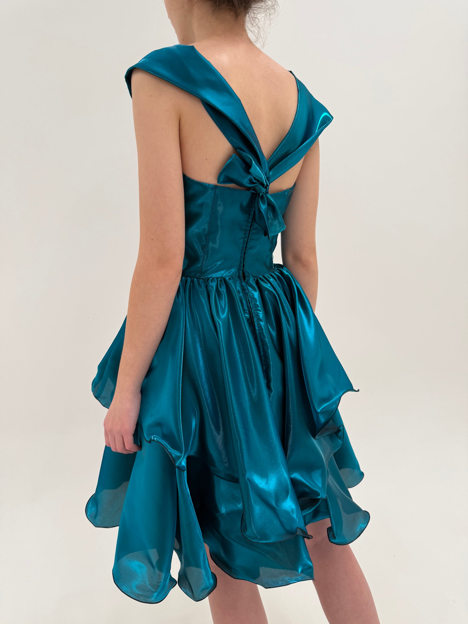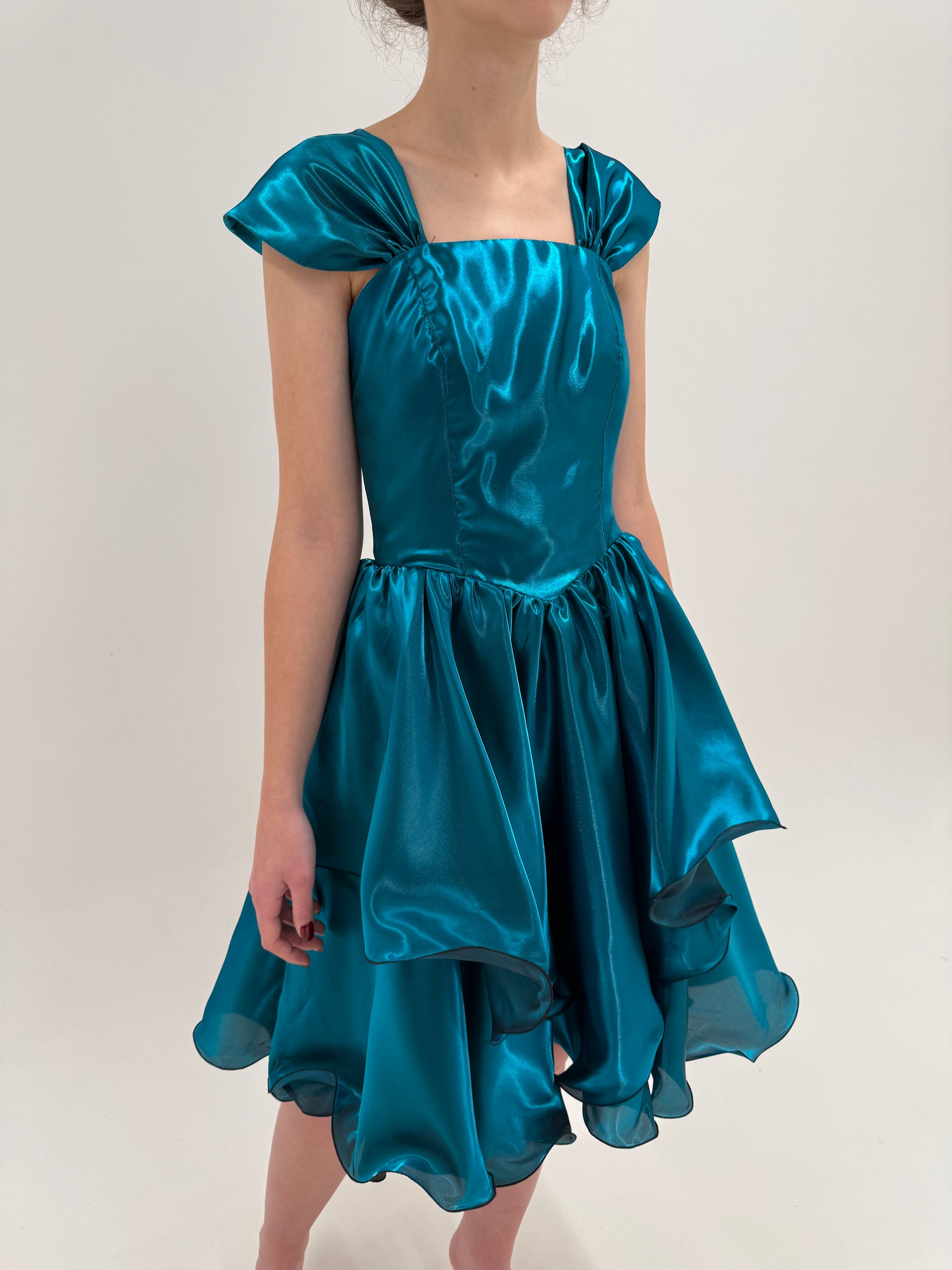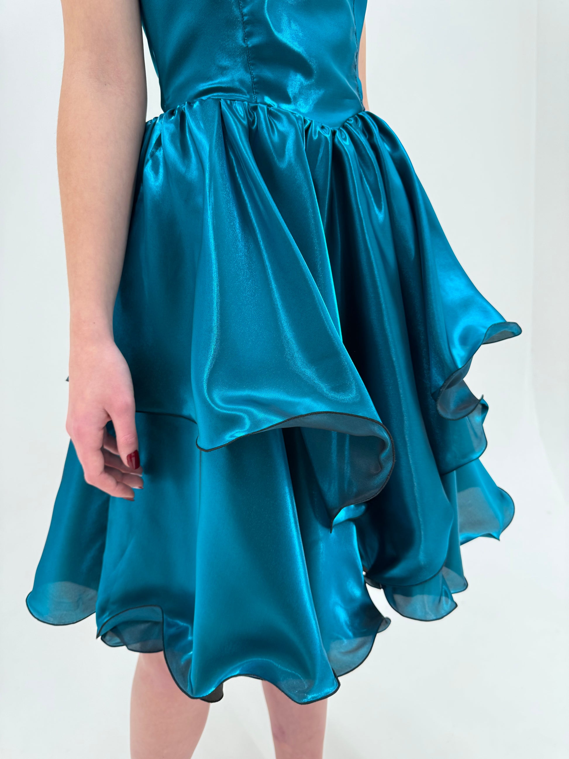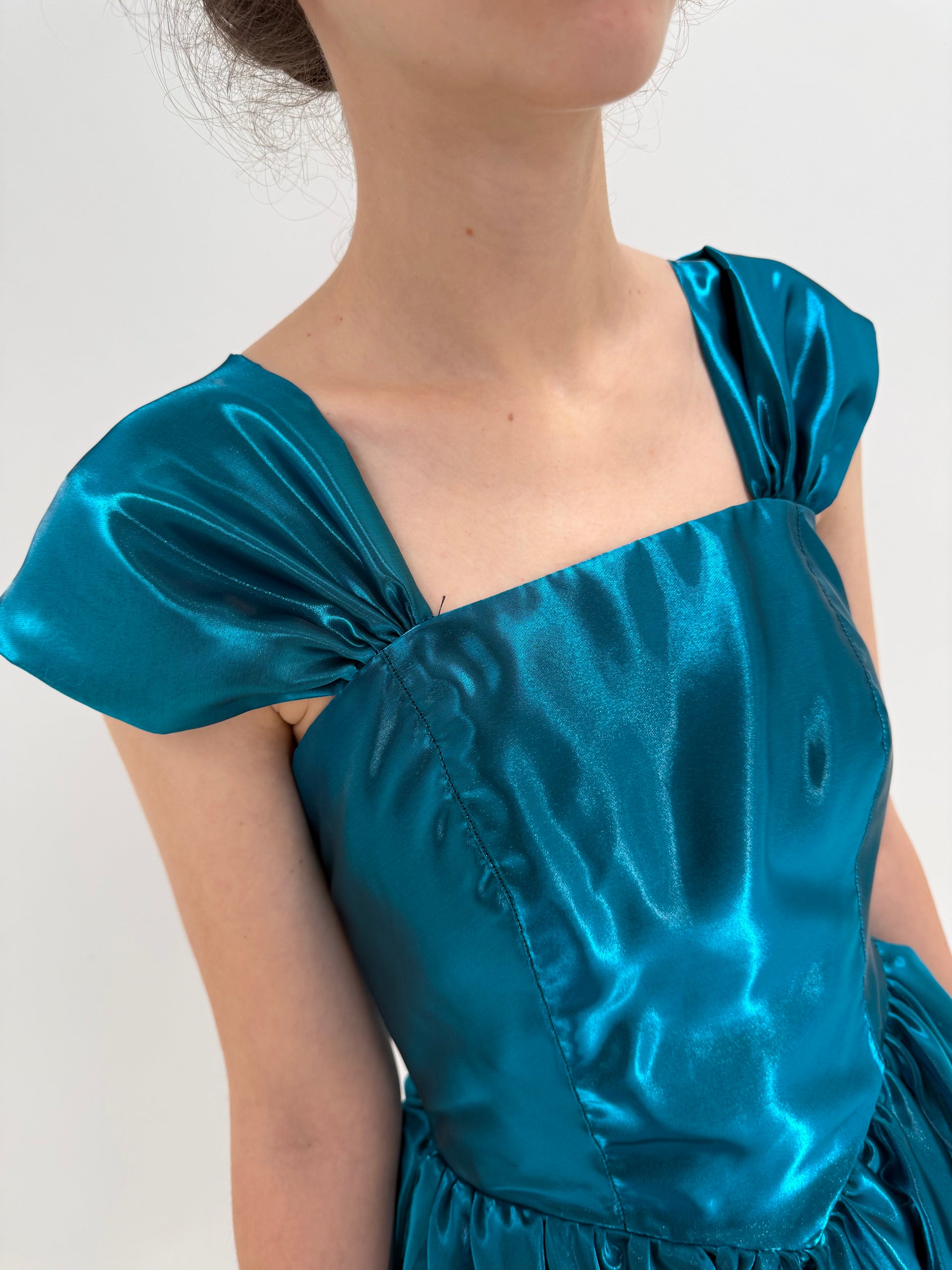 Talie bine marcată, bust construit, fustă amplă cu volane suprapuse și muchii ondulate. Această combinație de structură sus și dramatism jos este tipică perioadei. Decolteul în V adânc pe spate, cu panglică legată decorativ, este un detaliu extrem de specific sfârșitului de ani ’80. Este feminin, teatral, dar încă elegant, înainte de minimalismul dur al anilor ’90