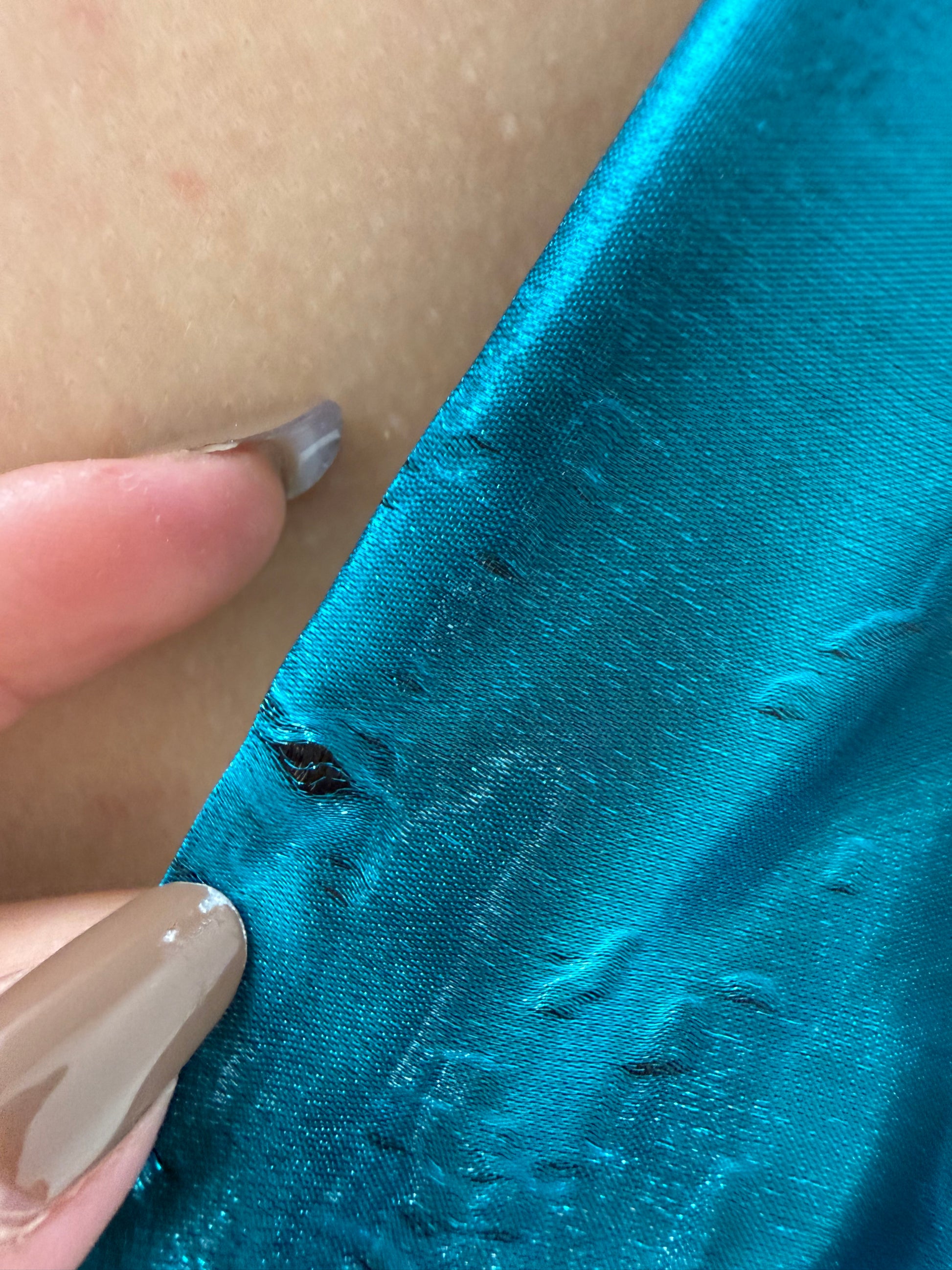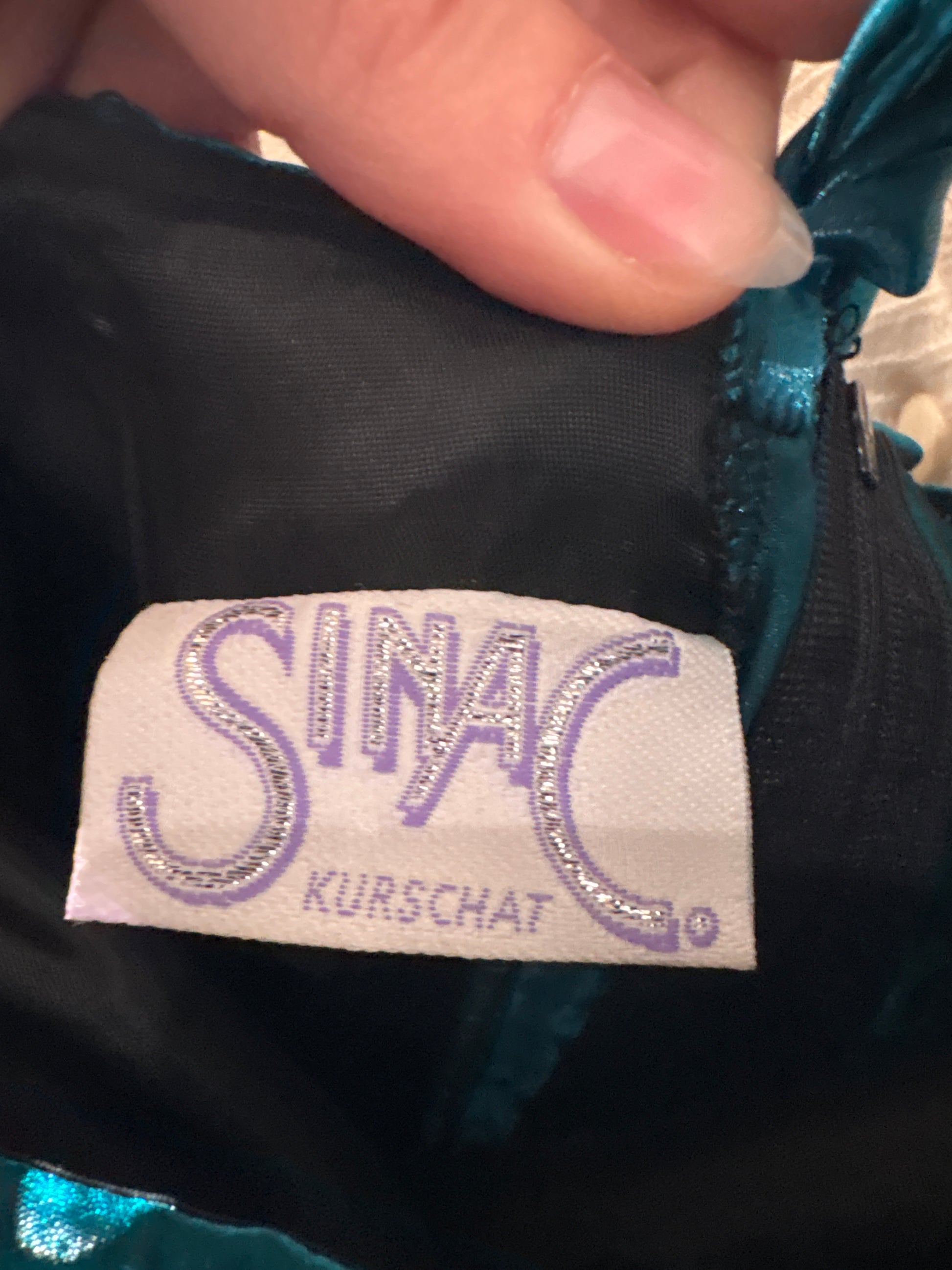 satin cu luciu intens, fluid dar cu corp, de calitate foarte bună, cu efect “wet look”, acest tip de material era extrem de popular pentru rochii de seară și cocktail, fiind asociat cu ideea de glamour modern, lumină artificială și mișcare.