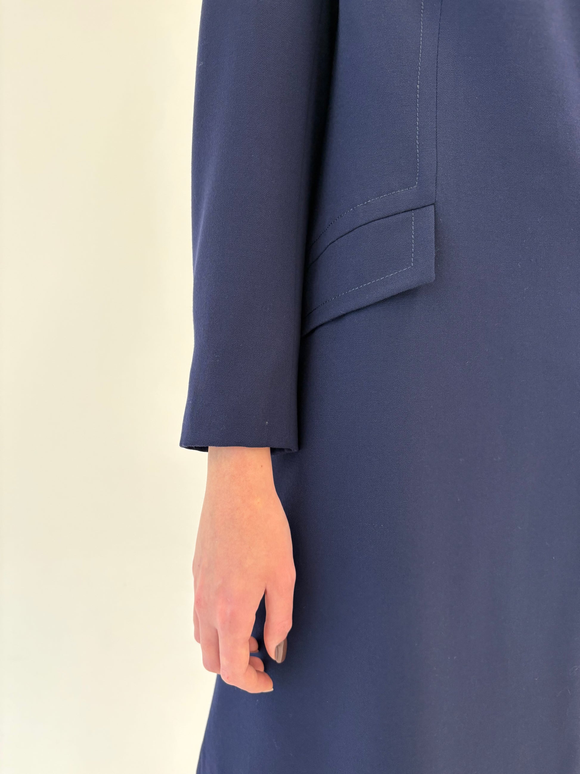 lungimea midi și închiderea cu patru nasturi mari sunt detalii clasice pentru paltoanele urbane de tranziție dintre deceniile 70 spre 80