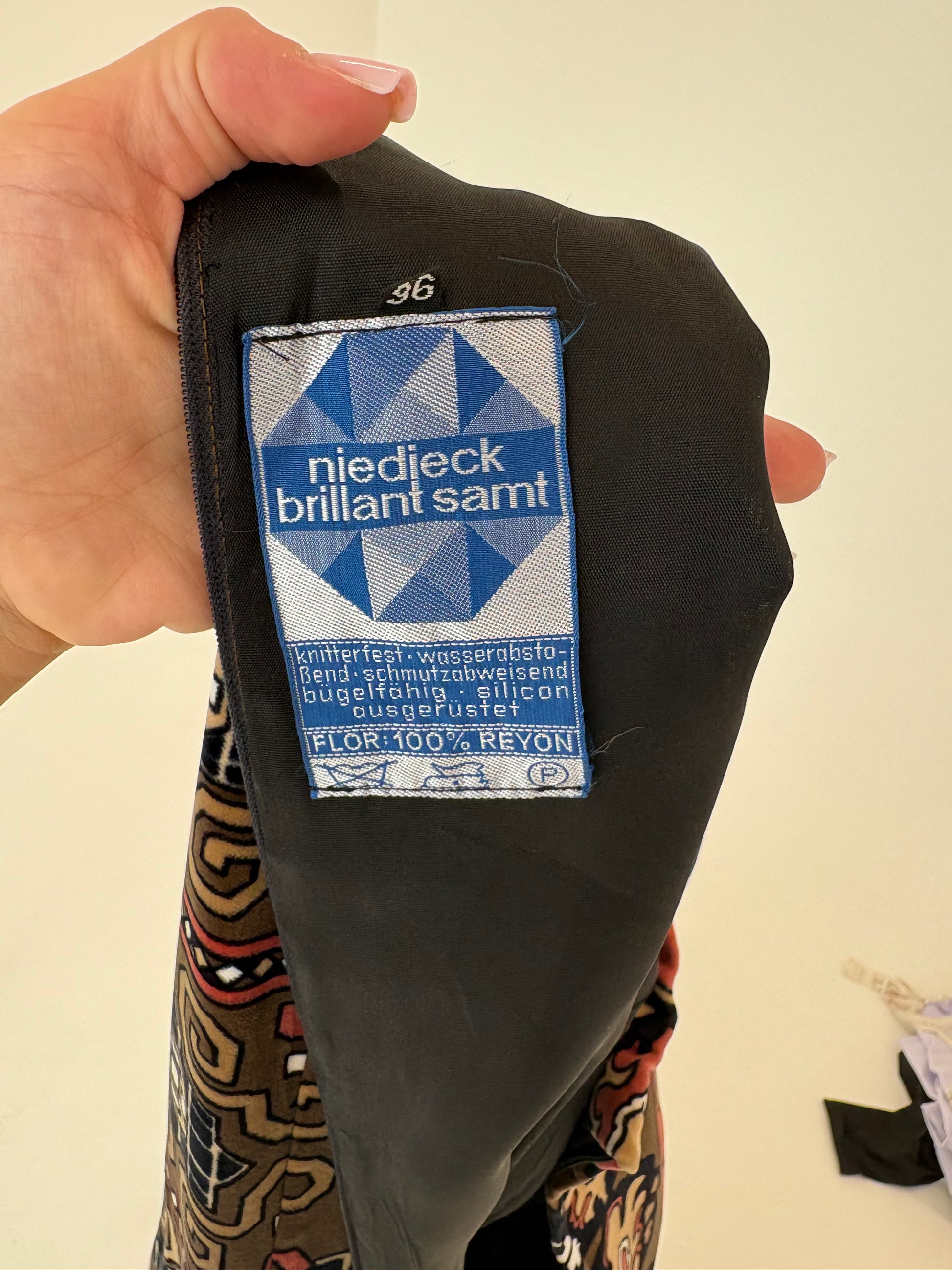 Materialul este „niedjeck brillant samt” – un tip de catifea din vâscoza foarte folosită în anii 60 pentru imprimeuri viu colorate și rezistente