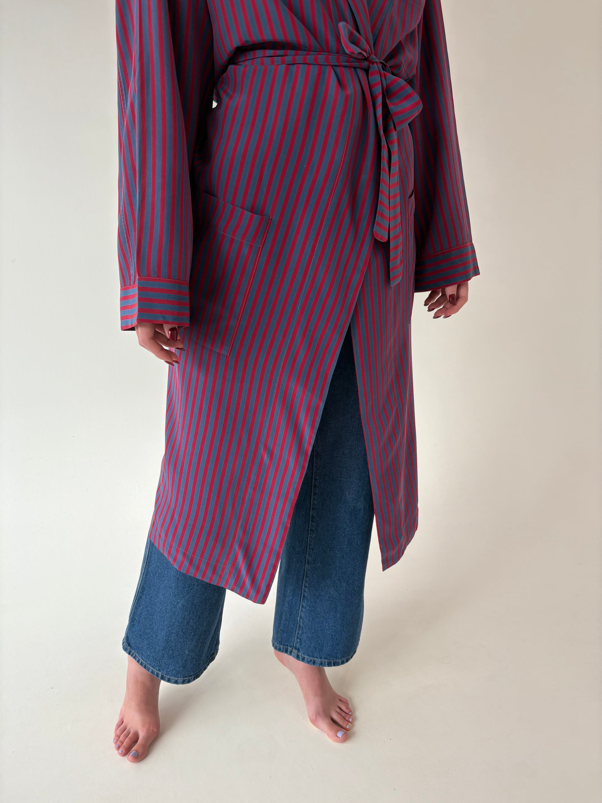 Propus pe post de rochie sau sacou, obligatoriu lejer sau oversized - Croiala tip kimono/halat cu cordon, buzunare mari aplicate și linii fluide reflectă stilul lounge luxos foarte popular în anii ’70, când pijamalele și halatele elegante din mătase erau purtate ca piese de zi