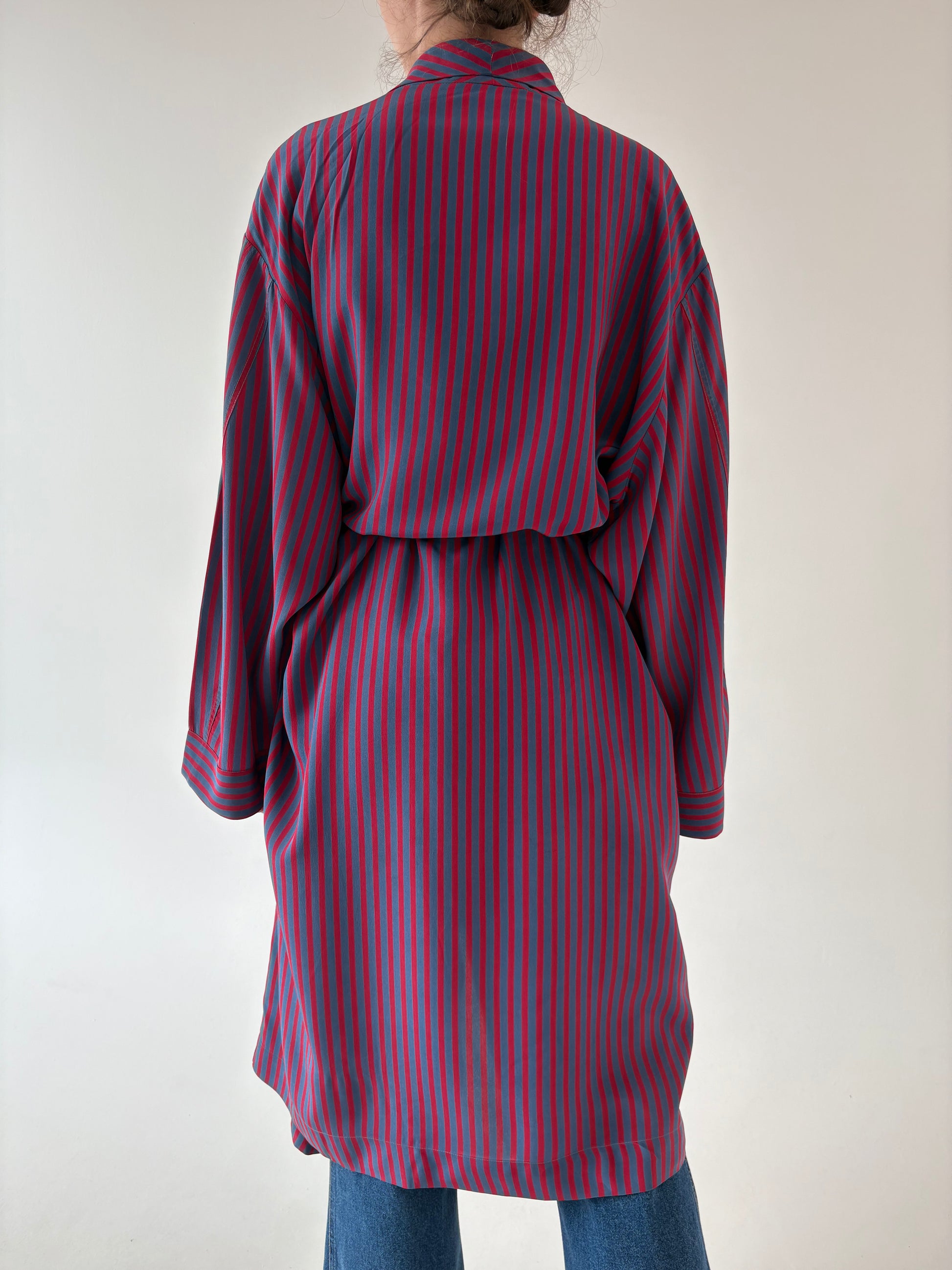 Combinarea dungilor verticale în culori contrastante (roșu și albastru petrol) este o alegere estetică frecvent întâlnită în designurile Lanvin din deceniul 1970