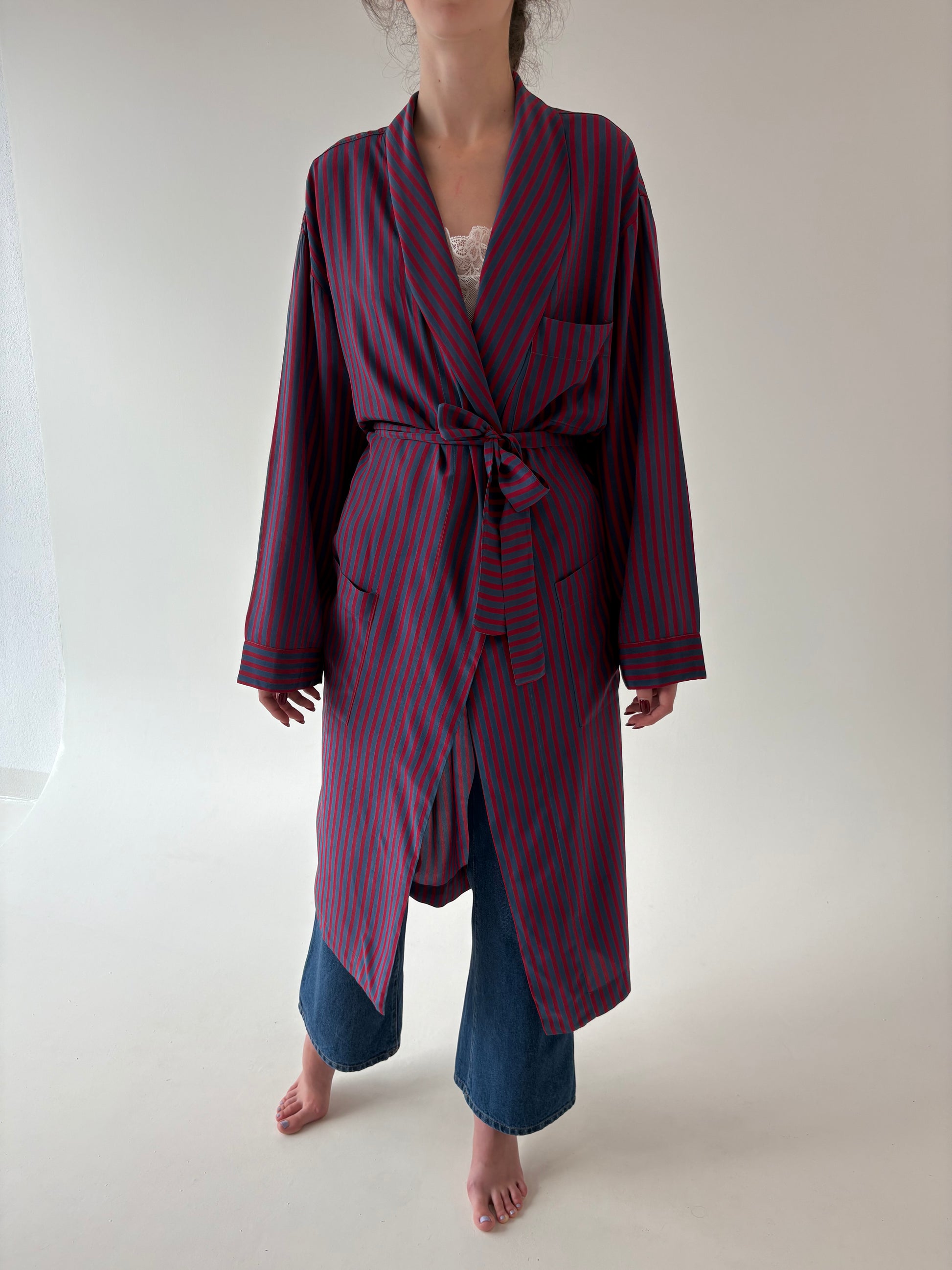 Croiala tip kimono/halat cu cordon, buzunare mari aplicate și linii fluide reflectă stilul lounge luxos foarte popular în anii ’70, când pijamalele și halatele elegante din mătase erau purtate ca piese de zi