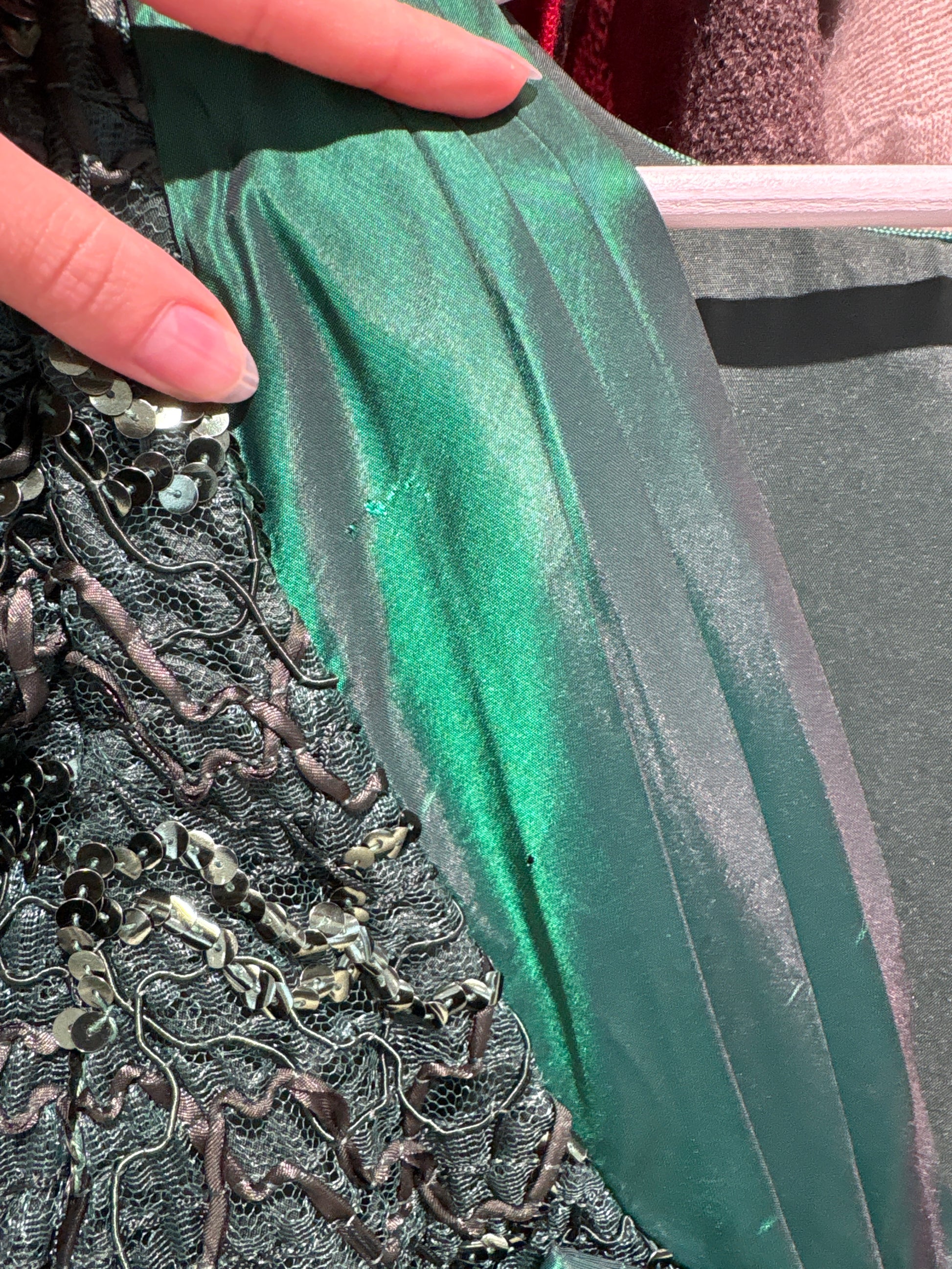 – Materialul pare a fi un mix de dantelă brodată cu paiete discrete + tafta de mătase pentru fustă, foarte frecvent în acea perioada