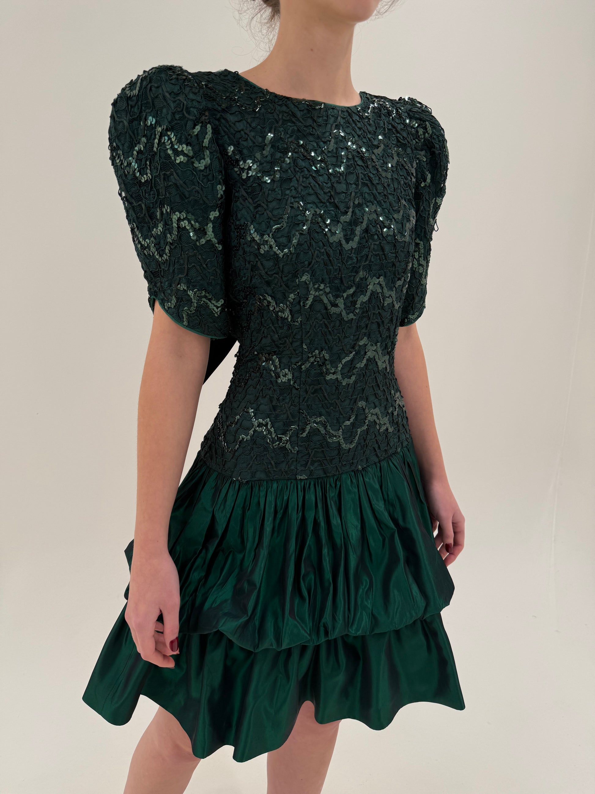 Talie foarte bine marcată, cu corp ajustat și fustă cu volum stratificat, tip “party dress” de final de deceniu