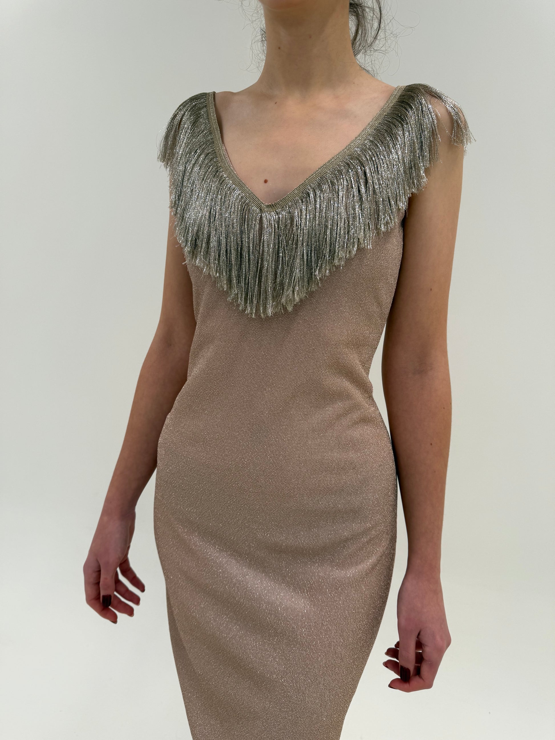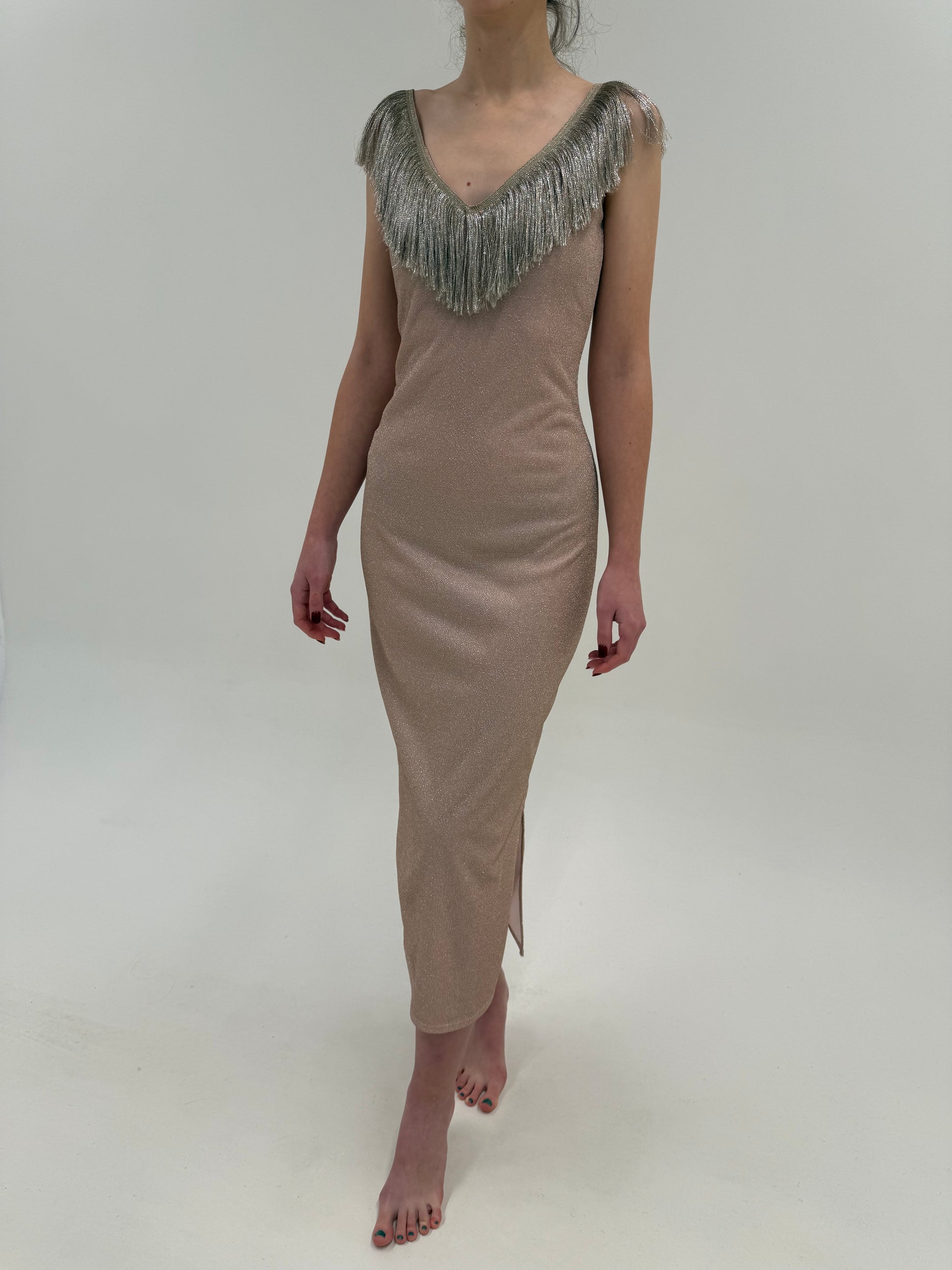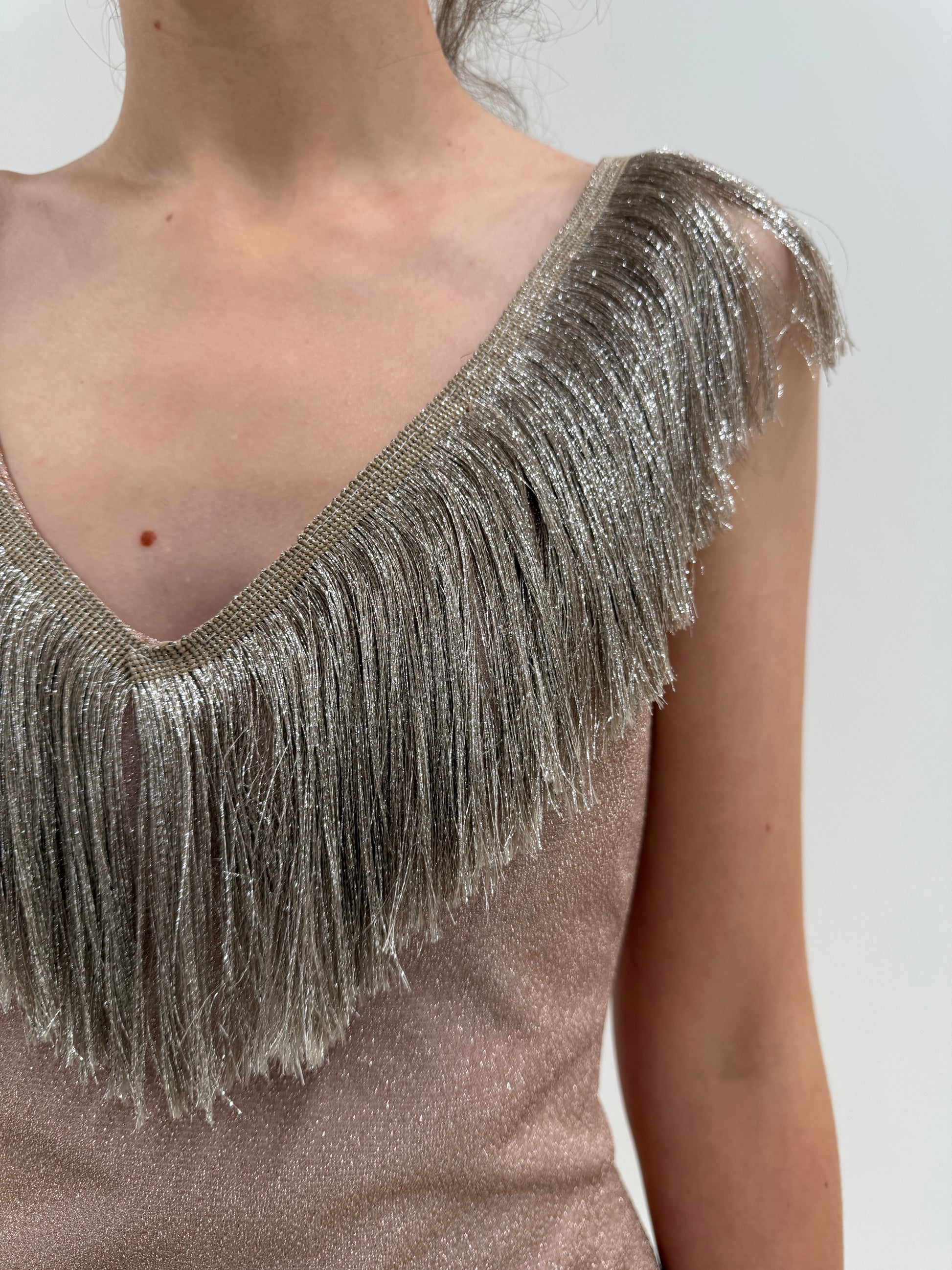 Rochie vintage maxi powder pink cu franjuri și inserții extrafine argintii