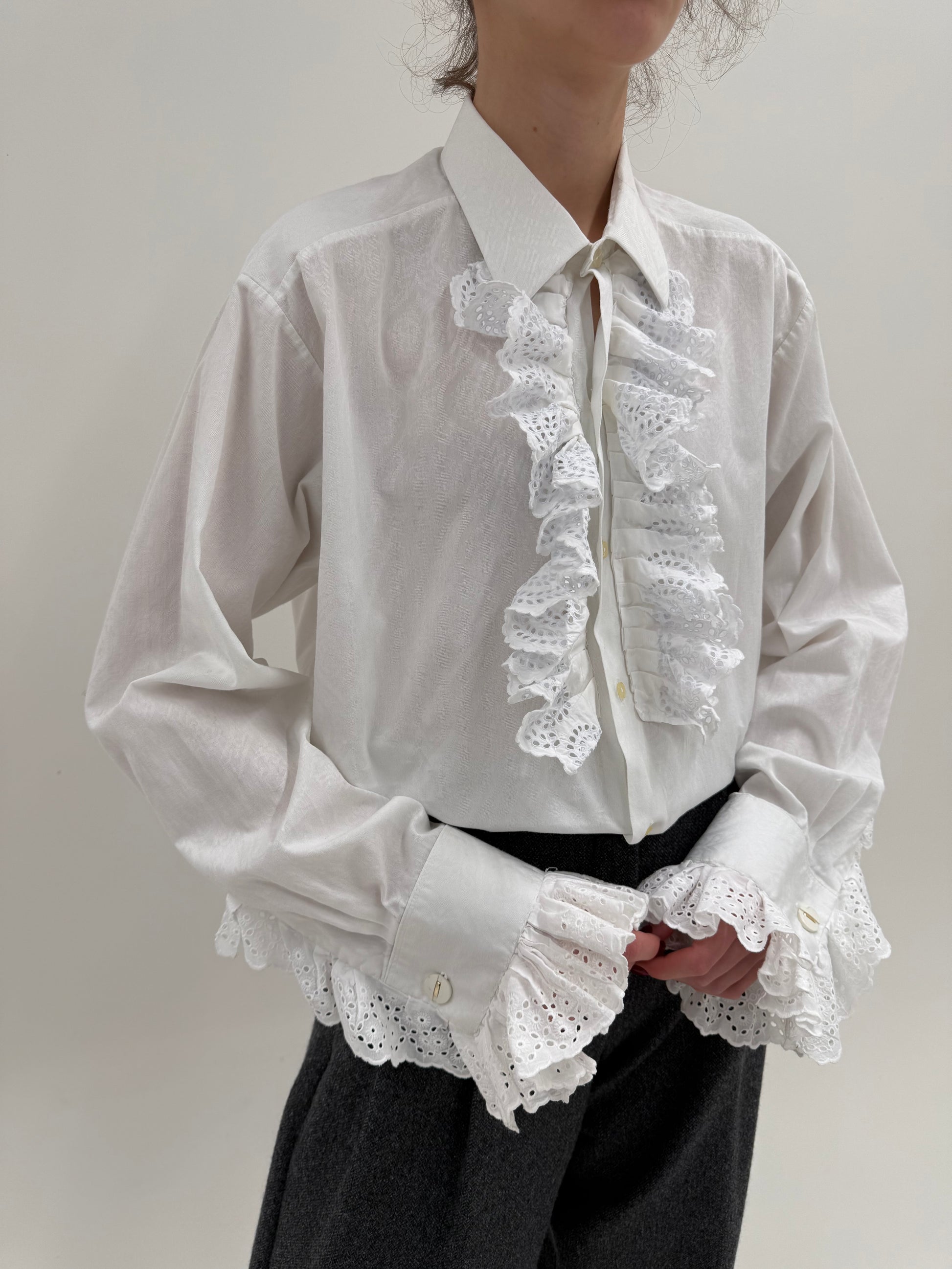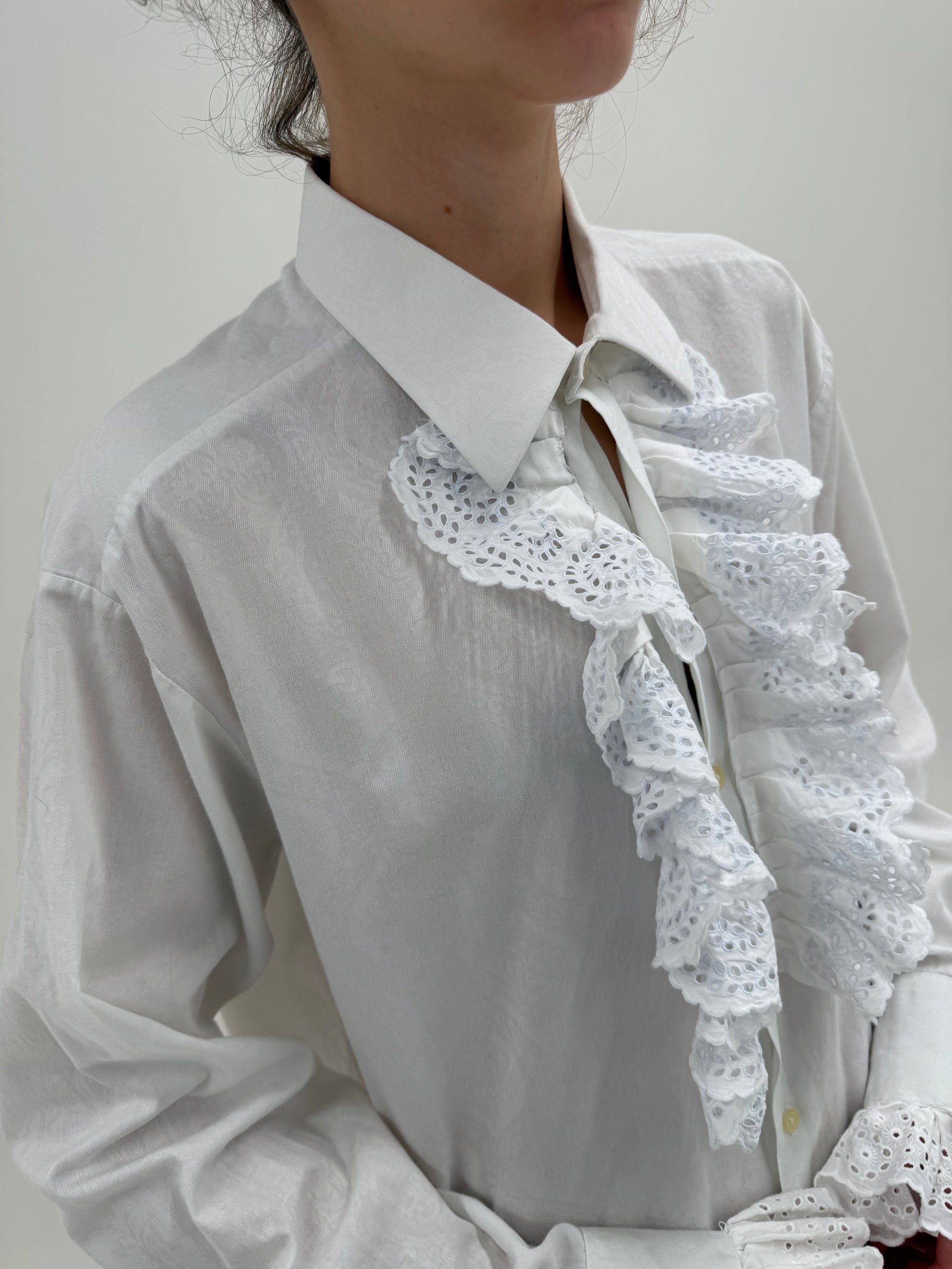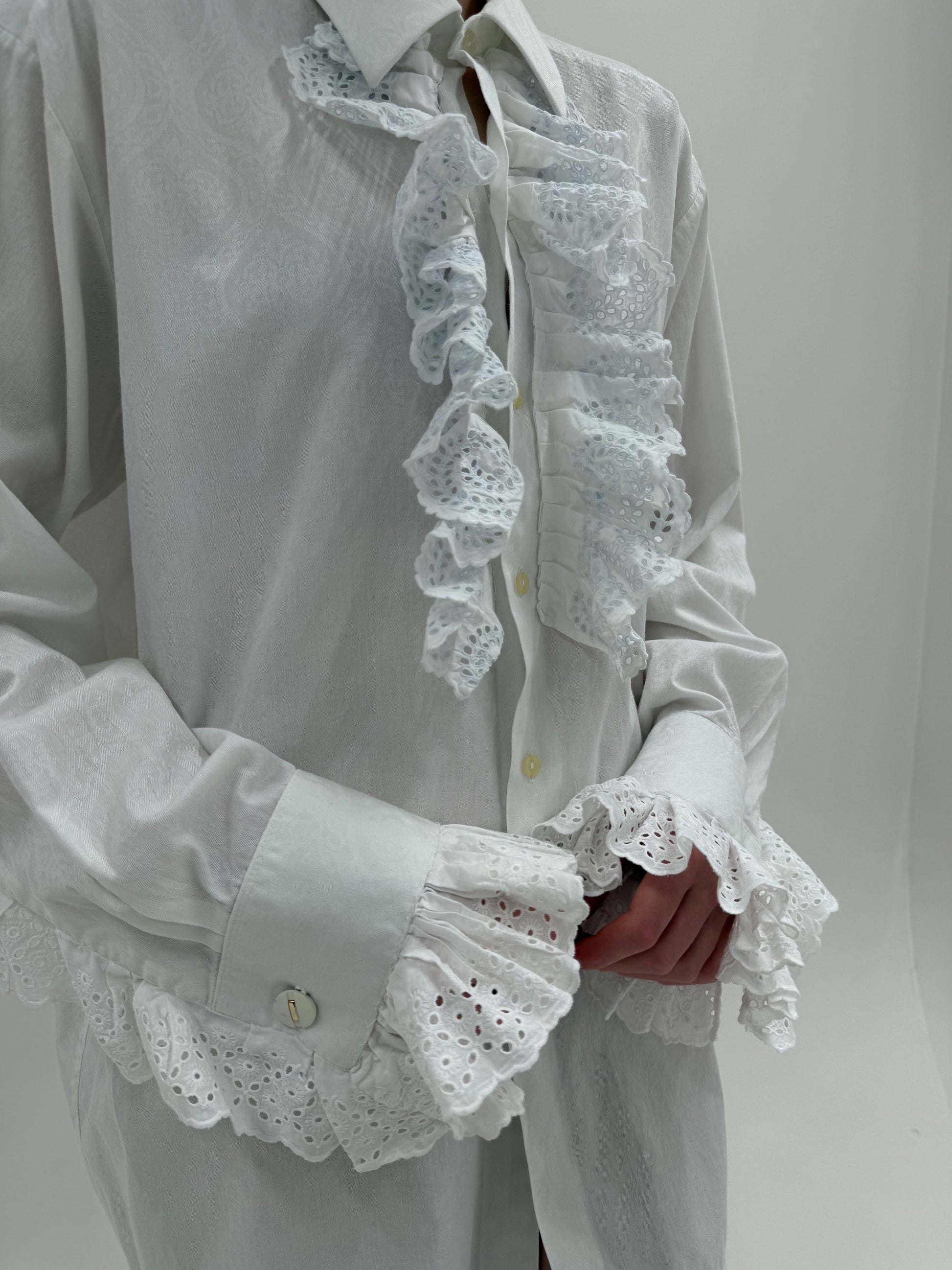Cămașa tall cu jabou cu inserții din dantelă cu manșete ultra înaltă și volane