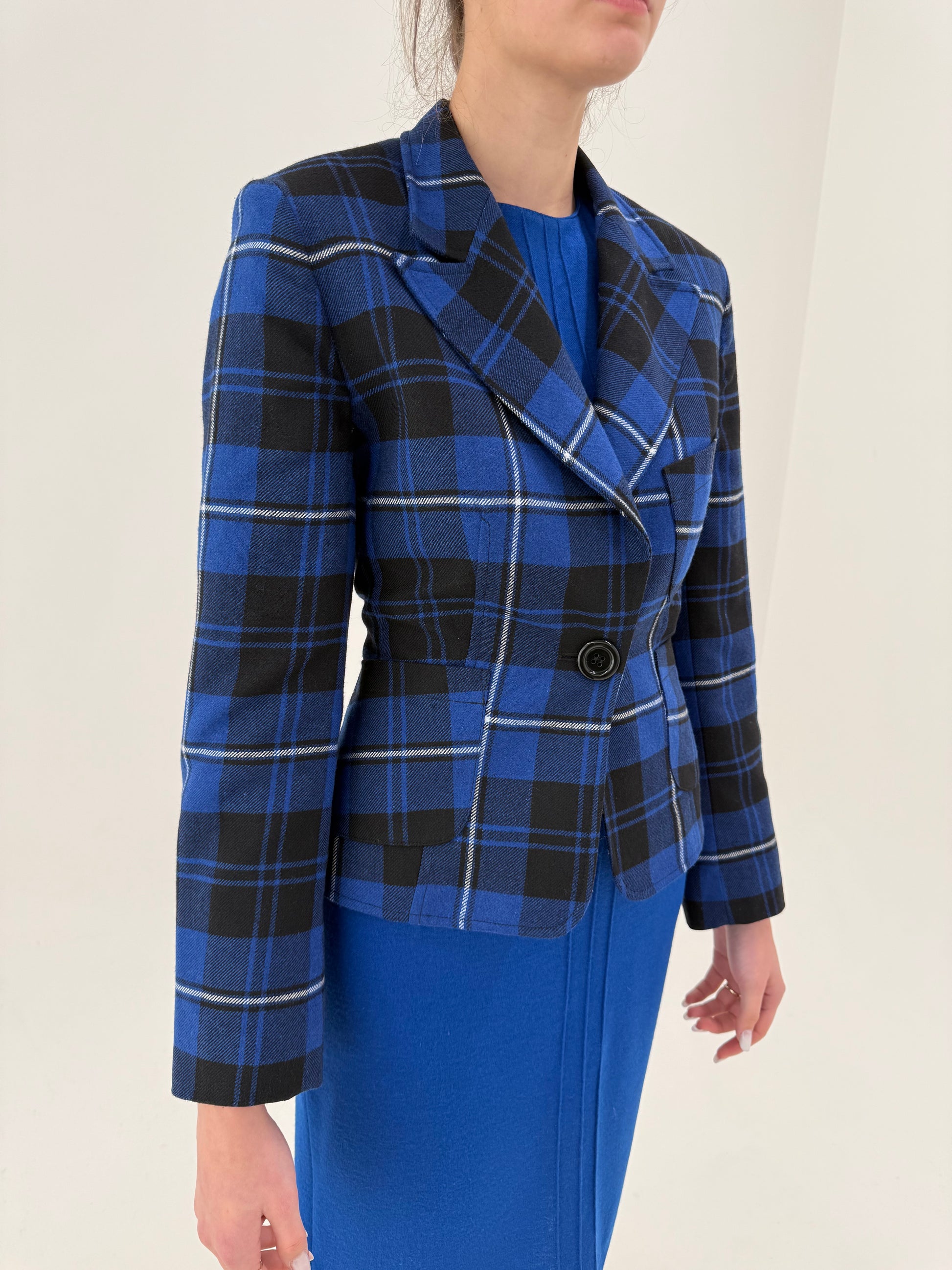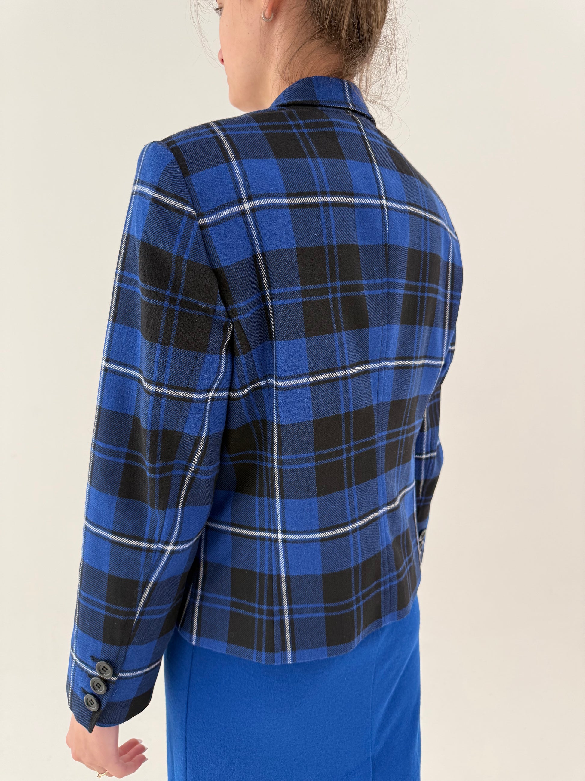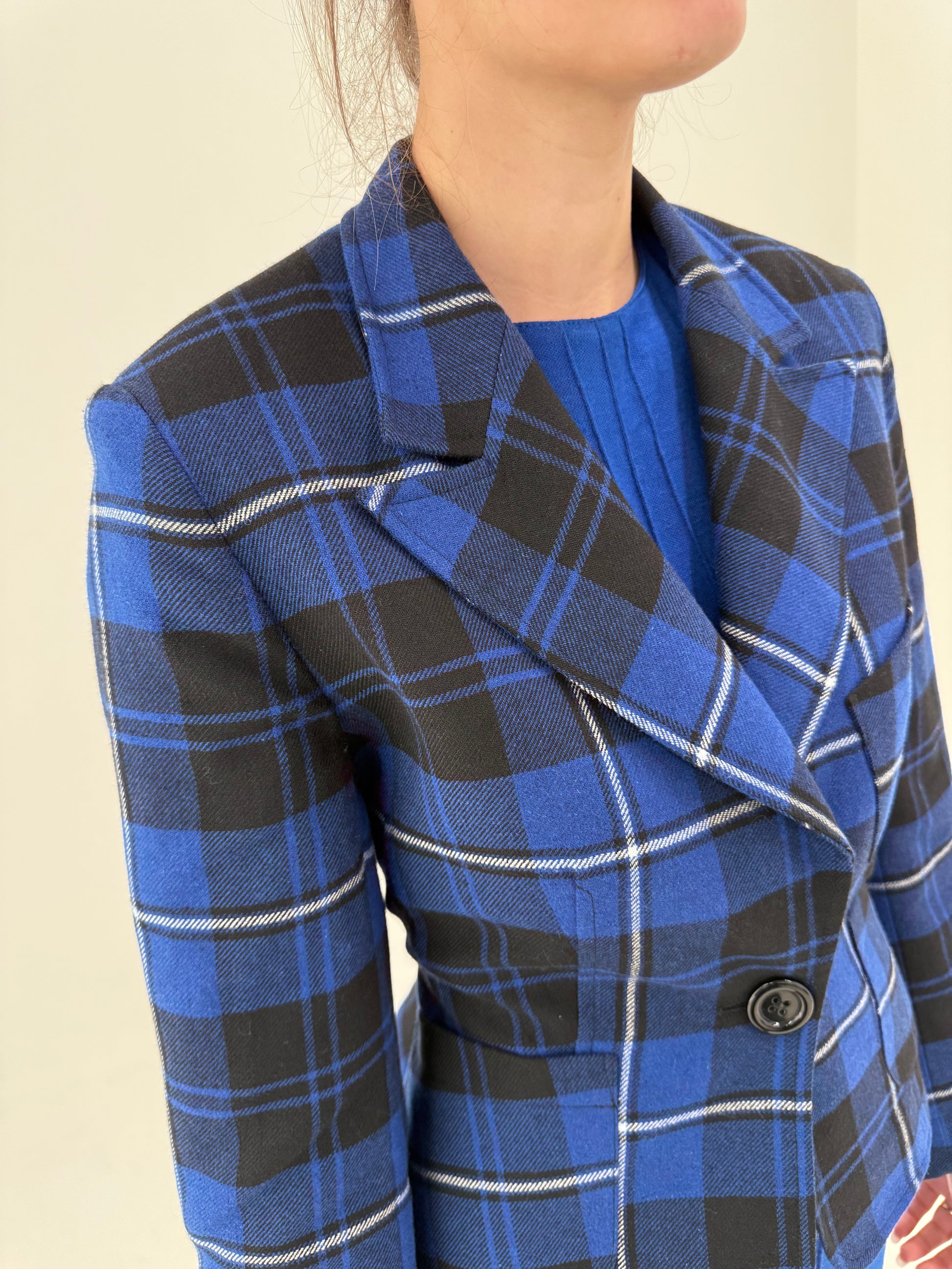 Sacou cambrat în carouri albastru regal din lana extrafina
