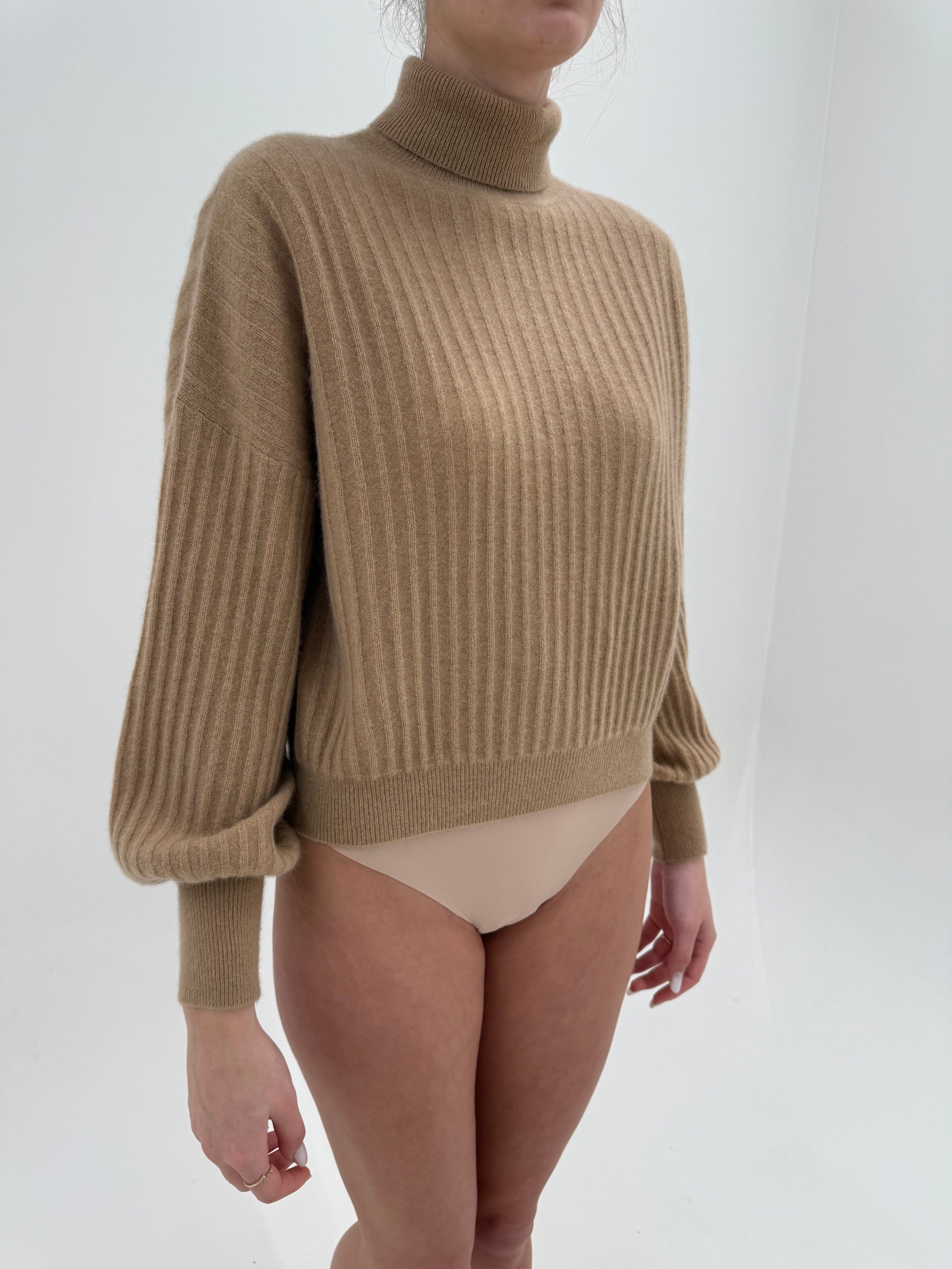 Maleta camel din cașmir excepțional ribbed cu mânecă amplă și manșete ultra înalte