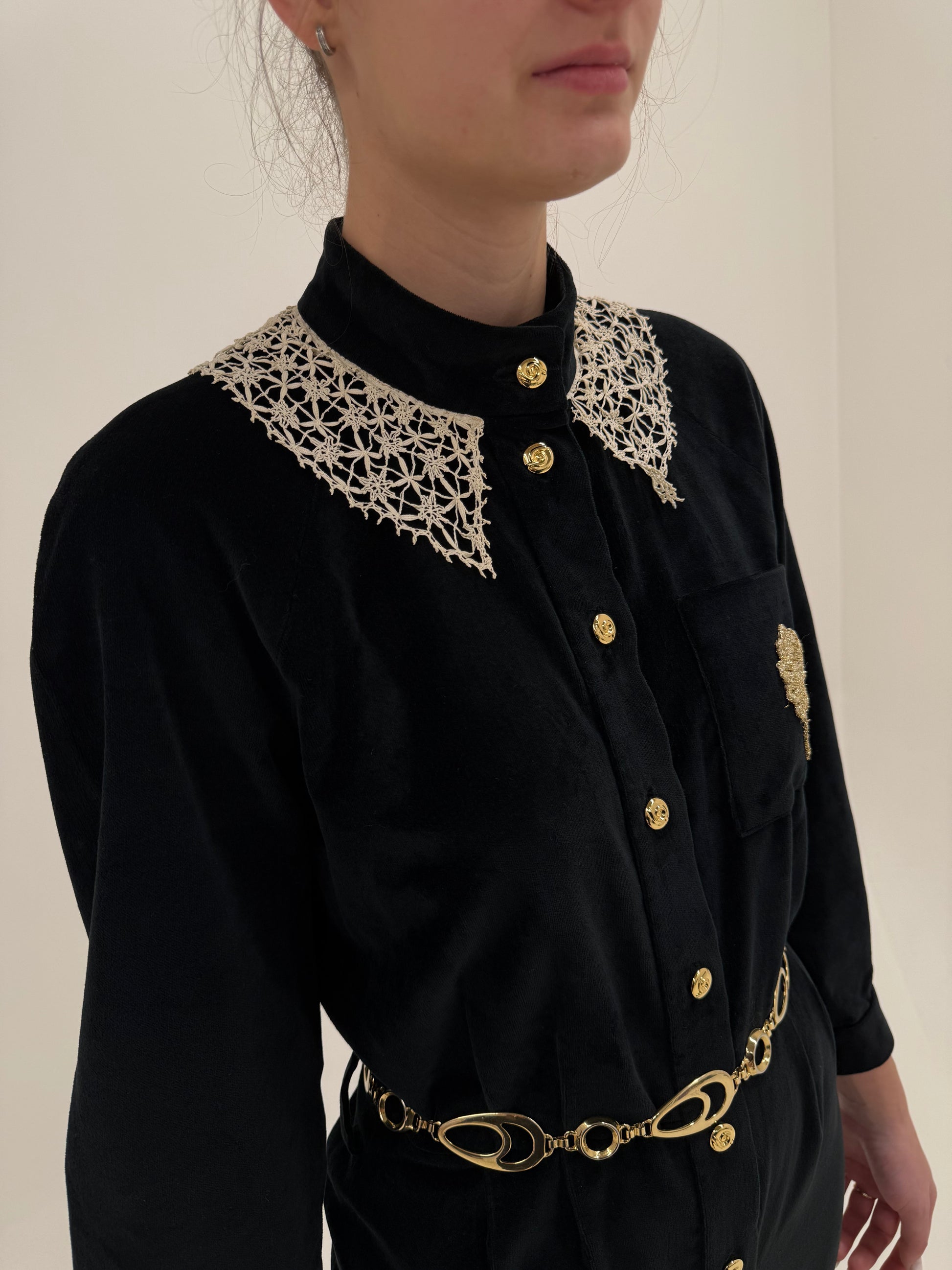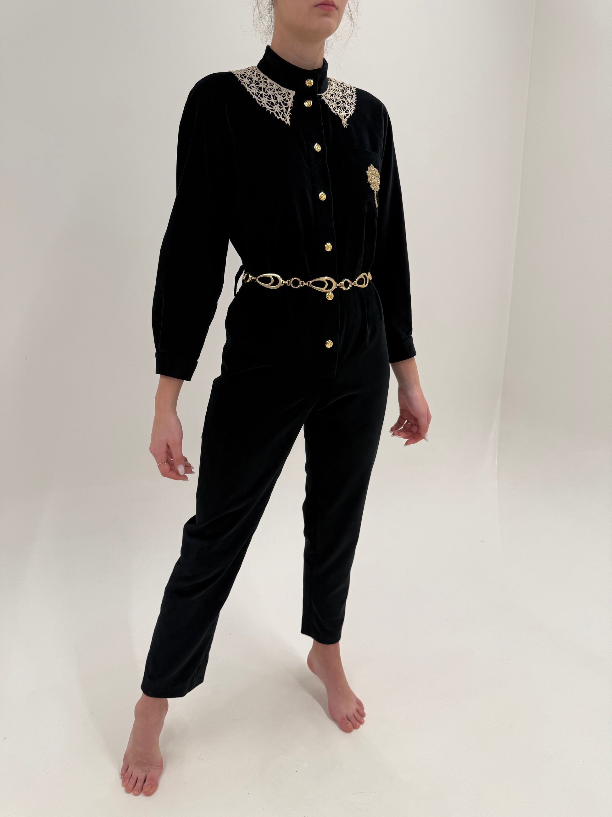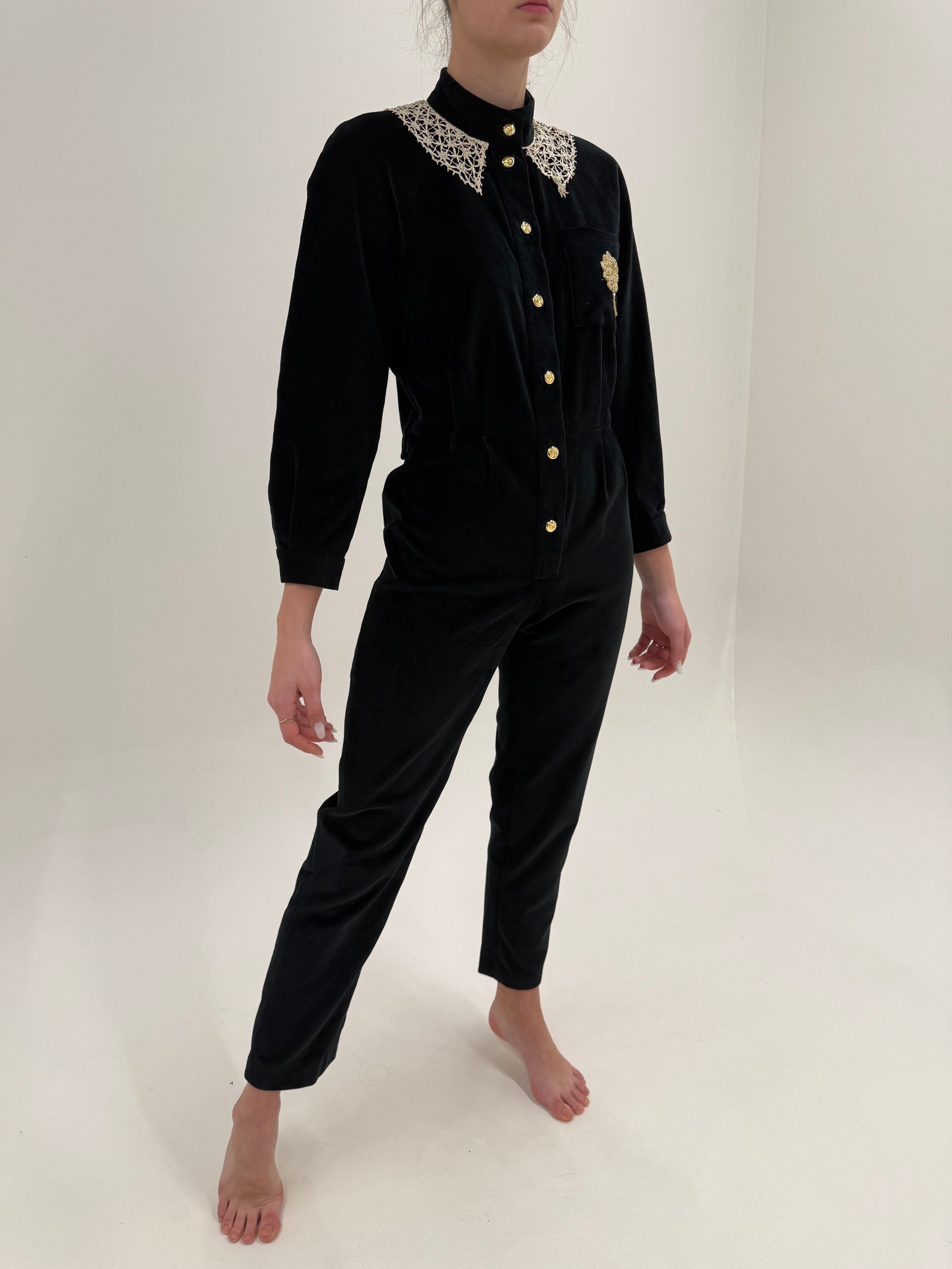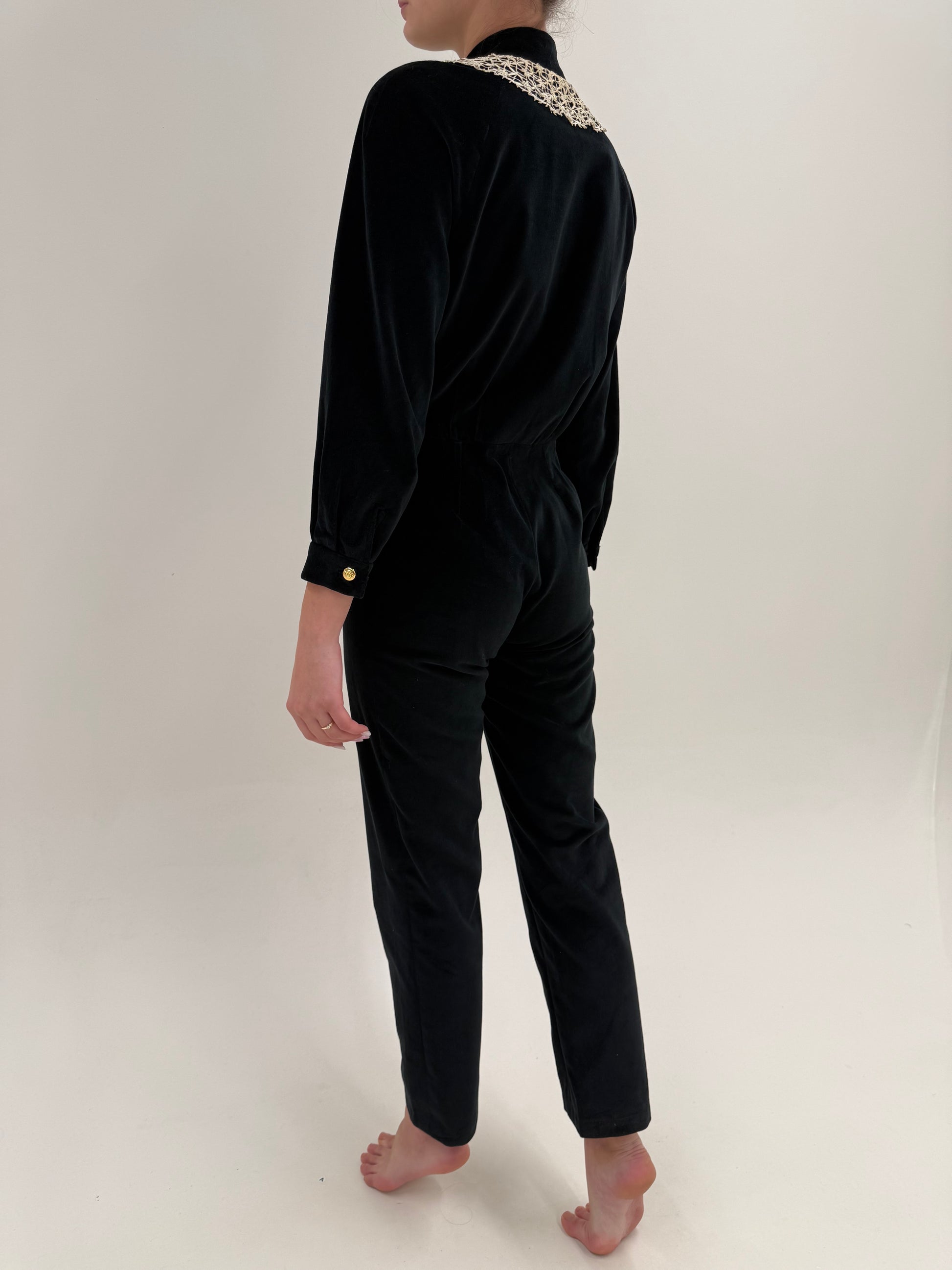 Salopetă vintage neagră tall de la zi la seară din catifea cu guler macrame lucrat manual