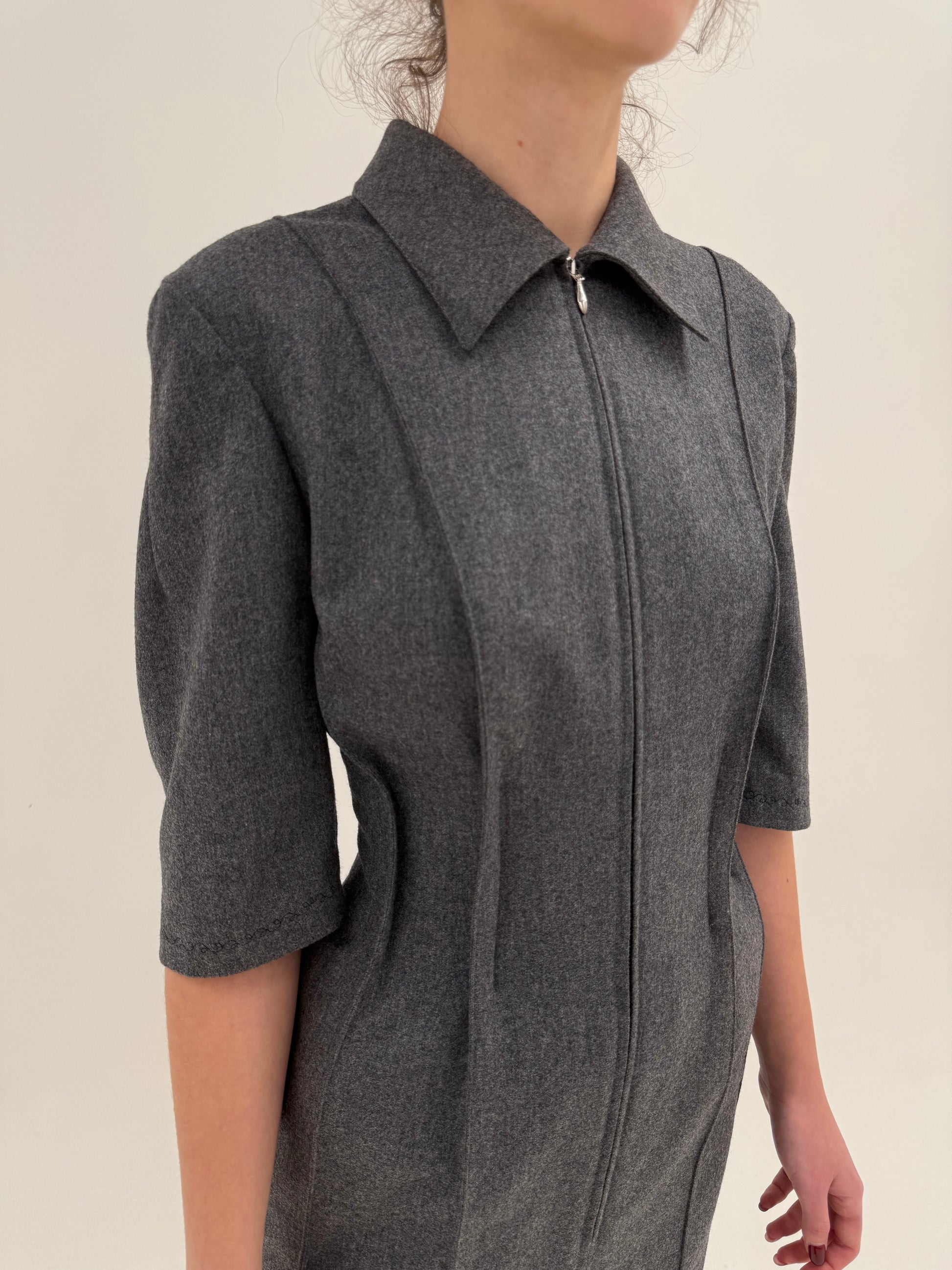 Silueta este definită prin pense exterioare vizibile, un detaliu rar și sofisticat, subliniază talia și alungește optic linia corpului