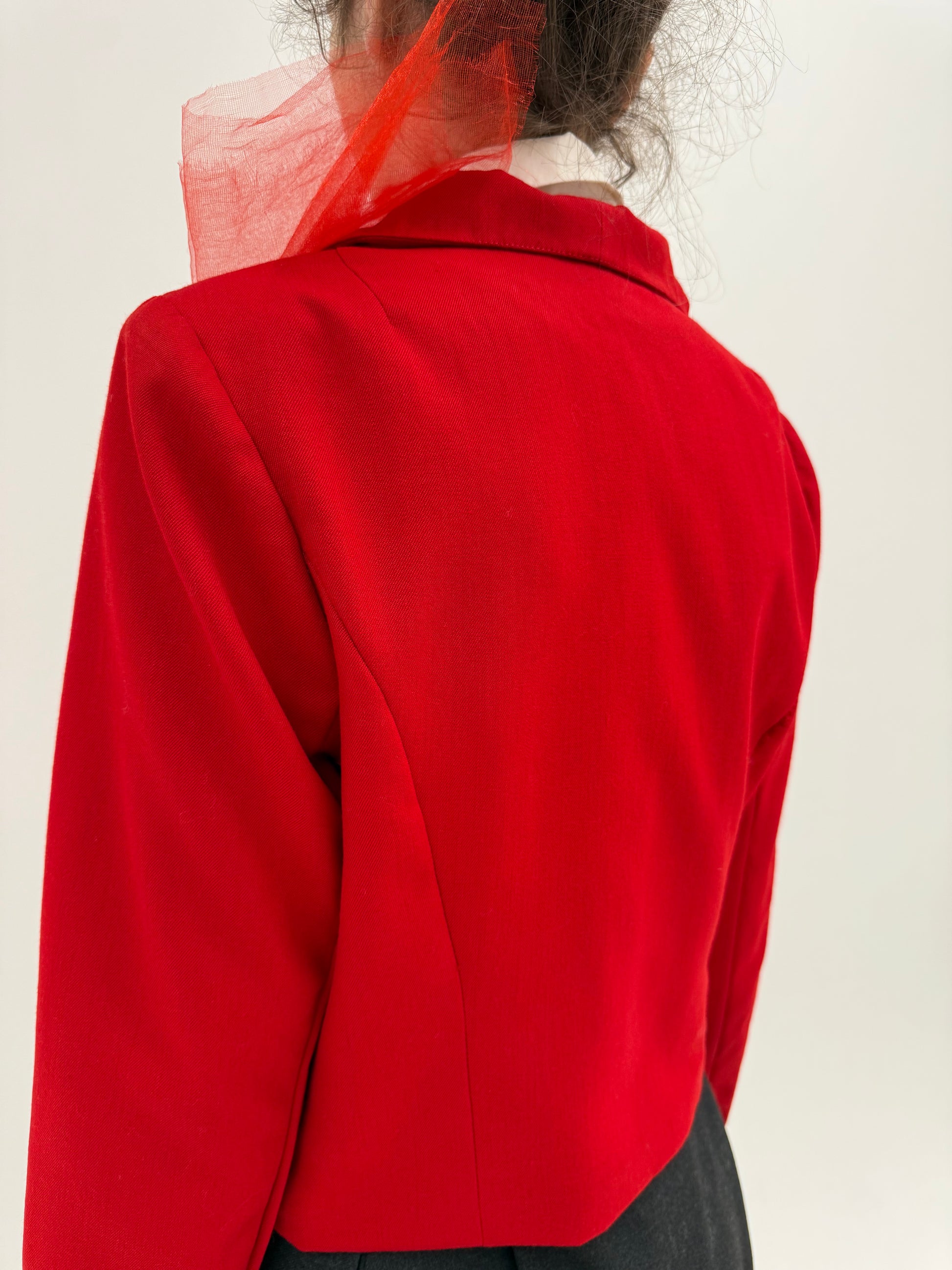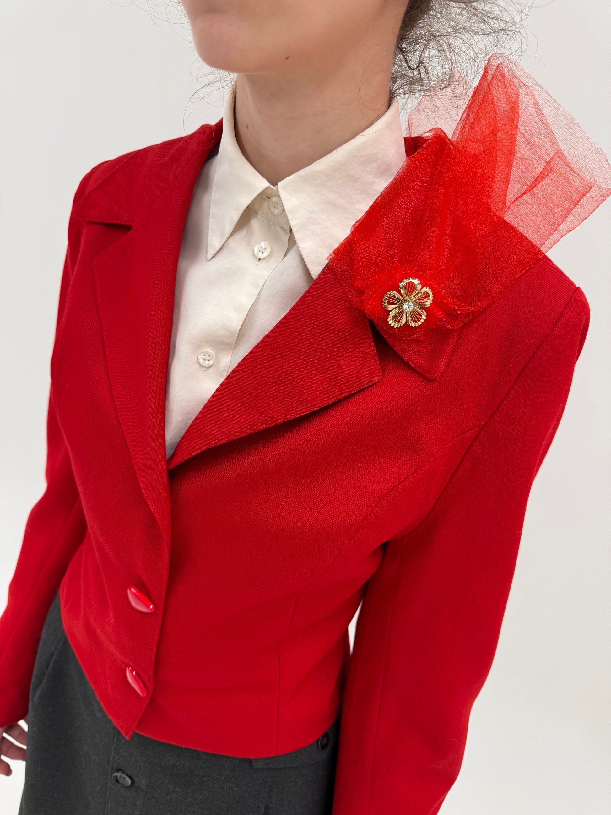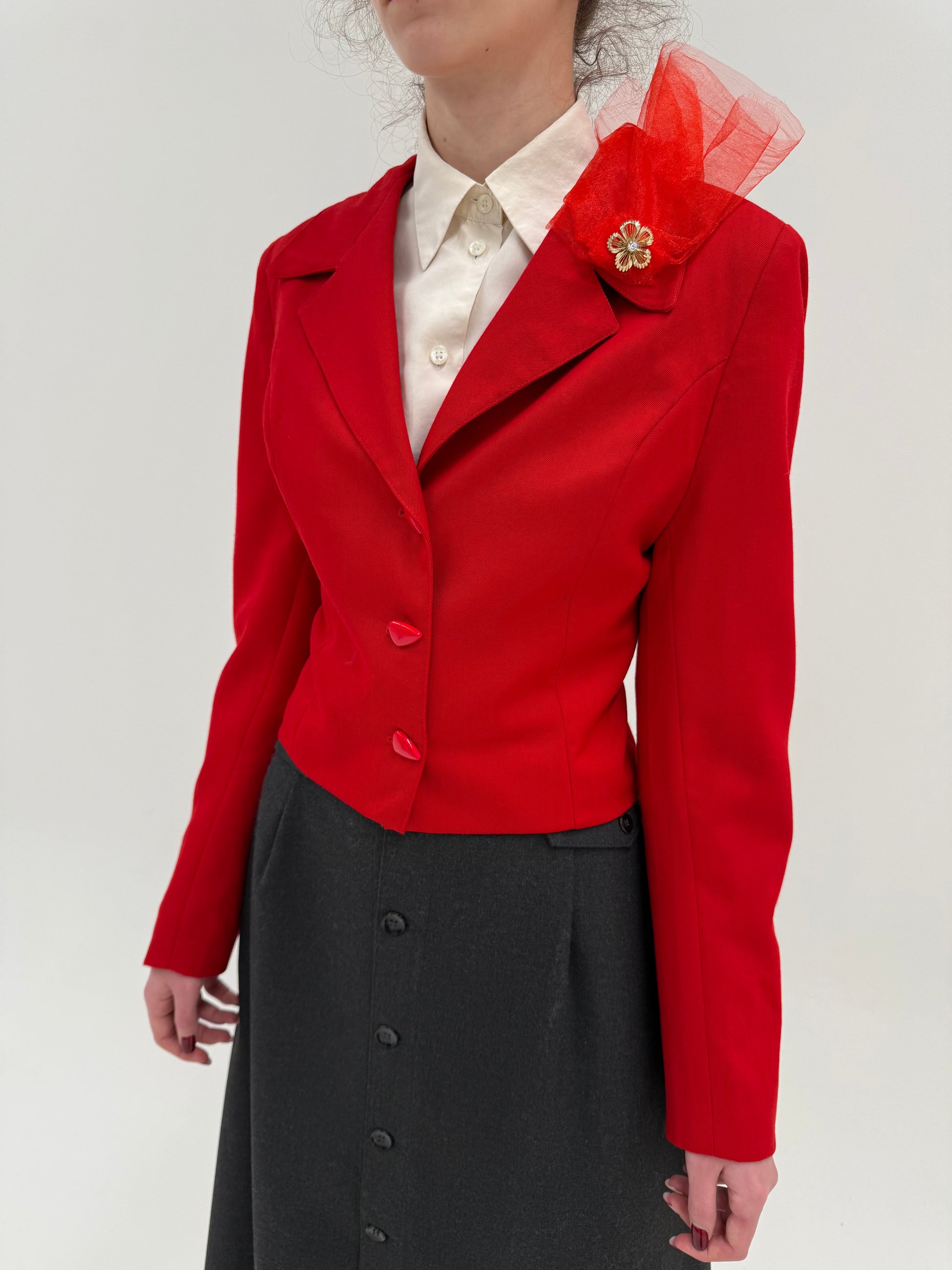 Sacou vintage roșu tare cambrat din lana extrafina cu broșă inclusă
